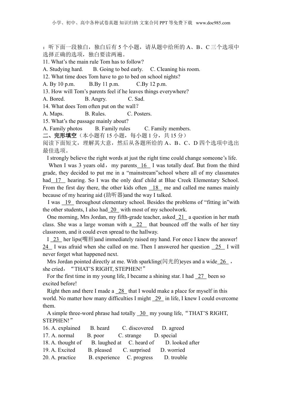 小学、初中、高中各种试卷真题知识归纳文案合同PPT等免费下载www.doc985.com2016湖州中考英语试卷卷Ⅰ考生须知:1.全卷分试卷和答题卷两部分,试卷共8页,答题卷共2页。全卷满分为100分,考试时间为100分钟。2.试卷分卷Ⅰ和卷Ⅱ两部分,卷Ⅰ中试卷(1-66小题)的答案填涂在答卷上,卷Ⅱ中试题的答案写在答题卷相应的位置上,写在试卷上无效。说明:本卷共六大题,66小题,满分76分。一、听力(本题有15小题,其中1—10小题每题1分,11—15小题每题2分,共20分)注意:听力共分三节,答题时,请先将答案标在试卷上,听力部分结束后,请将答案转涂到客观题答题卷上。听每段对话或独白前,你都有五秒钟时间阅读这一小题,听完后你将有五秒钟时间回答这一小题。第一节:听下面的对话,每段对话后有1个小题,请从题中所给的A、B、C三个选项中选择正确的选项,每段对话仅读一遍。1.Whenwillthemangivethereport?A.NextSunday.B.NextMonday.C.NextFriday.2.WhatdoesLindalikeabouttherestaurant?A.Thefood.B.Theservice.C.Theenvironment.3.Whowenttothemoviewiththewoman?A.Hersister.B.Herbrother.C.Hercousin.4.WhyisthemangoingtoLondon?A.Toworkthere.B.TovisitafriendC.Tohaveavacation.5.WherearethespeakersgoingtonextSunday?A.Tothepark.B.Tothezoo.C.Tothemuseum.第二节:听下面两段较长对话,每段对话后有2至3个小题,请从题中所给的A、B、C、三个选项中选择正确的选项,每段对话读两遍。请听下面一段较长对话,回答6—7小题。6.WhereisDaisyatthemoment?A.Intheschool.B.Onabus.C.Atabusstop.7.HowmightDaisygohome?A.Bytaxi.B.Bycar.C.Onfoot.请听下面一段较长对话,回答8—10小题。8.WhatdoyouknowaboutSam?A.Heislazy.B.Heisimpolite.C.Heiscareless.9.WheremaySamfindhisglasses?A.Inthebathroom.B.Inthelivingroom.C.Inthebedroom.10.What’stherelationshipbetweenthespeaker?A.Motherandson.B.Teacherandstudent.C.Wifeandhusband.小学、初中、高中各种试卷真题知识归纳文案合同PPT等免费下载www.doc985.com:听下面一段独白,独白后有5个小题,请从题中给所的A、B、C三个选项中选择正确的选项,独白要读两遍。11.What’sthemainruleTomhastofollow?A.Studyinghard.B.Goingtobedearly.C.Cleaninghisroom.12.WhattimedoesTomhavetogotobedonschoolnights?A.By10p.m.B.By11p.m.C.By12p.m.13.HowwillTom’sparentsfeelifheleavesthingseverywhere?A.Bored.B.Angry.C.Sad.14.WhatdoesTomoftenputonthewall?A.Maps.B.Rules.C.Posters.15.What’sthepassagemainlyabout?A.FamilyphotosB.FamilyrulesC.Familymembers.二、完形填空(本小题有15小题,每小题1分,共15分)阅读下面短文,理解其大意,然后从各题所给的A、B、C、D四个选项中选出最佳选项。Istronglybelievetherightwordsatjusttherighttimecouldchangesomeone’slife.WhenIwas3yearsold,myparents16Iwastotallydeaf.Butfromthethirdgrade,theydecidedtoputmeina“mainstream”schoolwhereallofmyclassmateshad17hearing.SoIwastheonlydeafchildatBlueCreekElementarySchool.Fromthefirstdaythere,theotherkidsoften18meandcalledmenamesmainlybecauseofmyhearingaid(助听器)andthewayItalked.Iwas19throughoutelementaryschool.Besidestheproblemsof“fittingin”withtheotherstudents,Ialsohad20withmostofmyschoolwork.Onemorning,MrsJordan,myfifth-gradeteacher,asked21aquestioninhermathclass.Shewasalargewomanwitha22thatbouncedoffthewallsofhertinyclassroom,anditcouldevenspreadtothehallway.I23herlips(嘴唇)andimmediatelyraisedmyhand.ForonceIknewtheanswer!24Iwasafraidwhenshecalledonme.ThenIansweredherquestion25Iwillneverforgetwhathappenednext.MrsJordanpointeddirectlyatme.Withsparkling(闪光的)eyesandawide26,shecried,“THAT’SRIGHT,STEPHEN!”Forthefirsttimeinmyyounglife,Ibecameashiningstar.Ihad27beensoexcitedbefore!RightthenandthereImadea28thatIwouldmakeaplacef...