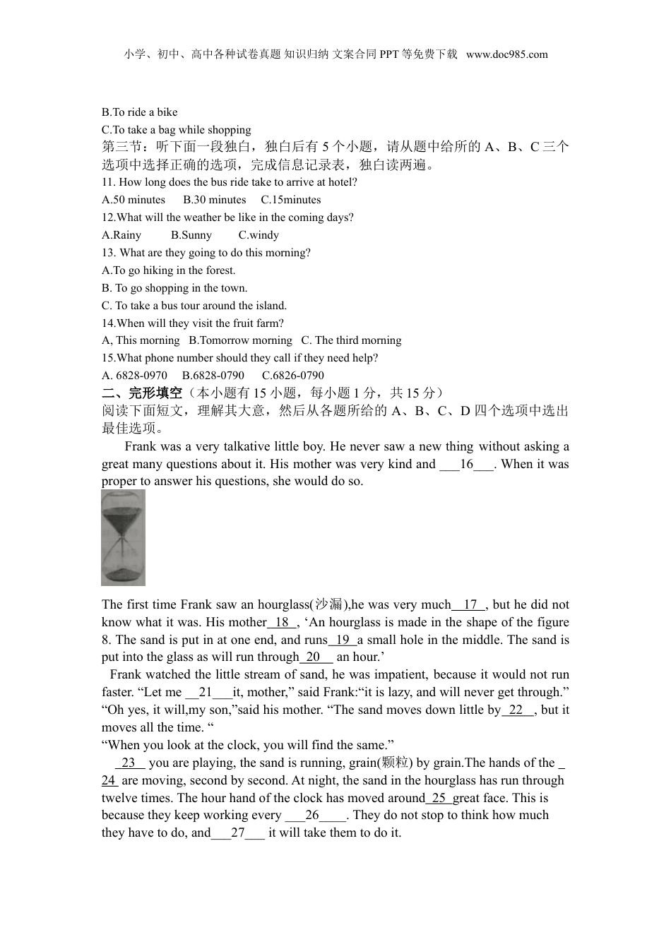 小学、初中、高中各种试卷真题知识归纳文案合同PPT等免费下载www.doc985.com2015湖州中考英语试卷卷Ⅰ考生须知:1.全卷分试卷和答题卷两部分,试卷共8页,答题卷共2页。全卷满分为100分,考试时间为100分钟。2.试卷分卷Ⅰ和卷Ⅱ两部分,卷Ⅰ中试卷(1-66小题)的答案填涂在答卷上,卷Ⅱ中试题的答案写在答题卷相应的位置上,写在试卷上无效。说明:本卷共六大题,66小题,满分76分。一、听力(本题有15小题,其中1—10小题每题1分,11—15小题每题2分,共20分)注意:听力共分三节,答题时,请先将答案标在试卷上,听力部分结束后,请将答案转涂到客观题答题卷上。听每段对话或独白前,你都有五秒钟时间阅读这一小题,听完后你将有五秒钟时间回答这一小题。第一节:听下面的对话,每段对话后有1个小题,请从题中所给的A、B、C三个选项中选择正确的选项,每段对话仅读一遍。1.WhatcolourisBill’sshirt?A.BlueB.BlackC.White2.HowdoesDavidusuallygotoschool?A.BybikeB.OnfootC.Bybus3.Whereisthewomangoing?A.TothecinemaB.TothelibraryC.Tothemuseum4.HowmanytimeshasCarlbeentoGuilin?A.OnceB.TwiceC.never5.WhatdoesJennywanttobe?A.AfarmerB.AteacherC.Anurse第二节:听下面两段较长对话,每段对话后有2至3个小题,请从题中所给的A、B、C、三个选项中选择正确的选项,每段对话读两遍。请听下面一段较长对话,回答6—7小题。6.Whowillthemanprobablybuybooksfor?A.Hisdaughter.B.HiswifeC.Hismother.7.Howmuchwillbehepayifhebuystwobooks?A.4dollarsB.8dollars.C.16dollars听下面一段较长对话,回答8—10小题。8.Whataretheytalkingabout?A.Howtogotoschool.B.Howtosavetheenvironment.C.Howtorecyclewastepaper.9.Howmanywaysdidtheytalkabout?A.Two.B.ThreeC.Four10.WhatwillTommytellhisparentstodo?A.Tosavemoney小学、初中、高中各种试卷真题知识归纳文案合同PPT等免费下载www.doc985.comB.TorideabikeC.Totakeabagwhileshopping第三节:听下面一段独白,独白后有5个小题,请从题中给所的A、B、C三个选项中选择正确的选项,完成信息记录表,独白读两遍。11.Howlongdoesthebusridetaketoarriveathotel?A.50minutesB.30minutesC.15minutes12.Whatwilltheweatherbelikeinthecomingdays?A.RainyB.SunnyC.windy13.Whataretheygoingtodothismorning?A.Togohikingintheforest.B.Togoshoppinginthetown.C.Totakeabustouraroundtheisland.14.Whenwilltheyvisitthefruitfarm?A,ThismorningB.TomorrowmorningC.Thethirdmorning15.Whatphonenumbershouldtheycalliftheyneedhelp?A.6828-0970B.6828-0790C.6826-0790二、完形填空(本小题有15小题,每小题1分,共15分)阅读下面短文,理解其大意,然后从各题所给的A、B、C、D四个选项中选出最佳选项。Frankwasaverytalkativelittleboy.Heneversawanewthingwithoutaskingagreatmanyquestionsaboutit.Hismotherwasverykindand___16___.Whenitwaspropertoanswerhisquestions,shewoulddoso.ThefirsttimeFranksawanhourglass(沙漏),hewasverymuch17,buthedidnotknowwhatitwas.Hismother18,‘Anhourglassismadeintheshapeofthefigure8.Thesandisputinatoneend,andruns19asmallholeinthemiddle.Thesandisputintotheglassaswillrunthrough20anhour.’Frankwatchedthelittlestreamofsand,hewasimpatient,becauseitwouldnotrunfaster.“Letme__21___it,mother,”saidFrank:“itislazy,andwillnevergetthrough.”“Ohyes,itwill,myson,”saidhismother.“Thesandmovesdownlittleby22,butitmovesallthetime.““Whenyoulookattheclock,youwillfindthesame.”23youareplaying,thesandisrunning,grain(颗粒)bygrain.Thehandsofthe24aremoving,secondbysecond.Atnight,thesandinthehourglasshasrunthroughtwelvetimes.Thehourhandoftheclockhasmovedaround25greatface.Thisisbecausetheykeepworkingevery___26____.Theydonotstoptothinkhowmuchtheyhavetodo,and___27___itwilltakethemtodoit.小学、初中、高中各种试卷真题知识归纳文案合同PPT等免费下载...