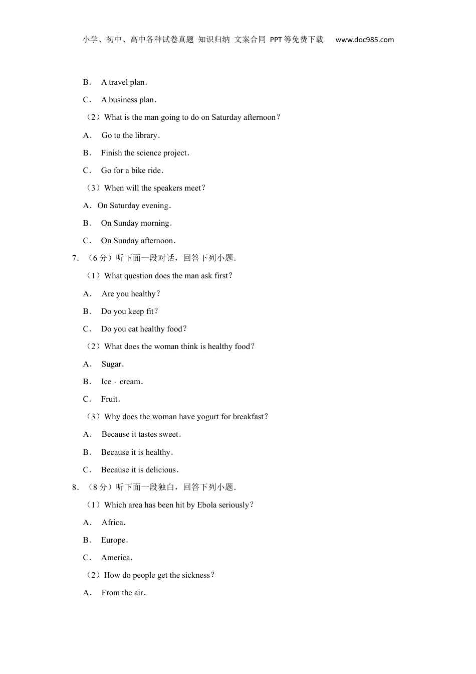 小学、初中、高中各种试卷真题知识归纳文案合同PPT等免费下载www.doc985.com浙江省杭州市2020年中考英语试卷第一部分听力(共两节,满分10分)第一节(共5小题,每小题2分,满分10分)1.(2分)Wheredoesthewomanwanttogo?A.Abusstop.B.LongStreet.C.TheArtMuseum.2.(2分)Whowillthewomanmeettonight?A.JamesBond.B.Tom.C.Ella.3.(2分)Whattimeisitnow?A.2:00.B.9:00.C.11:00.4.(2分)Wheredoestheconversationprobablytakeplace?A.Ataclothesshop.B.Atarestaurant.C.Atabank.5.(2分)Whatdoesthewomanmean?A.Theycaneatnow.B.Theyhavetowail.C.Theyarrivelate.第二节(共3小题,每小题6分,满分20分)听下面3段对话或独白.每段对话或独白后有几个小题,从题中所给的A.B、C三个选项中选出最佳选项,并标在试卷的相应位置.听每段对话或独白前,你有时间阅读各小题,每小题5秒钟.听完后,各小题将给出5秒钟的作答时间.每段对话或独白读两遍.6.(6分)听下面一段对话,回答下列小题.(1)Whatarethetwospeakerstalkingabout?A.Aweekendplan.小学、初中、高中各种试卷真题知识归纳文案合同PPT等免费下载www.doc985.comB.Atravelplan.C.Abusinessplan.(2)WhatisthemangoingtodoonSaturdayafternoon?A.Gotothelibrary.B.Finishthescienceproject.C.Goforabikeride.(3)Whenwillthespeakersmeet?A.OnSaturdayevening.B.OnSundaymorning.C.OnSundayafternoon.7.(6分)听下面一段对话,回答下列小题.(1)Whatquestiondoesthemanaskfirst?A.Areyouhealthy?B.Doyoukeepfit?C.Doyoueathealthyfood?(2)Whatdoesthewomanthinkishealthyfood?A.Sugar.B.Icecream﹣.C.Fruit.(3)Whydoesthewomanhaveyogurtforbreakfast?A.Becauseittastessweet.B.Becauseitishealthy.C.Becauseitisdelicious.8.(8分)听下面一段独白,回答下列小题.(1)WhichareahasbeenhitbyEbolaseriously?A.Africa.B.Europe.C.America.(2)Howdopeoplegetthesickness?A.Fromtheair.小学、初中、高中各种试卷真题知识归纳文案合同PPT等免费下载www.doc985.comB.Fromthewater.C.Fromtouching.(3)Howlongwillittakethefastestpeopletofinishthewalk?A.Threehours.B.Fourhours.C.Sixhours.(4)Whatisthepurposeofthistalk?A.Todosomethingforthecommunity.B.ToraisemoneytofightEbola.C.Toorganizeasportsactivity.第二部分阅读理解(共两节,满分30分)第一节(共4小题,每小题6分,满分30分)阅读下列短文,从每题所给的四个选项(A、B、C和D)中选出最佳选项.9.(6分)Doyoubelieveingreenliving?Readthefollowingblog(博客)andrepliesaboutafun,easyandcreativewaytomakeyourlifestylegreener.PostedbyGinaat8:32a.m.onl1thFebruary2018NewusesforoldclothingNowadays,we'remorewastefulthaneverbuying,usingandthrowingthingsawaywithoutthinkingaboutthecosts.Weneedtostartlivingmoreresponsibly一buthow?Oneansweristoupcycle(再生利用).Ifyou'relikeme,youmightalreadymakesoilforgardeningfromfoodwasteanduseemptypaperboxesasstoragespace.Didyouknowyoucanapply(应用)thesamewaytooldclothing?Youjustneedimagination!Istartedupcyclingclothing.Makingnewthingsoutofoldclothesisthebestwaytomixmytalentandmyinterest.Doyouupcycle?Ifso,whatnewthingshaveyoumade?Ifnot,whynotgiveitatry?小学、初中、高中各种试卷真题知识归纳文案合同PPT等免费下载www.doc985.comWhatdoyouthinkofthe"new"hatImadeformysister?Itusedtobemymum'ssweater.TerryBPostedat9:08a.m.on11thFebruary2018Whydon'tyougiveyouroldclothestopeopleinneed?IevengiveawaythemostexpensivethingsIdon'twearanymore.SoIcanhelptheenvironmentwhilegivingsomethingusefultopeopleinneed.GinaPostedat9:28a.m.on11thFebruary2018Goodpoint!I'mtalkinga...