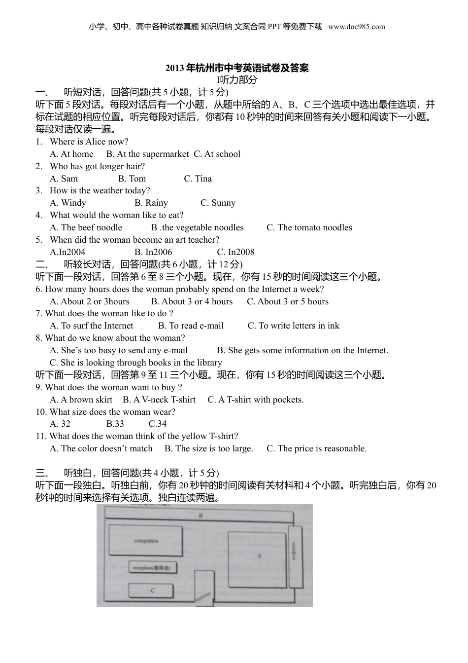 小学、初中、高中各种试卷真题知识归纳文案合同PPT等免费下载www.doc985.com2013年杭州市中考英语试卷及答案Ⅰ听力部分一、听短对话,回答问题(共5小题,计5分)听下面5段对话。每段对话后有一个小题,从题中所给的A、B、C三个选项中选出最佳选项,并标在试题的相应位置。听完每段对话后,你都有10秒钟的时间来回答有关小题和阅读下一小题。每段对话仅读一遍。1.WhereisAlicenow?A.AthomeB.AtthesupermarketC.Atschool2.Whohasgotlongerhair?A.SamB.TomC.Tina3.Howistheweathertoday?A.WindyB.RainyC.Sunny4.Whatwouldthewomanliketoeat?A.ThebeefnoodleB.thevegetablenoodlesC.Thetomatonoodles5.Whendidthewomanbecomeanartteacher?A.In2004B.In2006C.In2008二、听较长对话,回答问题(共6小题,计12分)听下面一段对话,回答第6至8三个小题。现在,你有15秒的时间阅读这三个小题。6.HowmanyhoursdoesthewomanprobablyspendontheInternetaweek?A.About2or3hoursB.About3or4hoursC.About3or5hours7.Whatdoesthewomanliketodo?A.TosurftheInternetB.Toreade-mailC.Towritelettersinink8.Whatdoweknowaboutthewoman?A.She’stoobusytosendanye-mailB.ShegetssomeinformationontheInternet.C.Sheislookingthroughbooksinthelibrary听下面一段对话,回答第9至11三个小题。现在,你有15秒的时间阅读这三个小题。9.Whatdoesthewomanwanttobuy?A.AbrownskirtB.AV-neckT-shirtC.AT-shirtwithpockets.10.Whatsizedoesthewomanwear?A.32B.33C.3411.WhatdoesthewomanthinkoftheyellowT-shirt?A.Thecolordoesn’tmatchB.Thesizeistoolarge.C.Thepriceisreasonable.三、听独白,回答问题(共4小题,计5分)听下面一段独白。听独白前,你有20秒钟的时间阅读有关材料和4个小题。听完独白后,你有20秒钟的时间来选择有关选项。独白连读两遍。小学、初中、高中各种试卷真题知识归纳文案合同PPT等免费下载www.doc985.com12.Wherecanthelisternersfindgrammarbooks?A.AtAB.AtBC.AtC13.Whichofthefollowingisallowedtodointhelibrary?A.Drinkwater.B.UsetheCDsC.Borrowdictionaries14.Whatdoesthespeakersuggesttothelistenersattheend?A.Theycanturntohimforhelp.B.TheycanstudyEnglishathome.C.Theycantakethemagazinesout.15.Whoisthespeakertalkingto?A.TeachesB.ParentsC.StudentsⅡ笔试部分四、单项填空(共15小题,计15分)从A、B、C、D四个选项中,选出可以填入空白处的最佳选项。13.Thephonetictranscriptionfortheword“breakfast”is________.A./'brekfɑ:st/B./'breikfəst/C./'brekfəst/D./'breikfɑ:st/14.Ithinkit’sreally_________hardworkformetofinishthejobintwentyminutes.A.aB.anC.theD.不填15.Hangzhouis_________tohundredsofforeignfriendswhoareworkingandstudyinghere.A.homeB.houseC.familyD.room16.It’smuch_________tohaveasmalllovelyroomthanabigcoldone.A.goodB.wellC.betterD.best17.Ithinkhe’sbeendrinking,_________I’mnotcompletelysure.A.ifB.thoughC.untilD.as18.ThismorningI_________somenewrestaurantsontheInternetforIwantedtotakeMiatoanicerestaurantforherbirthday.A.pickedupB.lookedupC.cleanedupD.gaveup19.Sallytookaphotoofherfriendswhilethey_________computergames.A.playB.areplayingC.haveplayedD.wereplaying20.--Paulinehaslostherphone.–No.It’sinherbag.I_________hearit.A.mustB.canC.mayD.shall21.She’snotstrongenough_________walkingupmountains.A.togoB.goingC.goD.went22.Beingblindissomething_________mostpeoplecan’timagine.A.whoB.whatC.thatD.whom23.Therehasneverbeensuchabeautifulvillage_________intheworld.A.anywhereB.everywhereC.somewhereD.nowhere24.Idon’tunderstand_________thateverything’sfinewhenit’snot.A.howcanhesayB.canhesayhowC.hecansayhowD.howhecansay25.IthinkIshouldbeallowedtomakedecisions_________myself.A.withB.toC.forD.against小学、初中、高中各种试卷真题知识归纳文案合同PPT...