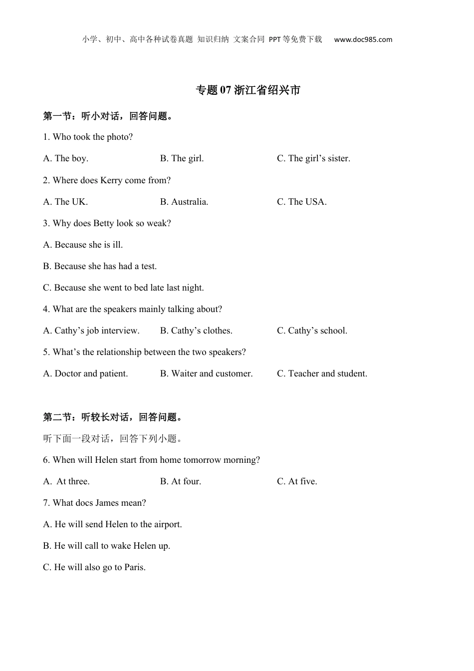 小学、初中、高中各种试卷真题知识归纳文案合同PPT等免费下载www.doc985.com专题07浙江省绍兴市第一节:听小对话,回答问题。1.Whotookthephoto?A.Theboy.B.Thegirl.C.Thegirl’ssister.2.WheredoesKerrycomefrom?A.TheUK.B.Australia.C.TheUSA.3.WhydoesBettylooksoweak?A.Becausesheisill.B.Becauseshehashadatest.C.Becauseshewenttobedlatelastnight.4.Whatarethespeakersmainlytalkingabout?A.Cathy’sjobinterview.B.Cathy’sclothes.C.Cathy’sschool.5.What’stherelationshipbetweenthetwospeakers?A.Doctorandpatient.B.Waiterandcustomer.C.Teacherandstudent.第二节:听较长对话,回答问题。听下面一段对话,回答下列小题。6.WhenwillHelenstartfromhometomorrowmorning?A.Atthree.B.Atfour.C.Atfive.7.WhatdocsJamesmean?A.HewillsendHelentotheairport.B.HewillcalltowakeHelenup.C.HewillalsogotoParis.小学、初中、高中各种试卷真题知识归纳文案合同PPT等免费下载www.doc985.com听下面一段对话,回答下列小题。8.WheredoesMikeworkinAfrica?A.Inahospital.B.Inaschool.C.Ataradiostation.9.Whocooksmealseveryday?A.Carol.B.Mike.C.Jim.10.HowdoesMikefeelaboutbeinginAfrica?A.Happy.B.Upset.C.Lucky.第三节:听独白,回答问题。11.HowwillthetouriststravelaroundLondon?A.Bybus.B.Onfoot.C.Byboat.12.What’stheweatherlikeatpresent?ACloudy.B.Sunny.C.Rainy.13.Howlongdoesthetourlast?A.Twohours.B.Threehours.C.Fivehours.14.Whichwillthetouristsseefirst?A.BigBen.B.OxfordStreet.C.TowerBridge.15.WhatcantouristsdonearthePalace?A.Enjoythewholecity.B.Dosomeshopping.C.Drinkafreecoffee.答案1-5CBCAB6-10BCBCA11-15ACABC录音原文小学、初中、高中各种试卷真题知识归纳文案合同PPT等免费下载www.doc985.com第一节:听小对话,回答问题。Text1M:Wow,that'sagreatphotodidyoutakeit?W:No,mysisterdid,shetookitfortheschoolnewspaper.Text2M:Excuseme,Kerry,areyoufromLondonorNewYork?W:Neither,I'mfromAustralia,butmygrandparentsareEnglish.Text3M:Goodmorning,Betty,youlooksoweak,whathappened?W:Nothing,Ijuststayeduplatelastnight,we'llhaveamathtesttoday,youknow.Text4M:Youlookgoodinthissuit,Kathy.Howdoesyourjobinterviewgotoday?W:Iamhopefulthistime.I'vefinishedmysecondinterviewwiththisschool.Text5M:EverythingOKwithyourmeal?W:Delicious,thankyou.M:Yes,great.M:Canwetakethebill?W:Ofcourse.第二节:听较长对话,回答问题。听下面一段对话,回答第6-7小题。Text6M:Hello,Helen!Lookatyoursmileonyourface,anygoodnews?W:Yes,James.OurclassisabouttoParisforforourschooltrip.M:Great!Howexciting!Whendoyouleavehome?W:Tomorrowmorningat5:00am.Ohno,at4:00am.M:Really?That'scrazy.Howwillyouwakeupthatearly?W:Idon’tknow.Ihopemumwillwakemeup.Hey,whynotjoinus?小学、初中、高中各种试卷真题知识归纳文案合同PPT等免费下载www.doc985.comM:Goodidea!It'llbefun.Countmein.听下面一段对话,回答第8-10小题。Text7W:GoodmorningandwelcometoRadioKent.Thismorningwe'retalkingaboutvolunteerwork.OnourphonelinewehaveMikefromCanterbury.RightnowheandhisfriendJimareinAfrica.W:MorningMike!M:Hi,Carol!W:WhatdoyoudothereinAfrica?M:Iworkasavolunteerinamedicalschool.IteachEnglishandmedicinehere.W:Andwhatareyoudoingrightnow?M:Iamhavingbreakfast.W:Doyoucookbreakfastyourself?M:No.Jimdoesiteveryday.Andlunchanddinnertoo.Wedoallourownhousework.W:Really?Andtellus,doyoulikebeingthereinAfrica?M:OhyesIloveit.I'mhavingagreattime.IamworkingwithwonderfulpeopleandI'mlearningalot.W:That'sgreatMike.Thanksforyourtime,M:It'smypleasure.Thanks!Haveagoodday.第三节:听独白,回答问题。Text8Goodafternoon,ladiesandgentlemen.WelcometothisfantastictourofLondon.MynameisGregandI'myourguide.Asyoucansee,weareonanopen-topbus,soyoucanseealltheplacesofinterestfromyourseatandyoudon'tneedtowalkanywhere.Andpleasedon'tworryabouttherain.I'msureit'llstopsoon.Well,thetourtakestwohoursandwewillprobablyfinishourtourat5:00,right?OK,sowherearewegoingonourwonderfultour?First,we'lldrivealongthemostfamousshoppingstreetintheworld,OxfordStreet.Afterthatwe'llsee小学、初中、高中各种试卷真题知识归纳文案合同PPT等免费下载www.doc985.comthefamousclockBigBen.Aswedrivealongtheriveryou'llseethetheLondonEye,fromwhichyoucanseethewholecityonasunnyday.Thenwe'llseeTowerBridgeandthefamousTowerofLondonbeforearrivingatBuckinghamPalace,There'salovelycafenearthepalacewhereyoucangetacupofcoffeeforfree.OK,nowanyquestions?