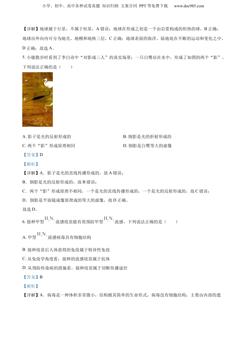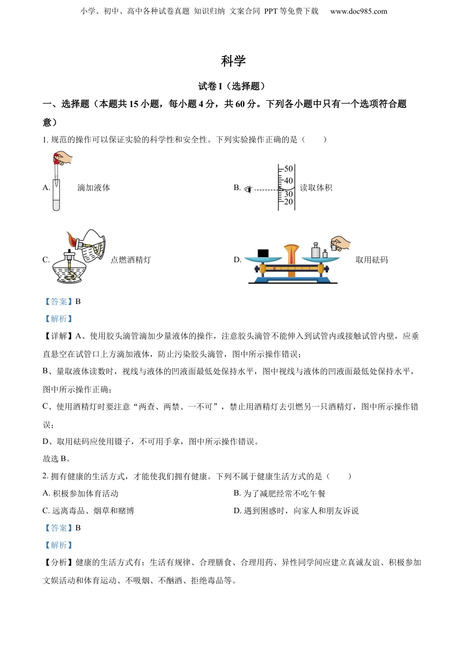 小学、初中、高中各种试卷真题知识归纳文案合同PPT等免费下载www.doc985.com科学试卷I(选择题)一、选择题(本题共15小题,每小题4分,共60分。下列各小题中只有一个选项符合题意)1.规范的操作可以保证实验的科学性和安全性。下列实验操作正确的是()A.滴加液体B.读取体积C.点燃酒精灯D.取用砝码【答案】B【解析】【详解】A、使用胶头滴管滴加少量液体的操作,注意胶头滴管不能伸入到试管内或接触试管内壁,应垂直悬空在试管口上方滴加液体,防止污染胶头滴管,图中所示操作错误;B、量取液体读数时,视线与液体的凹液面最低处保持水平,图中视线与液体的凹液面最低处保持水平,图中所示操作正确;C、使用酒精灯时要注意“两查、两禁、一不可”,禁止用酒精灯去引燃另一只酒精灯,图中所示操作错误;D、取用砝码应使用镊子,不可用手拿,图中所示操作错误。故选B。2.拥有健康的生活方式,才能使我们拥有健康。下列不属于健康生活方式的是()A.积极参加体育活动B.为了减肥经常不吃午餐C.远离毒品、烟草和赌博D.遇到困惑时,向家人和朋友诉说【答案】B【解析】【分析】健康的生活方式有:生活有规律、合理膳食、合理用药、异性同学间应建立真诚友谊、积极参加文娱活动和体育运动、不吸烟、不酗酒、拒绝毒品等。小学、初中、高中各种试卷真题知识归纳文案合同PPT等免费下载www.doc985.com【详解】ACD.积极参加体育活动、远离毒品、烟草和赌博、遇到困惑时,向家人和朋友诉说,都属于健康的生活方式,ACD不符合题意。B.为了减肥经常不吃午餐,会影响身体健康,属于不健康得生活习惯,B符合题意。故选B。3.生物体具有一定的结构层次。下列属于器官的是()A.熊猫B.泌尿系统C.胃D.精子【答案】C【解析】【分析】由几种不同的组织构成的,这些组织按一定的次序联合起来,形成具有一定功能的结构叫做器官。【详解】A.熊猫属于动物体,A不符合题意。B.泌尿系统属于系统,B不符合题意。C.胃属于消化器官,C符合题意。D.精子属于生殖细胞,D不符合题意。故选C。4.地球是人类赖以生存的家园。下列说法不合理的是()A.地球是太阳系中的一颗恒星B.地球在形成之初是一个由岩浆构成的炽热的球C.地球由外向内可分为地壳、地幔和地核三层D.地球表面的海洋、陆地处在不断的运动和变化之中【答案】A【解析】小学、初中、高中各种试卷真题知识归纳文案合同PPT等免费下载www.doc985.com【详解】地球属于行星,不属于恒星,A错误;地球在形成之初是一个由岩浆构成的炽热的球,B正确;地球由外向内可分为地壳、地幔和地核三层,C正确;地球表面的海洋、陆地处在不断的运动和变化之中,D正确;故选A。5.小敏散步时看到了李白诗中“对影成三人”的真实场景:一只白鹭站在水中,形成了如图的两个“影”。下列说法正确的是()A.影子是光的反射形成的B.倒影是光的折射形成的C.两个“影”形成原理相同D.倒影是白鹭等大的虚像【答案】D【解析】【详解】A.影子是光的直线传播形成的,故A错误;B.倒影是光的反射形成的,故B错误;C.两个“影”形成原理不相同,一个是光的直线传播形成的,一个是光的反射形成的,故C错误;D.倒影是平面镜成像原理成的等大的虚像,故D正确。故选D。6.接种甲型流感疫苗能有效预防甲型流感。下列说法正确的是()A.甲型流感病毒具有细胞结构B.接种疫苗后人体获得的免疫属于特异性免疫C.从免疫学角度看,接种的流感疫苗属于抗体D.从预防传染病的措施看,接种疫苗属于切断传播途径【答案】B【解析】【详解】A.病毒是一种体积非常微小,结构极其简单的生命形式,病毒没有细胞结构,主要由内部的遗小学、初中、高中各种试卷真题知识归纳文案合同PPT等免费下载www.doc985.com传物质和蛋白质外壳组成。所以,甲型流感病毒无细胞结构,故A错误;B.接种甲型流感疫苗后,体内产生相应的抗体,这属于特异性免疫,故B正确;C.从免疫角度分析,进入人体的甲型流感病毒能引起淋巴细胞产生抗体,属于抗原,故C错误;D.从预防传染病角度分析,给健康的人注射甲型流感疫苗属于保护易感人群,不是切断传播途径,故D错误。故选B。7.2023年5月10日,搭载天舟六号货运飞船的运载火箭成功...