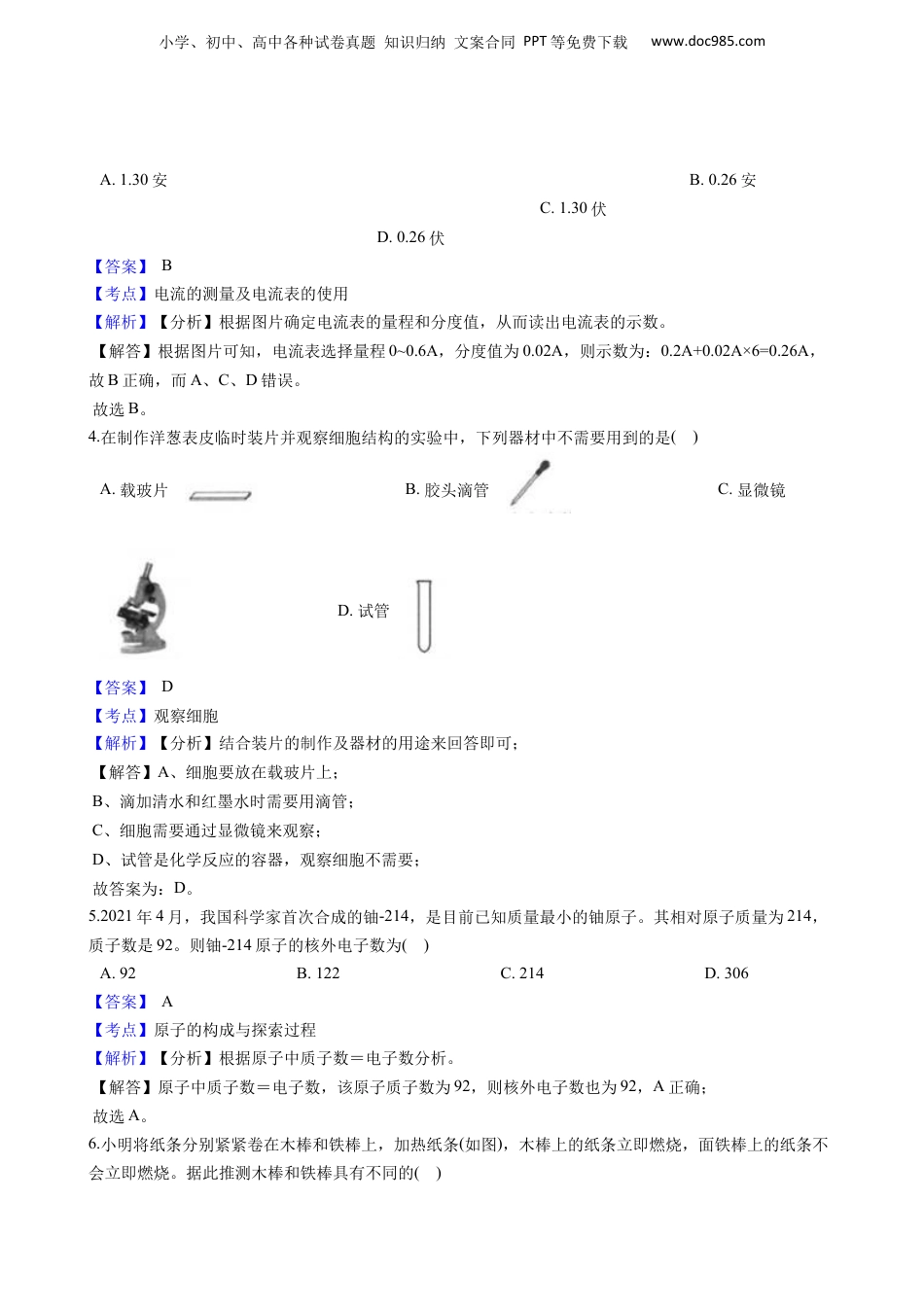 小学、初中、高中各种试卷真题知识归纳文案合同PPT等免费下载www.doc985.com浙江省温州市2021年中考科学试卷一、选择题(本题有15小题,每小题4分,共60分。每小题只有一个选项是正确的,不选、多选、错选均不给分)1.《汉书·地理志》记载了我国西北地区的一种地貌(如图),后在很多干旱地区也发现了类似地貌。形成这种地貌的主要外力因素是()A.流水B.风力C.冰川D.海浪【答案】B【考点】地形变化的原因【解析】【分析】外力作用主要是指地球表面受重力和太阳能的影响所产生的作用,包括物理、化学和生物的风化作用,流水作用,冰川作用,风力作用,波浪及海流作用等。【解答】干旱地区出现图中的地貌,由此可知,形成这种地貌的主要外力因素是风力;故答案为:B。2.氮化锶(Sr3N2)是生产高端荧光粉的主要原料。已知Sr3N2中N的化合价为-3,则Sr的化合价为()A.-3B.-2C.+2D.+3【答案】C【考点】元素化合价的规则与计算【解析】【分析】根据化合物中元素化合价代数和为0分析。【解答】Sr3N2中N的化合价为-3,设Sr元素化合价为x,则3x+(-3)×2=0,解得x=+2;故选C。3.用伏安法测电功率时,某电表的指针位置如图所示。其示数为()小学、初中、高中各种试卷真题知识归纳文案合同PPT等免费下载www.doc985.comA.1.30安B.0.26安C.1.30伏D.0.26伏【答案】B【考点】电流的测量及电流表的使用【解析】【分析】根据图片确定电流表的量程和分度值,从而读出电流表的示数。【解答】根据图片可知,电流表选择量程0~0.6A,分度值为0.02A,则示数为:0.2A+0.02A×6=0.26A,故B正确,而A、C、D错误。故选B。4.在制作洋葱表皮临时装片并观察细胞结构的实验中,下列器材中不需要用到的是()A.载玻片B.胶头滴管C.显微镜D.试管【答案】D【考点】观察细胞【解析】【分析】结合装片的制作及器材的用途来回答即可;【解答】A、细胞要放在载玻片上;B、滴加清水和红墨水时需要用滴管;C、细胞需要通过显微镜来观察;D、试管是化学反应的容器,观察细胞不需要;故答案为:D。5.2021年4月,我国科学家首次合成的铀-214,是目前已知质量最小的铀原子。其相对原子质量为214,质子数是92。则铀-214原子的核外电子数为()A.92B.122C.214D.306【答案】A【考点】原子的构成与探索过程【解析】【分析】根据原子中质子数=电子数分析。【解答】原子中质子数=电子数,该原子质子数为92,则核外电子数也为92,A正确;故选A。6.小明将纸条分别紧紧卷在木棒和铁棒上,加热纸条(如图),木棒上的纸条立即燃烧,面铁棒上的纸条不会立即燃烧。据此推测木棒和铁棒具有不同的()小学、初中、高中各种试卷真题知识归纳文案合同PPT等免费下载www.doc985.comA.密度B.导热性C.硬度D.延展性【答案】B【考点】常见金属与金属的物理性质及用途【解析】【分析】燃烧的条件:①有可燃物;②与氧气接触;③温度得到着火点,据此分析判断。【解答】两个纸条都是可燃物,且都与空气接触,而且着火点相同。木条上的纸条燃烧,说明它的温度达到着火点;铁棒上的纸条不燃烧,说明它的温度低于着火点,即它的热量通过铁棒传导出去了,故B正确,而A、C、D错误。故选B。7.19世纪晚期,德国医生科赫从患炭疽的牛甲体内采集到细菌S和R,将细菌S注入健康牛乙体内,细菌R注入健康牛丙体内。结果乙患上炭疽,而丙没有。这证明了炭疽的病原体是()A.牛甲B.牛乙C.细菌SD.细菌R【答案】C【考点】传染病及其传播【解析】【分析】病原体是指可造成人或动植物感染疾病的微生物(包括细菌、病毒、立克次氏体、真菌)、寄生虫或其他媒介(微生物重组体包括杂交体或突变体)。【解答】细菌S注入健康牛乙体内,乙患上了炭疽,而细菌R注入健康牛丙体内,丙没有患病,说明炭疽的病原体是细菌S;故答案为:C。8.铕(Eu)是非常活泼的金属,能与冷水反应,应保存在氩气中。铕与水反应的化学方程式为:Eu+2H2O=Eu(OH)2↓+H2↑。该反应属于()A.化合反应B.分解反应C.置换反应D.复分解反应【答案】C【考点】置换反应及其应用【解析】【分析】根据置换反应是由一种单质和一种化合物生成另一种单质和另一种化合物的反应分析。【解答】由反应方程式可知,该反应反应物和生成物都是一种单质和一...