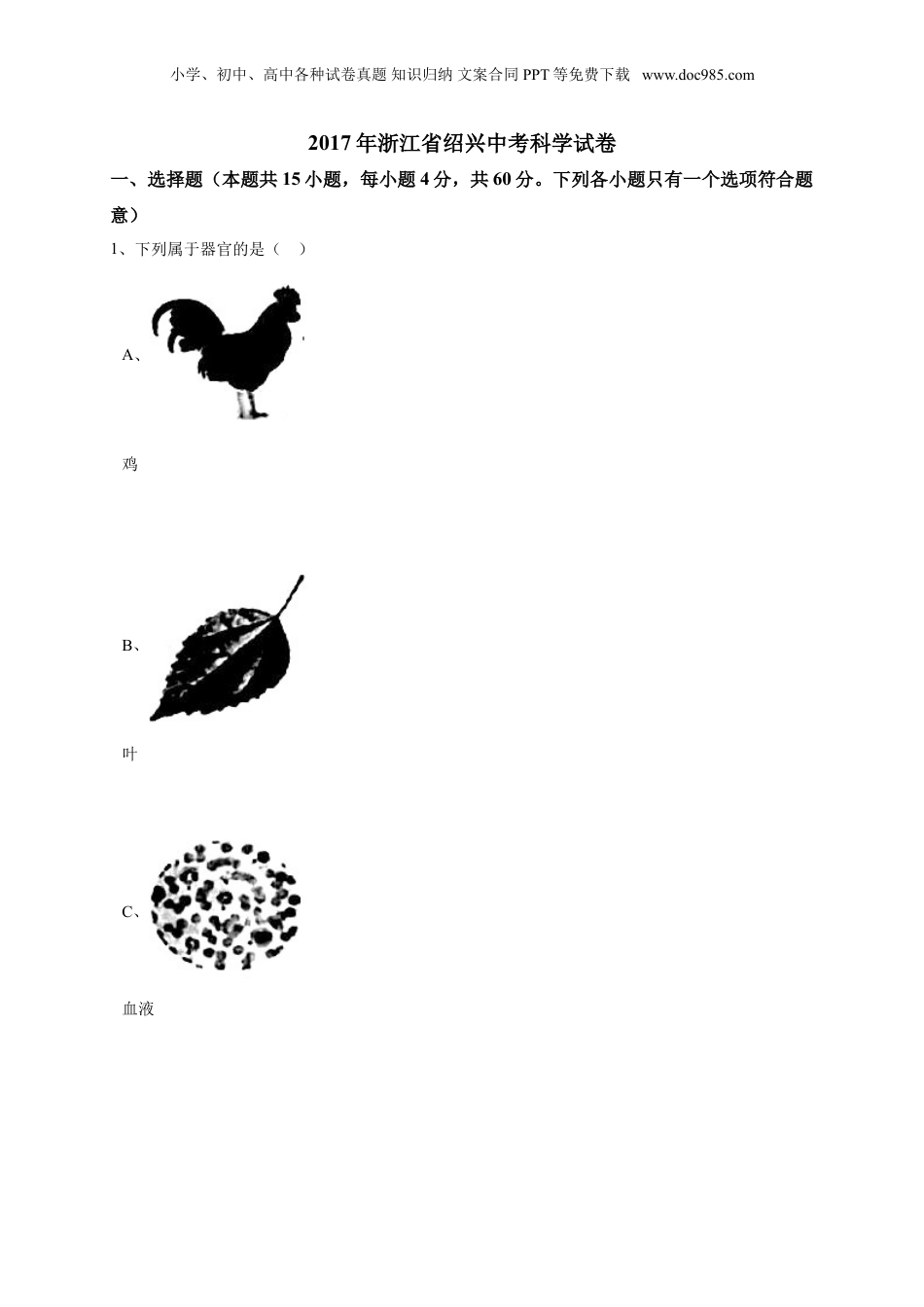 小学、初中、高中各种试卷真题知识归纳文案合同PPT等免费下载www.doc985.com2017年浙江省绍兴中考科学试卷一、选择题(本题共15小题,每小题4分,共60分。下列各小题只有一个选项符合题意)1、下列属于器官的是()A、鸡B、叶C、血液小学、初中、高中各种试卷真题知识归纳文案合同PPT等免费下载www.doc985.comD、精子【答案】B【考点】器官和系统【解析】【分析】做这题时要求要熟练掌握不同结构层次的有关内容,理解细胞、组织、器官、系统的知识,然后才能灵活运用已知的知识来分析、解决实际的问题。细胞是除病毒以外,生物体结构和功能的最小单位。组织是由形态相似,结构、功能相同的细胞联合在一起形成的。器官是由不同的组织按照一定的次序结合在一起构成的。系统是由能够共同完成一种或几种生理功能的多个器官按照一定的次序组合在一起构成的。【解答】A、鸡属于动物体,体内包含各种系统,故A不符合题意;B、叶属于植物的器官,其中含有营养组织,输导组织,保护组织等,故B符合题意;C、血液属于结缔组织,不属于器官,故C不符合题意;D、精子属于生殖细胞,不属于器官,故D不符合题意。故选B2、下列关于月球和太阳叙述正确的是()A、月球表面有环形山B、月球表面有空气、没有水C、太阳活动会引起地球的地震和火山爆发D、太阳黑子是太阳表层一些不发光、不发热的黑点【答案】A【考点】太阳的概况,月球的概况【解析】【分析】本题主要考查了对天体知识的了解,应多了解和掌握。(1)月球表面月坑的周围环绕着高出月面的环形山;(2)太阳是一颗恒星,是太阳系的中心,不是银河系的中心;(3)月球不是光源,本身不发光;(4)太阳是银河系中的恒星之一。【解答】A、月球表面月坑的周围环绕着高出月面的环形山,故A正确;B、月球表面既没有空气也没有水,故B错误;C、地球的地震和火山爆发是由于地球内部的地壳运动造成的,故C错误;小学、初中、高中各种试卷真题知识归纳文案合同PPT等免费下载www.doc985.comD、太阳的光球表面有时会出现一些暗的区域,它是磁场聚集的地方,这就是太阳黑子,故D错误。故选A3、下列实验操作正确的是()A、闻气体气味B、点燃酒精灯C、滴加液体D、小学、初中、高中各种试卷真题知识归纳文案合同PPT等免费下载www.doc985.com读取液体体积【答案】D【考点】实验操作注意事项的探究【解析】【分析】本题主要考查实验仪器及基本实验操作等相关内容。在化学实验操作时,要按照严格的操作规范进行,防止意外事故的发生。A、闻气体的气味时,不能直接用鼻子闻,一些气体有毒或刺激性;B、使用酒精灯时要注意“两查、两禁、一不可”;C、根据胶头滴管的用法分析;D、量筒读数需要平视。【解答】A、闻气体的气味时,防止气体有毒,应用手扇动,不能直接用鼻子闻,操作错误,故A错误;B、使用酒精灯时要注意“两查、两禁、一不可”,禁止用一酒精灯去引燃另一酒精灯,图中所示操作错误,故B错误;C、胶头滴管伸入试管中滴加液体,会污染胶头,从而污染试剂,故C错误;D、用量筒读液体体积时需要平视,故D正确。故选D4、新型膨胀式安全带(如图)紧缚力达到一定的值,藏在安全带里的气囊就会快速充气,迅速形成气囊袋,对驾乘人员起到更好的保护作用,下列关于膨胀式安全带说法正确的是()A、该安全带会使人的惯性减小B、该安全带可以使人所承受的力减小C、当车加速时,该安全带就会自动充气D、该安全带充气后增大与人体的接触面积,减小压强,可避免人员被勒伤【答案】D【考点】惯性,减小压强的方法及其应用【解析】【分析】生活中的惯性现象无处不在,关键要理解哪些现象是惯性现象,属于基础知识的考查。一切物体都具有惯性,汽车刹车时,如果没有安全带的保护,驾驶员会因为自身惯性向前运动而发生事故,所以要让安全带起到保护人体的作用,防止惯性带来的伤害。小学、初中、高中各种试卷真题知识归纳文案合同PPT等免费下载www.doc985.com【解答】A、惯性是物体本身的性质,惯性与质量大小有关,当紧急刹车时,安全带可以减弱司机的惯性造成的危害,不能减小惯性,故A错误;BD、安全带不能减少人所承受的力,而是通过增大接触面积,来减小压强...