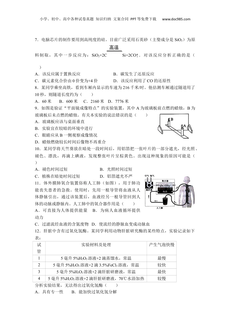 小学、初中、高中各种试卷真题知识归纳文案合同PPT等免费下载www.doc985.com2018年浙江省初中毕业毕业升学考试(台州卷)科学试题卷(1)本卷可能用到的相对原子质量:H-1C-12N-14O-16Na-23Cl-35.5(2)本卷中g取10牛/千克一、选择题(本题有15小题,每小题4分,共60分)1.2月6日,台州市禁毒办开展禁毒“流动课堂”宣传教育活动。毒品具有很强的成瘾性,严重影响人体健康。以下对毒品危害认识错误的是()A.吸毒会损害人体免疫系统B.吸毒会影响人的心理健康C.吸毒、贩毒严重危害社会D.经济允许时,可以偶尔吸一次2.使用显微镜观察洋葱表皮细胞时,要让已观察到的像更大,接下来应进行的操作是()A.B.C.D.3.红蛇果的果皮细胞因含花青素而呈红色。将某品种的红蛇果浸泡在热水中,热水变红色;浸泡在冷水中,冷水不变红。这一现象说明热水破坏了果皮细胞的()A.细胞壁B.细胞膜C.细胞质D.细胞核4.如图为自米水生产过程示意图。下列说法正确的是()A.清水池中的水是溶液B.过滤池中主要发生化学变化C.消毒用的液氯是化合物D.供水系统流出的水是纯净物5.2018年5月,台州南部湾区引水工程开工,以缓解台州南部地区的用水紧张状况。该工程通过管道,将台州北部水资源向南部输送。该工程改变的水循环环节是()A.降水B.地表径流C.海水蒸发D.水汽输送6.如图所示,用铅笔尖顶着一个纸风车,置于一杯热水上,风车就会转动。以下叙述正确的是()A.风车静止时,只受到重力的作用B.风车转动时,只受到热空气推力的作用C.风车转动时,机械能转化为水的热能D.移去热水,风车由于惯性不会立即停转小学、初中、高中各种试卷真题知识归纳文案合同PPT等免费下载www.doc985.com7.电脑芯片的制作要用到高纯度的硅。目前广泛采用石英砂(主娶成分是SiO2)为原料制取,其中一步反应为:SiO2+2CSi+2CO↑.对该反应分析正确的是()A.该反应属于置换反应B.碳发生了还原反应C.碳元素化合价由0价变为+4价D.该反应利用了CO的还原性8.某同学乘坐高铁,看到车厢内显示的车速为216千米/时。他估测车厢通过隧道用了10秒,则隧道长度约为()A.60米B.600米C.2160米D.7776米9.如图是验证“平面镜成像特点”的实验装置,其中A为玻璃板前点燃的蜡烛,B为玻璃板后未点燃的蜡烛。有关本实验的说法错误的是()A.玻璃板应该与桌面垂直B.实验宜在较暗的环境中进行C.眼睛应从B一侧观察成像情况D.蜡烛燃烧较长时间后像物不再重合10.某同学将天竺葵放在暗处一段时间后,用铝箔把一张叶片的一部分遮光,经光照、褪色、漂洗,再滴上碘液,发现整张叶片呈棕黄色。出现这种现象的原因可能是()A.褪色时间过短B.光照时间过短C.植株在暗处时间过短D.铝箔遮光不严11.体外膜肺氧合装置俗称人工肺(如图),用于肺功能丧失患者的急救。使用时,先用一根导管将血液从人体静脉引出,通过该装置后,血液经另一根导管回到人体的动脉或静脉内。人工肺中的氧合器作用是()A.可直接为人体提供能量B.为病人血液循环提供动力C.过滤流经血液的含氮废物D.使流经的静脉血变成动脉血12.肝脏中含有过氧化氢酶。某同学利用动物肝脏研究酶的某些特点,实验记录如下表:试管实验材料及处理产生气泡快慢15毫升5%H2O2溶液+2滴蒸馏水,常温最慢25毫升5%H2O2溶液+2滴3.5%FeCl3溶液,常温较快35毫升5%H2O2溶液+2滴肝脏研磨液,常温最快45毫升5%H2O2溶液+2滴肝脏研磨液,70℃水浴加热较慢分析实验结果,无法得出过氧化氢酶()A.具有专一性B.能加快过氧化氢分解小学、初中、高中各种试卷真题知识归纳文案合同PPT等免费下载www.doc985.comC.具有高效性D.活性受温度影响13.下列选项所示的物质转化均能一步实现的是()A.FeFe2O3Fe(OH)3B.CuOCuSO4CuCl2C.SSO2H2SO4D.CO2Na2CO3NaOH14.某同学利用如图甲所示的电路进行实验,电源电压恒为3伏,更换5个定值电阻Rx,得到如图乙所示的图象。以下有关叙述正确的是()A.该同学研究的是电流和电压的关系B.实验中电压表的示数保持0.5伏不变C.滑动变阻器阻值变化范围为1欧~5欧D.将Rx从5欧换成10欧后,应将滑片P向左移15.某固体由Ba2+、Cu2+、Na+、C...