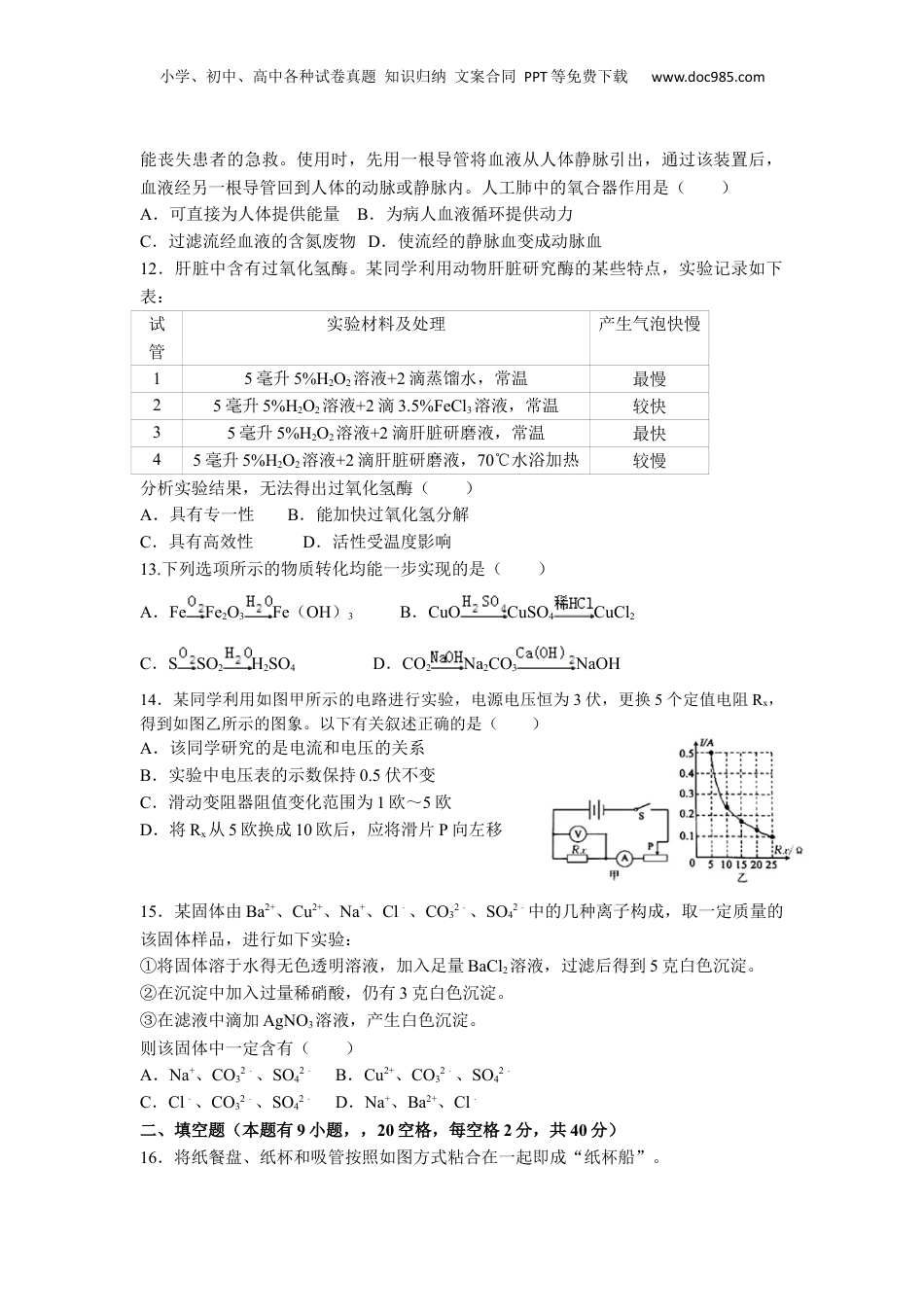小学、初中、高中各种试卷真题知识归纳文案合同PPT等免费下载www.doc985.com2018年浙江省初中毕业毕业升学考试(台州卷)科学试题卷(1)本卷可能用到的相对原子质量:H-1C-12N-14O-16Na-23Cl-35.5(2)本卷中g取10牛/千克一、选择题(本题有15小题,每小题4分,共60分)1.2月6日,台州市禁毒办开展禁毒“流动课堂”宣传教育活动。毒品具有很强的成瘾性,严重影响人体健康。以下对毒品危害认识错误的是()A.吸毒会损害人体免疫系统B.吸毒会影响人的心理健康C.吸毒、贩毒严重危害社会D.经济允许时,可以偶尔吸一次2.使用显微镜观察洋葱表皮细胞时,要让已观察到的像更大,接下来应进行的操作是()A.B.C.D.3.红蛇果的果皮细胞因含花青素而呈红色。将某品种的红蛇果浸泡在热水中,热水变红色;浸泡在冷水中,冷水不变红。这一现象说明热水破坏了果皮细胞的()A.细胞壁B.细胞膜C.细胞质D.细胞核4.如图为自米水生产过程示意图。下列说法正确的是()小学、初中、高中各种试卷真题知识归纳文案合同PPT等免费下载www.doc985.comA.清水池中的水是溶液B.过滤池中主要发生化学变化C.消毒用的液氯是化合物D.供水系统流出的水是纯净物5.2018年5月,台州南部湾区引水工程开工,以缓解台州南部地区的用水紧张状况。该工程通过管道,将台州北部水资源向南部输送。该工程改变的水循环环节是()A.降水B.地表径流C.海水蒸发D.水汽输送6.如图所示,用铅笔尖顶着一个纸风车,置于一杯热水上,风车就会转动。以下叙述正确的是()A.风车静止时,只受到重力的作用B.风车转动时,只受到热空气推力的作用C.风车转动时,机械能转化为水的热能D.移去热水,风车由于惯性不会立即停转7.电脑芯片的制作要用到高纯度的硅。目前广泛采用石英砂(主娶成分是SiO2)为原料制取,其中一步反应为:SiO2+2CSi+2CO↑.对该反应分析正确的是()A.该反应属于置换反应B.碳发生了还原反应C.碳元素化合价由0价变为+4价D.该反应利用了CO的还原性8.某同学乘坐高铁,看到车厢内显示的车速为216千米/时。他估测车厢通过隧道用了10秒,则隧道长度约为()A.60米B.600米C.2160米D.7776米9.如图是验证“平面镜成像特点”的实验装置,其中A为玻璃板前点燃的蜡烛,B为玻璃板后未点燃的蜡烛。有关本实验的说法错误的是()A.玻璃板应该与桌面垂直B.实验宜在较暗的环境中进行C.眼睛应从B一侧观察成像情况D.蜡烛燃烧较长时间后像物不再重合10.某同学将天竺葵放在暗处一段时间后,用铝箔把一张叶片的一部分遮光,经光照、褪色、漂洗,再滴上碘液,发现整张叶片呈棕黄色。出现这种现象的原因可能是()A.褪色时间过短B.光照时间过短C.植株在暗处时间过短D.铝箔遮光不严11.体外膜肺氧合装置俗称人工肺(如图),用于肺功小学、初中、高中各种试卷真题知识归纳文案合同PPT等免费下载www.doc985.com能丧失患者的急救。使用时,先用一根导管将血液从人体静脉引出,通过该装置后,血液经另一根导管回到人体的动脉或静脉内。人工肺中的氧合器作用是()A.可直接为人体提供能量B.为病人血液循环提供动力C.过滤流经血液的含氮废物D.使流经的静脉血变成动脉血12.肝脏中含有过氧化氢酶。某同学利用动物肝脏研究酶的某些特点,实验记录如下表:试管实验材料及处理产生气泡快慢15毫升5%H2O2溶液+2滴蒸馏水,常温最慢25毫升5%H2O2溶液+2滴3.5%FeCl3溶液,常温较快35毫升5%H2O2溶液+2滴肝脏研磨液,常温最快45毫升5%H2O2溶液+2滴肝脏研磨液,70℃水浴加热较慢分析实验结果,无法得出过氧化氢酶()A.具有专一性B.能加快过氧化氢分解C.具有高效性D.活性受温度影响13.下列选项所示的物质转化均能一步实现的是()A.FeFe2O3Fe(OH)3B.CuOCuSO4CuCl2C.SSO2H2SO4D.CO2Na2CO3NaOH14.某同学利用如图甲所示的电路进行实验,电源电压恒为3伏,更换5个定值电阻Rx,得到如图乙所示的图象。以下有关叙述正确的是()A.该同学研究的是电流和电压的关系B.实验中电压表的示数保持0.5伏不变C.滑动变阻器阻值变化范围为1欧~5欧D.将Rx从5欧换成10欧后,应将滑片P向左移15.某固体由Ba2+、Cu2+、Na+、C...