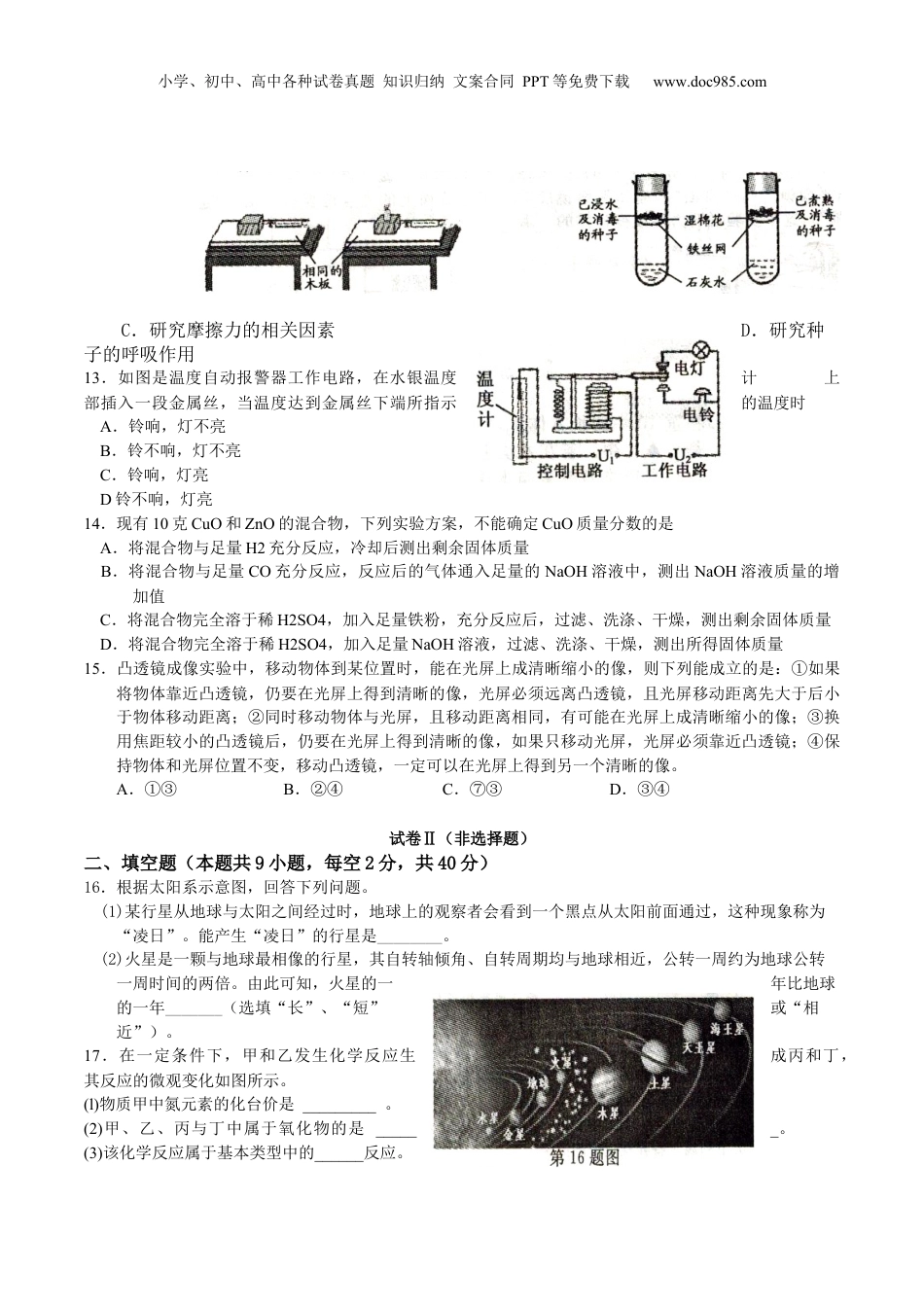 小学、初中、高中各种试卷真题知识归纳文案合同PPT等免费下载www.doc985.com2016年绍兴市初中毕业生学业考试科学本卷可能用到的公式和相对原子质量:密度:ρ=,速度:v=,压强:p=,欧姆定律:I=,功:W=Fs,功率:P=,重力:G=mg,浮力:F浮=G排液=ρ液gV排液电功:W=UIt,电功率:P=UI,杠杆平衡条件:F1l1=F2l2ρ水=1.0×103千克/米3g取10牛/千克H-1C-12N-14O-16Na-23S-32Cl-35.5Ca-40Fe-56Cu-64Zn-65卷I(选择题)一、选择题(本题有15小题,每小题4分,共60分。下列各小题只有一个选项符合题意)1.如图4种生物的细胞中都具有的结构是A.细胞壁B.细胞膜C.细胞核D.叶绿体2.下列属于太阳活动对地球直接影响的是A.耀斑增强时地球上的短波通讯会受到明显影响B.引发火山喷发C.引起板块张裂D.造成地震频发3.如图物体的成分主要是有机物的是A.细胞壁B.细胞膜C.细胞核D.叶绿体4.下列杠杆能平衡的是(杆重和摩擦均不计)ABCD5.下列利用空气某成分物理性质的是A.氧气可以供给呼吸B.氮气可以制造化肥小学、初中、高中各种试卷真题知识归纳文案合同PPT等免费下载www.doc985.comC.干冰用于人工降雨D.稀有气体用作保护气6.如图实验说明,燃烧需要的条件是A.有可燃物B.有助燃剂C.温度达到可燃物的着火点D.可燃物与火焰直接接触7.关于光学显微镜使用时出现的现象与相应处理方法正确的是A.视野中有许多黑色圆圈――重新制作装片B.对光时发现视野较暗——将凹面镜换成平面镜C.要观察的细胞在视野左下方的边缘——将装片往右上方移动D.低倍镜下观察到细胞有重叠——换用高倍镜观察8.如图分类检索表中,鸽子的位置是A.B.C.D.9.下列现象由惯性造成的是A.草地上滚动的足球慢慢停下B.紧急刹车时,站在车上的乘客向前倾倒C.成熟的苹果从树上掉下D.下落的乒乓球触地反弹10.下列属于特异性免疫的图是A.皮肤的屏障作用B.溶菌酶溶解病毒C.吞噬细胞吞噬病菌D.淋巴细胞的免疫作用11.将塑料包装带撕成细丝后,上端打结,然后用干燥的丝绸或毛皮等顺着细丝向下捋几下,希望做成下图的各种情形,其中无法完成的是A.B.C.D.12.控制变量是一种常用的科学方法,下列实验中变量控制不合理的是A.研究影响电磁铁磁性强弱的因素B.研究压力效果的相关因素小学、初中、高中各种试卷真题知识归纳文案合同PPT等免费下载www.doc985.comC.研究摩擦力的相关因素D.研究种子的呼吸作用13.如图是温度自动报警器工作电路,在水银温度计上部插入一段金属丝,当温度达到金属丝下端所指示的温度时A.铃响,灯不亮B.铃不响,灯不亮C.铃响,灯亮D铃不响,灯亮14.现有10克CuO和ZnO的混合物,下列实验方案,不能确定CuO质量分数的是A.将混合物与足量H2充分反应,冷却后测出剩余固体质量B.将混合物与足量CO充分反应,反应后的气体通入足量的NaOH溶液中,测出NaOH溶液质量的增加值C.将混合物完全溶于稀H2SO4,加入足量铁粉,充分反应后,过滤、洗涤、干燥,测出剩余固体质量D.将混合物完全溶于稀H2SO4,加入足量NaOH溶液,过滤、洗涤、干燥,测出所得固体质量15.凸透镜成像实验中,移动物体到某位置时,能在光屏上成清晰缩小的像,则下列能成立的是:①如果将物体靠近凸透镜,仍要在光屏上得到清晰的像,光屏必须远离凸透镜,且光屏移动距离先大于后小于物体移动距离;②同时移动物体与光屏,且移动距离相同,有可能在光屏上成清晰缩小的像;③换用焦距较小的凸透镜后,仍要在光屏上得到清晰的像,如果只移动光屏,光屏必须靠近凸透镜;④保持物体和光屏位置不变,移动凸透镜,一定可以在光屏上得到另一个清晰的像。A.①③B.②④C.⑦③D.③④试卷Ⅱ(非选择题)二、填空题(本题共9小题,每空2分,共40分)16.根据太阳系示意图,回答下列问题。(1)某行星从地球与太阳之间经过时,地球上的观察者会看到一个黑点从太阳前面通过,这种现象称为“凌日”。能产生“凌日”的行星是________。(2)火星是一颗与地球最相像的行星,其自转轴倾角、自转周期均与地球相近,公转一周约为地球公转一周时间的两倍。由此可知,火星的一年比地球的一年_______(选填“长”、“短”...
