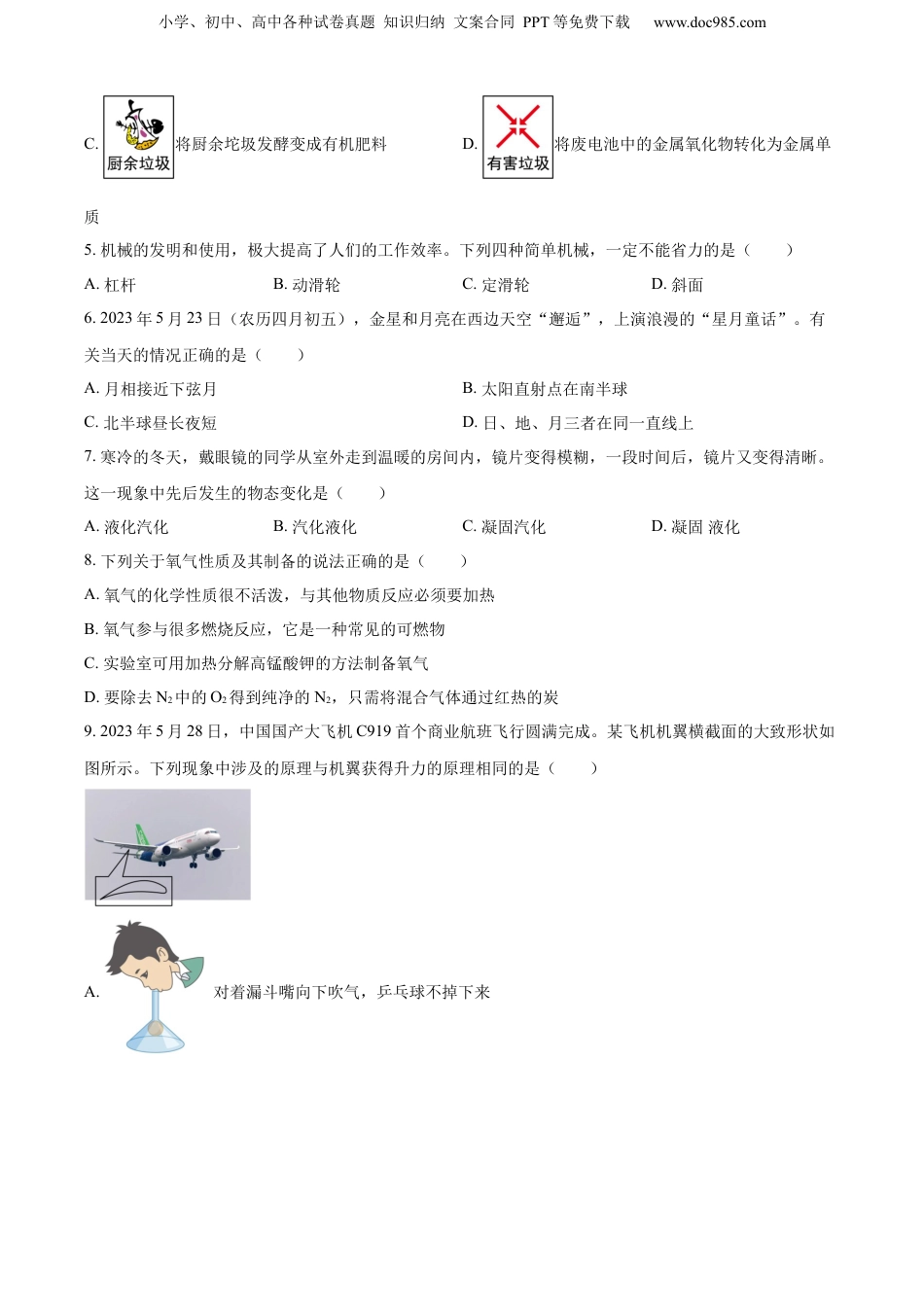 小学、初中、高中各种试卷真题知识归纳文案合同PPT等免费下载www.doc985.com浙江省2023年初中学业水平考试(湖州市)科学试题卷友情提示:1.全卷分卷Ⅰ和卷Ⅱ,共8页。卷Ⅰ中试题(1~16小题)的答案填涂在答题卷相应的位置上,卷Ⅱ中试题(17~35小题)的答案写在答题卷相应的位置上。全卷满分为160分。2.考试时间为120分钟。3.本卷可能用到的相对原子质量:H-1C-12O-16Na-23Cl-35.5Ca-404.本卷g取10牛/千克,ρ水=1.0×103千克/米3。卷I一、选择题(本题有16小题,每小题3分,共48分。请选出各小题中一个符合题意的选项,不选、多选、错选均不给分。)1.科学上常用某领域做出突出贡献的科学家的名字为单位。下列表示压强单位的是()A.牛顿B.安培C.焦耳D.帕斯卡2.现在人们广泛使用的某种复合膨松剂中含有碳酸氢钠。碳酸氢钠在受热时发生反应的方程式为:2NaHCO3Na2CO3+H2O+CO2↑,这一化学反应的类型是()A.化合反应B.分解反应C.置换反应D.复分解反应3.健康的身体是最大的财富。下列关于健康生活的说法错误的是()A.流感流行期间,尽量少去公共场所B.年轻人精力充沛,可以经常熬夜C.营养过剩或不足都会影响身体健康,应平衡膳食D.吸毒对身体的伤害几乎是毁灭性的,要远离毒品4.垃圾是被放错位置的资源,正确分类可以保护环境,实现资源再利用。下列对垃圾的处理中只发生物理变化的是()A.将金属边角料压成块存放B.将其他垃圾焚烧用来发电小学、初中、高中各种试卷真题知识归纳文案合同PPT等免费下载www.doc985.comC.将厨余坨圾发酵变成有机肥料D.将废电池中的金属氧化物转化为金属单质5.机械的发明和使用,极大提高了人们的工作效率。下列四种简单机械,一定不能省力的是()A.杠杆B.动滑轮C.定滑轮D.斜面6.2023年5月23日(农历四月初五),金星和月亮在西边天空“邂逅”,上演浪漫的“星月童话”。有关当天的情况正确的是()A.月相接近下弦月B.太阳直射点在南半球C.北半球昼长夜短D.日、地、月三者在同一直线上7.寒冷的冬天,戴眼镜的同学从室外走到温暖的房间内,镜片变得模糊,一段时间后,镜片又变得清晰。这一现象中先后发生的物态变化是()A.液化汽化B.汽化液化C.凝固汽化D.凝固液化8.下列关于氧气性质及其制备的说法正确的是()A.氧气的化学性质很不活泼,与其他物质反应必须要加热B.氧气参与很多燃烧反应,它是一种常见的可燃物C.实验室可用加热分解高锰酸钾的方法制备氧气D.要除去N2中的O2得到纯净的N2,只需将混合气体通过红热的炭9.2023年5月28日,中国国产大飞机C919首个商业航班飞行圆满完成。某飞机机翼横截面的大致形状如图所示。下列现象中涉及的原理与机翼获得升力的原理相同的是()A.对着漏斗嘴向下吹气,乒乓球不掉下来小学、初中、高中各种试卷真题知识归纳文案合同PPT等免费下载www.doc985.comB.用吸管吸牛奶,牛奶盒发生形变C.加热空气后,热气球不断上升D.覆杯实验中松手后,硬纸片不会掉下10.金属钠可以在氯气中燃烧,生成氯化钠。从微观角度分析,下列说法错误的是()A.燃烧过程中钠原子失去电子形成钠离子B.氯离子中质子数大于电子数C.钠离子与氯离子之间相互吸引,构成电中性的氯化钠D.氯原子转变为氯离子的过程中,核内质子数不变11.在太平洋某小岛上发现了新的植物物种,被命名为於茂登草。该植物开紫色小花,没有叶绿体,不进行光合作用,从真菌处夺取营养,这种独特机制引人注目。根据信息判断,下列说法错误的是()A.於茂登草的独特机制是长期自然选择的结果B.生活在该岛上所有的於茂登草构成一个种群C.从营养方式看,於茂登草属于自养型生物D.於茂登草会开花结果,属于被子植物12.2023年5月11日,天舟六号货运飞船与空间站完成对接。这是我国改进型货运飞船首发船,其发射成功意义重大。下列说法正确的是()小学、初中、高中各种试卷真题知识归纳文案合同PPT等免费下载www.doc985.comA.起飞时,燃料的化学能全部转化为火箭的机械能B.对接完成后,以空间站为参照物,飞船是静止的C.货物从地面运到空间站,其质量与重力都保持不变D.完成对接后,空间站绕地球运动时运动状态保持不变13.植物的根有大量根毛,可以增加根与土壤的接触面积。...