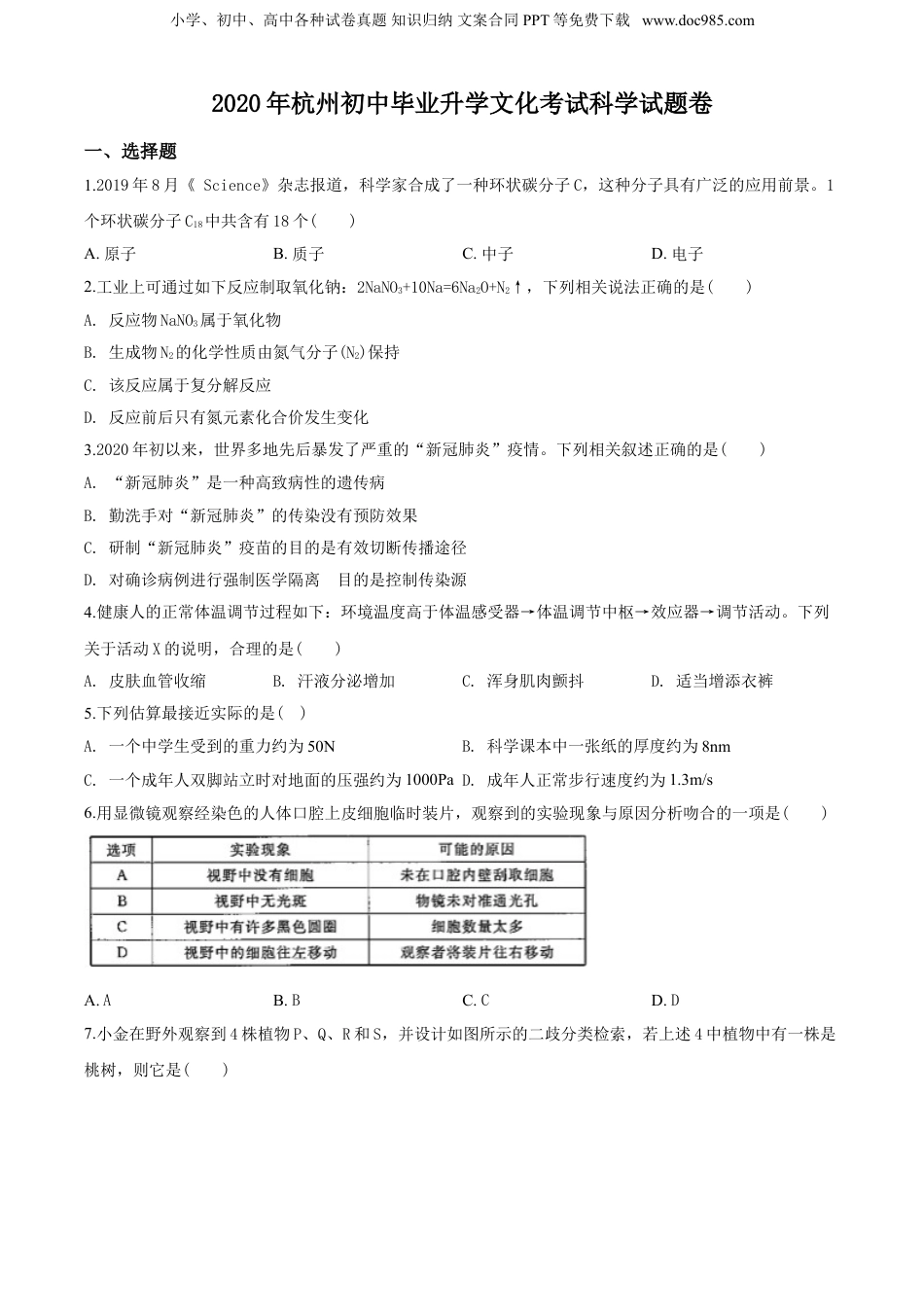 小学、初中、高中各种试卷真题知识归纳文案合同PPT等免费下载www.doc985.com2020年杭州初中毕业升学文化考试科学试题卷一、选择题1.2019年8月《Science》杂志报道,科学家合成了一种环状碳分子C,这种分子具有广泛的应用前景。1个环状碳分子C18中共含有18个()A.原子B.质子C.中子D.电子2.工业上可通过如下反应制取氧化钠:2NaNO3+10Na=6Na2O+N2↑,下列相关说法正确的是()A.反应物NaNO3属于氧化物B.生成物N2的化学性质由氮气分子(N2)保持C.该反应属于复分解反应D.反应前后只有氮元素化合价发生变化3.2020年初以来,世界多地先后暴发了严重的“新冠肺炎”疫情。下列相关叙述正确的是()A.“新冠肺炎”是一种高致病性的遗传病B.勤洗手对“新冠肺炎”的传染没有预防效果C.研制“新冠肺炎”疫苗的目的是有效切断传播途径D.对确诊病例进行强制医学隔离的目的是控制传染源4.健康人的正常体温调节过程如下:环境温度高于体温感受器→体温调节中枢→效应器→调节活动。下列关于活动X的说明,合理的是()A.皮肤血管收缩B.汗液分泌增加C.浑身肌肉颤抖D.适当增添衣裤5.下列估算最接近实际的是()A.一个中学生受到的重力约为50NB.科学课本中一张纸的厚度约为8nmC.一个成年人双脚站立时对地面的压强约为1000PaD.成年人正常步行速度约为1.3m/s6.用显微镜观察经染色的人体口腔上皮细胞临时装片,观察到的实验现象与原因分析吻合的一项是()A.AB.BC.CD.D7.小金在野外观察到4株植物P、Q、R和S,并设计如图所示的二歧分类检索,若上述4中植物中有一株是桃树,则它是()小学、初中、高中各种试卷真题知识归纳文案合同PPT等免费下载www.doc985.comA.PB.QC.RD.S8.生物体结构与功能相适应的现象是在长期进化过程中形成的。下列有关人体结构与功能相适应的叙述,不正确的是()A.关节头和关节窝表面覆盖着一层关节软骨,有利于关节的灵活运动B.小肠绒毛内分布着丰富的毛细血管,有利于肠道内营养物质的消化C.肺泡外有丰富的弹性纤维,有利于呼吸时肺泡与外界的气体交换D.肾小管外有毛细血管网,有利于将原尿中的有用物质重吸收回血液9.如图是六大板块示意图,根据板块构造学说可知()A.地球表面的陆地被海岭和海沟分割成六大板块B.火山与地震带都分布在各大板块的中央C.我们生活的杭州位于亚欧板块D.青藏高原是由亚欧板块与非洲板块碰撞形成10.小金通过实验室制取和牧集二氧化碳的方法获得了一瓶二氧化碳气体。接着利用这瓶二氧化碳气体完成了图示实验观察到蜡烛火焰自下而上依次熄灭。下列说法错误的是()A.实验室制取二氧化碳的药品为块状大理石和稀硫酸B.实验室可采用向上排空气法收集二氧化碳C.图示实验可说明二氧化碳密度比空气大小学、初中、高中各种试卷真题知识归纳文案合同PPT等免费下载www.doc985.comD.图示实验可说明二氧化碳不支持蜡烛的燃烧11.有外形相同的两根钢棒M、N,按图甲、图乙两种方式接触时,它们之间都有较大吸引力。则下列推断正确的是()A.M无磁性、N无磁性B.M无磁性、N有磁性C.M有磁性、N无磁性D.M有磁性、N有磁性12.如图是太阳直射点运动示意图,其中a、b、c分别表示三条纬线。据图分析可知()A.纬线a是南回归线B.当直射点在①时,杭州市的节气是夏至C.当直射点在纬线a、b之间移动时,杭州市昼夜平分D.造成直射点在纬线a、c之间移动的主要原因是地球的自转13.小金在配硝酸钾溶液时得到下表数据,据此分析以下说法正确的是()序号温度/℃水的质量/克加入硝酸钾的质量/克所得溶液的质量/克①1010040120.9②6010040140A.10℃时硝酸钾的溶解度为40克B.②所得溶液一定是60℃时硝酸钾的饱和溶液C.若通过加热将①中剩余硝酸钾全部溶解,则溶液的溶质质量分数与加热前保持一致D.若将②所得溶液降温至10℃,则溶液的溶质质量分数会变小14.惯性是物体的一种性质,下列说法正确的是()A.物体运动状态改变时才有惯性B.物体速度越大惯性也越大C.静止或匀速运动的物体没有惯性D.物体受力或不受力时都具有惯性15.照相机和放大镜都是凸透镜成像原理的具体应用。对应下图,下列关于照相机、放大镜使用和成像的说法正确的是()小学、初中、高中各种试卷真题知识归纳文案合同PPT等免费下载www.doc985.comA.照相机...