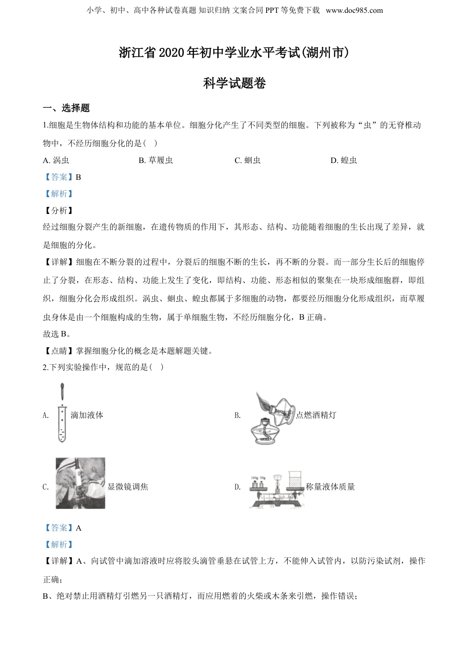 小学、初中、高中各种试卷真题知识归纳文案合同PPT等免费下载www.doc985.com浙江省2020年初中学业水平考试(湖州市)科学试题卷一、选择题1.细胞是生物体结构和功能的基本单位。细胞分化产生了不同类型的细胞。下列被称为“虫”的无脊椎动物中,不经历细胞分化的是()A.涡虫B.草履虫C.蛔虫D.蝗虫【答案】B【解析】【分析】经过细胞分裂产生的新细胞,在遗传物质的作用下,其形态、结构、功能随着细胞的生长出现了差异,就是细胞的分化。【详解】细胞在不断分裂的过程中,分裂后的细胞不断的生长,再不断的分裂。而一部分生长后的细胞停止了分裂,在形态、结构、功能上发生了变化,即结构、功能、形态相似的聚集在一块形成细胞群,即组织,细胞分化会形成组织。涡虫、蛔虫、蝗虫都属于多细胞的动物,都要经历细胞分化形成组织,而草履虫身体是由一个细胞构成的生物,属于单细胞生物,不经历细胞分化,B正确。故选B。【点睛】掌握细胞分化的概念是本题解题关键。2.下列实验操作中,规范的是()A.滴加液体B.点燃酒精灯C.显微镜调焦D.称量液体质量【答案】A【解析】【详解】A、向试管中滴加溶液时应将胶头滴管垂悬在试管上方,不能伸入试管内,以防污染试剂,操作正确;B、绝对禁止用酒精灯引燃另一只酒精灯,而应用燃着的火柴或木条来引燃,操作错误;小学、初中、高中各种试卷真题知识归纳文案合同PPT等免费下载www.doc985.comC、显微镜调焦时,头侧观察,防止物镜压碎玻片,但眼睛看物镜的角度不对,操作错误;D、托盘天平应该左物右码,操作错误。故选A。3.2020年5月27日11时,我国珠峰测量队8名队员全部登顶成功。再过一段时间,我们就可以知道珠峰的最新“身高”了。若队员在珠峰顶做图示实验,测得的结果会比在同纬度低海拔地区小,原因是()A.重物质量变小B.气压变小C.地球的吸引作用变小D.温度变低【答案】C【解析】【详解】ABD.重物到珠峰顶,位置改变、质量不变,原因不是重物质量变小,弹簧测力计的示数变小与气压、温度无关。故ABD不符合题意;C.纬度相同,海拔越高,距离地球越远,地球对物体的吸引力越小,弹簧测力计的示数越小,使得测得的结果会比在同纬度低海拔地区小,故C符合题意。故选C。4.新冠肺炎主要是通过飞沫传播的,如图所示,所以在疫情期间外出时提倡戴口罩。新冠肺炎的罪魁祸首是新冠病毒,新冠病毒()A.属于单细胞生物B.能离开生物体独立生活C.是新冠肺炎的传染源D.发生变异的根本原因是遗传物质的改变【答案】D【解析】【分析】传染病是由病原体引起的,能在人和人之间,以及人和动物之间传播的疾病;预防传染病的一般措施可分为:控制传染源、切断传播途径、保护易感者。小学、初中、高中各种试卷真题知识归纳文案合同PPT等免费下载www.doc985.com【详解】A、新冠病毒无细胞结构,只由蛋白质外壳和内部的遗传物质组成,A错误。B、新冠病毒不能独立生存,只有寄生在活细胞里才能进行生命活动,B错误。C、患新冠肺炎的人能够散播病原体,属于传染源,新冠病毒是新冠肺炎的病原体,C错误。D、病毒由蛋白质外壳和内部的遗传物质组成,发生变异的根本原因是遗传物质的改变,D正确。【点睛】解答此题的关键是明确传染病以及免疫的有关知识点。5.叶绿素是一类含镁的有机物,是叶绿体中的重要色素,与光合作用密切相关。叶绿素()A.主要吸收白光中的绿光B.存在于生物体的每个细胞中C.能溶解在酒精中D.含有的镁用于调节植物的生命活动【答案】C【解析】【分析】根据光的反射,叶绿素的分布与特性等知识进行解答。【详解】A、叶片呈绿色,主要是因为叶绿素吸收绿光少,反射绿光多,A错误。B、叶绿素只存在植物的绿色部分,比如,绿色植物根尖分生区细胞没有叶绿素,B错误。C、酒精溶解叶绿素,把叶片放入盛有酒精的小烧杯中,隔水加热,使叶片中的叶绿素溶解到酒精中,叶片变成黄白色,C正确。D、叶绿素是一类含镁的有机物,能够进行光合作用,不能用于调节植物的生命活动,D错误。故选C。【点睛】注意:叶片吸收最多的光是红橙光与蓝紫光,绿光吸收最少,因此,叶片呈绿色。6.下列现象中,不是通过形成低压区实现的是()A.灰尘进入吸尘器内B.导管口有气泡C.刮大风时...