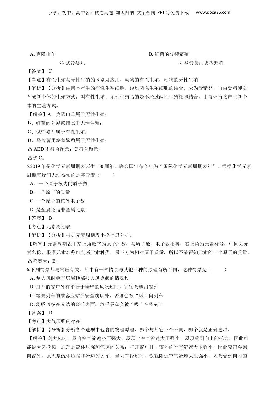 小学、初中、高中各种试卷真题知识归纳文案合同PPT等免费下载www.doc985.com浙江省湖州市2019年中考科学试卷一、选择题(本题有16小题,每小题3分,共48分。)1.2019年1月嫦娥四号探测器成功着陆月球“背面”,之后月球车开始在月球“背面”的A处巡视探测,如图所示。月球在绕地球一周的过程中,月球车要经历强光照射的高温考验时段,该时段为农历()A.初一前后B.初七前后C.十五前后D.二十二前后【答案】A【考点】阴历与月相的关系,月相【解析】【分析】月球车在月球“背面”A处巡视时,月球车被强光照射,则月球向地球的一面没有阳光,则在地球上看不到月亮。【解答】月球车在月球“背面”被强光照射,则月球朝向地球的一面没有阳光,则该时段为农历初一前后;故选A。2.下列物质中属于纯净物的是()A.冰水混合物B.高锰酸钾制氧气后的残留固体C.清澈的泉水D.铝合金【答案】A【考点】常见物质的分类【解析】【分析】根据纯净物、混合物的定义分析,纯净物为一种物质组成的物质,混合物为多种物质组成的物质。【解答】A、冰水混合物只有水一种物质,属于纯净物,正确;B、高锰酸钾制氧气后的残留固体含有锰酸钾、二氧化锰,属于混合物,错误;C、清澈的泉水中含有多种物质,属于混合物,错误;小学、初中、高中各种试卷真题知识归纳文案合同PPT等免费下载www.doc985.comD、合金都属于混合物,错误;故答案为:A。3.生活中有许多常见的光学现象。下列现象由光的反射形成的是()A.树荫下的圆形光斑B.水中树的倒影C.夕阳下栏杆的影子D.放大镜放大的地图【答案】B【考点】光的反射【解析】【分析】光在传播过程中遇到不透明的物体,不会停止传播,而是改变方向继续在原来介质中传播,这种现象叫光的反射,主要应用是:①改变光的传播方向;②平面镜成像。【解答】A.树荫下的圆形光斑,是阳光通过树叶的缝隙形成的小孔成像现象,由光沿直线传播形成,故A错误;B.水中树的倒影属于平面镜成像,由光的反射形成,故B正确;C.夕阳下栏杆的影子是由光的直线传播形成的,故C错误;D.放大镜放大的地图,是光的折射形成的虚像,故D错误。故选B。4.生物通过生殖和发育使生命得以延续。下列生殖方式属于有性生殖的是()小学、初中、高中各种试卷真题知识归纳文案合同PPT等免费下载www.doc985.comA.克隆山羊B.细菌的分裂繁殖C.试管婴儿D.马铃薯用块茎繁殖【答案】C【考点】有性生殖与无性生殖的区别及应用,动物的有性生殖,动物的无性生殖【解析】【分析】由亲本产生的有性生殖细胞,经过两性生殖细胞的结合,成为受精卵,再由受精卵发育成新个体的生殖方式,叫有性生殖;无性生殖指的是不经过两性生殖细胞结合,由母体直接产生新个体的生殖方式。【解答】A、克隆山羊属于无性生殖;B、细菌的分裂繁殖属于无性生殖;C、试管婴儿属于有性生殖;D、马铃薯用块茎繁殖属于无性生殖;故ABD不符合题意;C符合题意;故选C。5.2019年是化学元素周期表诞生150周年。联合国宣布今年为“国际化学元素周期表年”。根据化学元素周期表我们无法得知的是某元素()A.一个原子核内的质子数B.一个原子的质量C.一个原子的核外电子数D.是金属还是非金属元素【答案】B【考点】元素周期表【解析】【分析】根据元素周期表小格信息分析。【解答】元素周期表中左上角数字为原子序数,与质子数、电子数相等,右上角为元素符号,中间为元素名称,根据元素名称可判断元素种类,最下方为相对原子质量,所以不能得知元素的一个原子的质量。故答案为:B。6.下列情景都与气压有关,其中有一种情景与其他三种的原理有所不同,这种情景是()A.刮大风时会有房屋顶部被大风掀起的情况过B.打开的窗户外有平行于墙壁的风吹过时,窗帘会飘出窗外C.等候列车的乘客应站在安全线以外,否则会被“吸”向列车D.将吸盘按在光洁的瓷砖表面,放手吸盘会被“吸”在瓷砖上【答案】D【考点】大气压强的存在【解析】【分析】分析各个选项中包含的物理原理,哪个与其它三个不同,哪个就是正确选项。【解答】刮大风时,屋内空气流速小压强大,屋顶上空气流速大压强小,屋顶受到向上的托力,因此可能被大风掀起,原理是流体压强和流速的关系;打开窗...