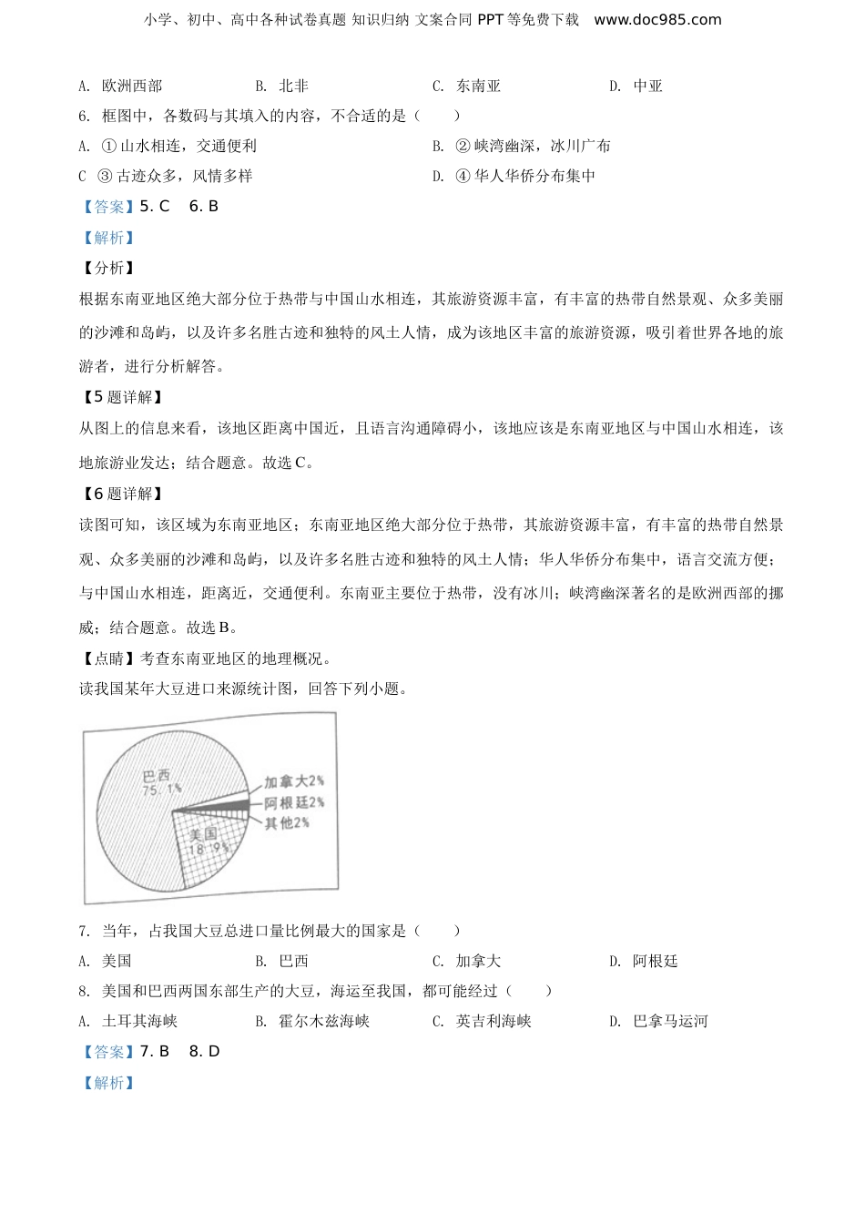 小学、初中、高中各种试卷真题知识归纳文案合同PPT等免费下载www.doc985.com2019年湖南省岳阳市中考地理试卷一、选择题(本大题共17小题,每小题只有一个正确答案.按答题卡中的要求填涂每小题正确答案的字母代号.每小题3分,共51分)我国海军要进行一次军事活动,为确保安全,发布了《临时禁航通告》,禁止渔船等其他船只进入如图所示禁航区。读图回答下列小题。1.该禁航区范围内,最东端与最西端的经度相差约为()A.2°20′B.4°20′C.119°13′D.121°33′2.此时,下列各地中,渔船不能进入的是()A.33°56′N,122°40′EB.35°10′N,121°03′EC.37°33′N,119°13′ED.38°30′N,121°33′E【答案】1.A2.B【解析】【分析】根据由经线和纬线相互交织所构成的网络叫做经纬网,利用经纬网可以确定地球表面任何一个地点的位置。在经纬网上,若相邻两条经线的经度向东增大,就是东经,用符号E表示;若相邻两条经线的经度向西增大,就是西经,用符号W表示;若相邻两条纬线的纬度向北增大,就是北纬,用符号N表示;若相邻两条纬线的纬度向南增大,就是南纬,用符号S表示,进行分析解答。【1题详解】读图可知,该禁航区西至119°13′E,东至121°33′E,跨越2°20′结合题意。故选A。【2题详解】东西经度的判定方法为:经度度数向东变大为东经,经度度数向西变大为西经;南北纬度的判定:纬度度数向北变大为北纬,纬度度数向南变大为南纬。读图分析可知,四个选项中,35°10′N、121°03′E位于禁航区。依据题意。故选B。【点睛】本题考查经纬网的判读,读图理解解答即可。小学、初中、高中各种试卷真题知识归纳文案合同PPT等免费下载www.doc985.com如图所示区域中,E水电站是我国承建的西非最大水电站,目前已投产发电。结合该区域年降水量分布图,回答下列小题。3.图中E水电站所在地的年降水量()A.小于500毫米B.小于1000毫米C.小于2000毫米D.大于2000毫米4.该水电站投产发电,对当地产生的作用是()A.控制人口增长B.增加水旱灾害C.改善能源结构D.改变宗教信仰【答案】3.D4.C【解析】【分析】根据非洲大部分位于南北回归线之间,赤道穿过中部地区,气候以赤道为中心,呈南北对称分布,以热带草原和热带沙漠气候为主,又被称为“热带大陆”,该洲最广的气候类型是热带草原气候,经济发展较为落后,为单一商品经济,进行分析解答。【3题详解】据图中的年等降水量线可得,E水电站所在地的年降水量大于2000毫米,该地属于热带雨林气候;结合题意。故选D。【4题详解】读图可知,E水电站是我国承建的西非最大水电站,目前已投产发电,能改善能源结构,减少水旱灾害,但不能控制人口增长、改变宗教信仰;结合题意。故选C。【点睛】本题考查非洲的地理概况,读图解答即可。某中学地理学习小组,绘制了一幅框图,探究某地区成为中国人出境旅游目的地的优势条件。据此回答下列小题。5.该地区可能是()小学、初中、高中各种试卷真题知识归纳文案合同PPT等免费下载www.doc985.comA.欧洲西部B.北非C.东南亚D.中亚6.框图中,各数码与其填入的内容,不合适的是()A.①山水相连,交通便利B.②峡湾幽深,冰川广布C.③古迹众多,风情多样D.④华人华侨分布集中【答案】5.C6.B【解析】【分析】根据东南亚地区绝大部分位于热带与中国山水相连,其旅游资源丰富,有丰富的热带自然景观、众多美丽的沙滩和岛屿,以及许多名胜古迹和独特的风土人情,成为该地区丰富的旅游资源,吸引着世界各地的旅游者,进行分析解答。【5题详解】从图上的信息来看,该地区距离中国近,且语言沟通障碍小,该地应该是东南亚地区与中国山水相连,该地旅游业发达;结合题意。故选C。【6题详解】读图可知,该区域为东南亚地区;东南亚地区绝大部分位于热带,其旅游资源丰富,有丰富的热带自然景观、众多美丽的沙滩和岛屿,以及许多名胜古迹和独特的风土人情;华人华侨分布集中,语言交流方便;与中国山水相连,距离近,交通便利。东南亚主要位于热带,没有冰川;峡湾幽深著名的是欧洲西部的挪威;结合题意。故选B。【点睛】考查东南亚地区的地理概况。读我国某年大豆进口来源统计图,回答下列小题。7.当年,占我国大豆总...