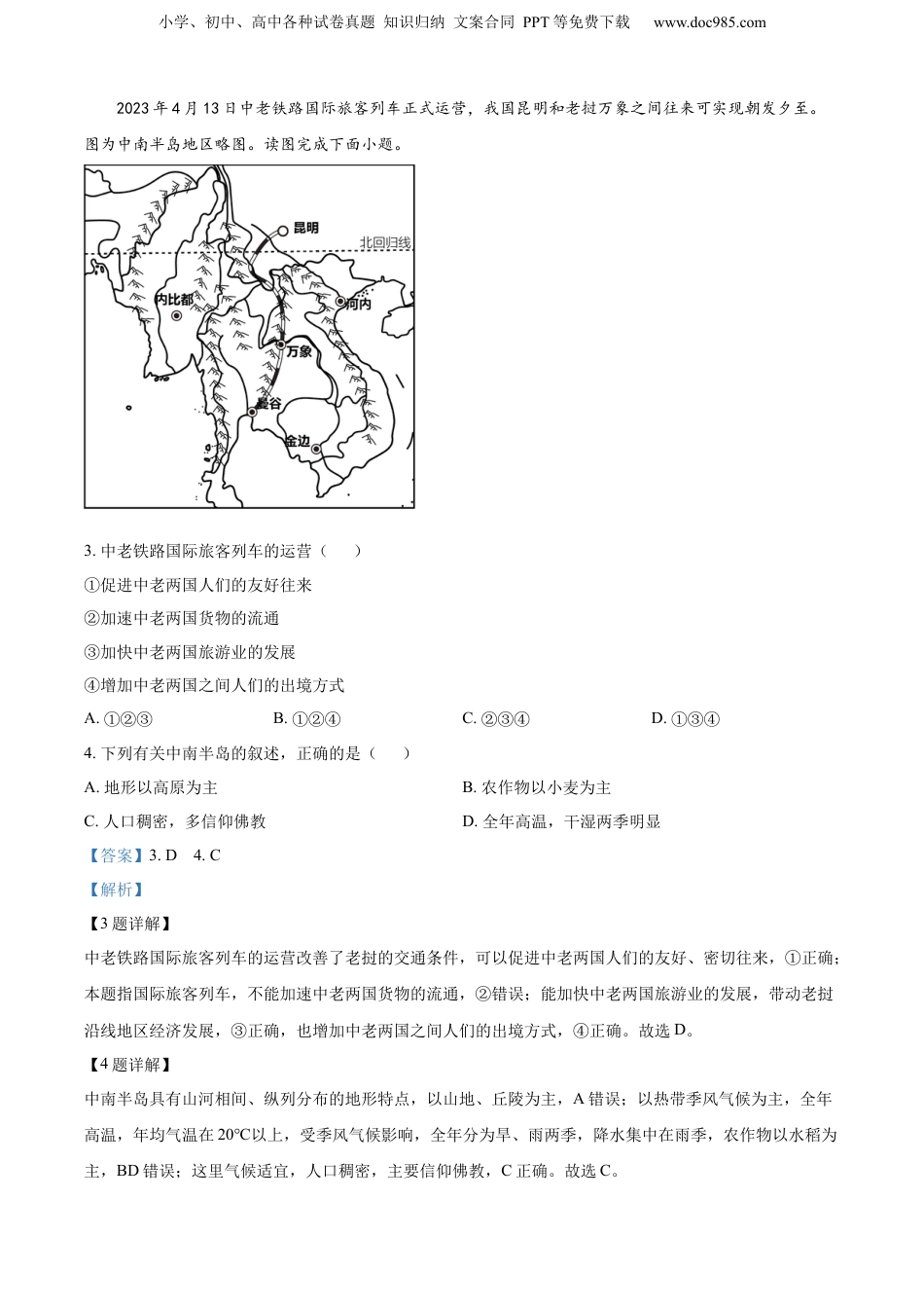 小学、初中、高中各种试卷真题知识归纳文案合同PPT等免费下载www.doc985.com2023年邵阳市初中学业水平考试试题卷地理一、选择题:本大题共20个小题,每小题3分,共60分。每小题给出的四个选项中,只有一个选项最符合题意。下表为世界七大洲面积占比表。读表完成下面小题。大洲亚洲①北美洲南美洲南极洲②大洋洲面积占比29.3%20.2%16.1%12%9.3%7.1%6%1.下列有关①②两洲的说法,正确的是()A.①大洲是欧洲B.②大洲濒临印度洋C.①②两大洲的分界线是直布罗陀海峡D.①大洲位于②大洲以北2.下列叙述,正确的是()A.亚洲人口自然增长率居世界首位B.南美洲混血种人数量多C.南极洲全部位于南极圈以内D.北美洲地形以平原为主【答案】1.C2.B【解析】【1题详解】全球共有七大洲,按面积由大到小排列分别为:亚洲、①非洲、北美洲、南美洲、南极洲、②欧洲和大洋洲,A错误。②欧洲北临北冰洋,西临大西洋,南临地中海,B错误。①非洲和②欧洲的分界线是直布罗陀海峡、地中海,C正确。①非洲位于②欧洲的南部,D错误。故选C。【2题详解】七大洲中,非洲人口自然增长率居世界首位,A错误。南美洲混血人种多,来自不同地域的文化相互融合、发展,形成了具有特色的南美文化,B正确。南极洲绝大部分位于南极圈以内,是跨经度最广的大洲,C错误。北美洲地形分为三大南北纵列带:西部是高大的山系,中部是广阔的平原,东部是低缓的高地,地形主要以山地、平原为主,D错误。故选:B。【点睛】全球共有七大洲,包括亚洲、非洲、北美洲、南美洲、南极洲、欧洲和大洋洲;全球共有四大洋,包括太平洋、大西洋、印度洋、北冰洋。小学、初中、高中各种试卷真题知识归纳文案合同PPT等免费下载www.doc985.com2023年4月13日中老铁路国际旅客列车正式运营,我国昆明和老挝万象之间往来可实现朝发夕至。图为中南半岛地区略图。读图完成下面小题。3.中老铁路国际旅客列车的运营()①促进中老两国人们的友好往来②加速中老两国货物的流通③加快中老两国旅游业的发展④增加中老两国之间人们的出境方式A.①②③B.①②④C.②③④D.①③④4.下列有关中南半岛的叙述,正确的是()A.地形以高原为主B.农作物以小麦为主C.人口稠密,多信仰佛教D.全年高温,干湿两季明显【答案】3.D4.C【解析】【3题详解】中老铁路国际旅客列车的运营改善了老挝的交通条件,可以促进中老两国人们的友好、密切往来,①正确;本题指国际旅客列车,不能加速中老两国货物的流通,②错误;能加快中老两国旅游业的发展,带动老挝沿线地区经济发展,③正确,也增加中老两国之间人们的出境方式,④正确。故选D。【4题详解】中南半岛具有山河相间、纵列分布的地形特点,以山地、丘陵为主,A错误;以热带季风气候为主,全年高温,年均气温在20℃以上,受季风气候影响,全年分为旱、雨两季,降水集中在雨季,农作物以水稻为主,BD错误;这里气候适宜,人口稠密,主要信仰佛教,C正确。故选C。小学、初中、高中各种试卷真题知识归纳文案合同PPT等免费下载www.doc985.com【点睛】老挝人民民主共和国,简称老挝。是一个位于中南半岛北部的内陆国,北邻中国,南接柬埔寨,东临越南,西北毗邻缅甸,西南毗邻泰国,国土面积23.68万平方公里,人口700万(2018年),首都万象。东南亚包括中南半岛和马来群岛。2023年4月12日至15日巴西总统卢拉访问中国,开启了中巴两国友谊新篇章。图为巴西简图。读图完成下面小题。5.巴西()A.被称为“咖啡王国”B.西临太平洋,东临大西洋C.狂欢节、芭蕾舞享誉世界D.核工业和航空航天工业发达6.下列有关中巴两国的叙述,不正确的是()A.中巴分别是东西半球最大的发展中国家B.中国从巴西进口的农产品有蔗糖、大豆等C.中巴两国之间的合作优势互补,互惠互利D.中巴之间的政治、经济商谈称为“南北对话”【答案】5.A6.D【解析】【5题详解】“咖啡王国”——巴西,拉美大国巴西以咖啡质优、味浓而驰名全球,是世界上最大的咖啡生产国和出口国,素有“咖啡王国”之称,A正确;巴西东临大西洋,西不临太平洋,B错误;芭蕾舞源于意大利,狂欢节是巴西的节日,C错误;俄罗斯核工业和航空航天工业发达,巴西不发达,D错误。故选A。【...