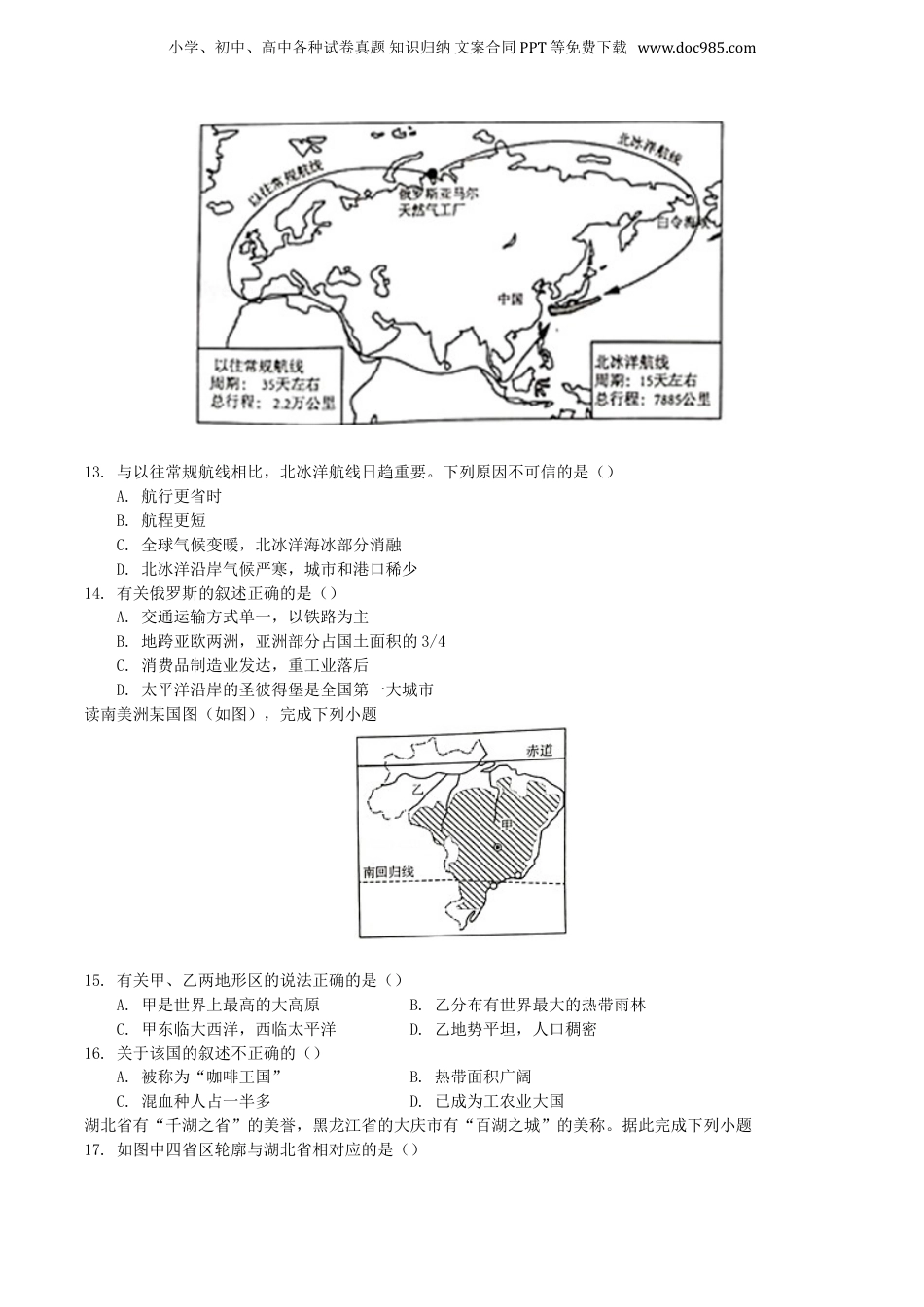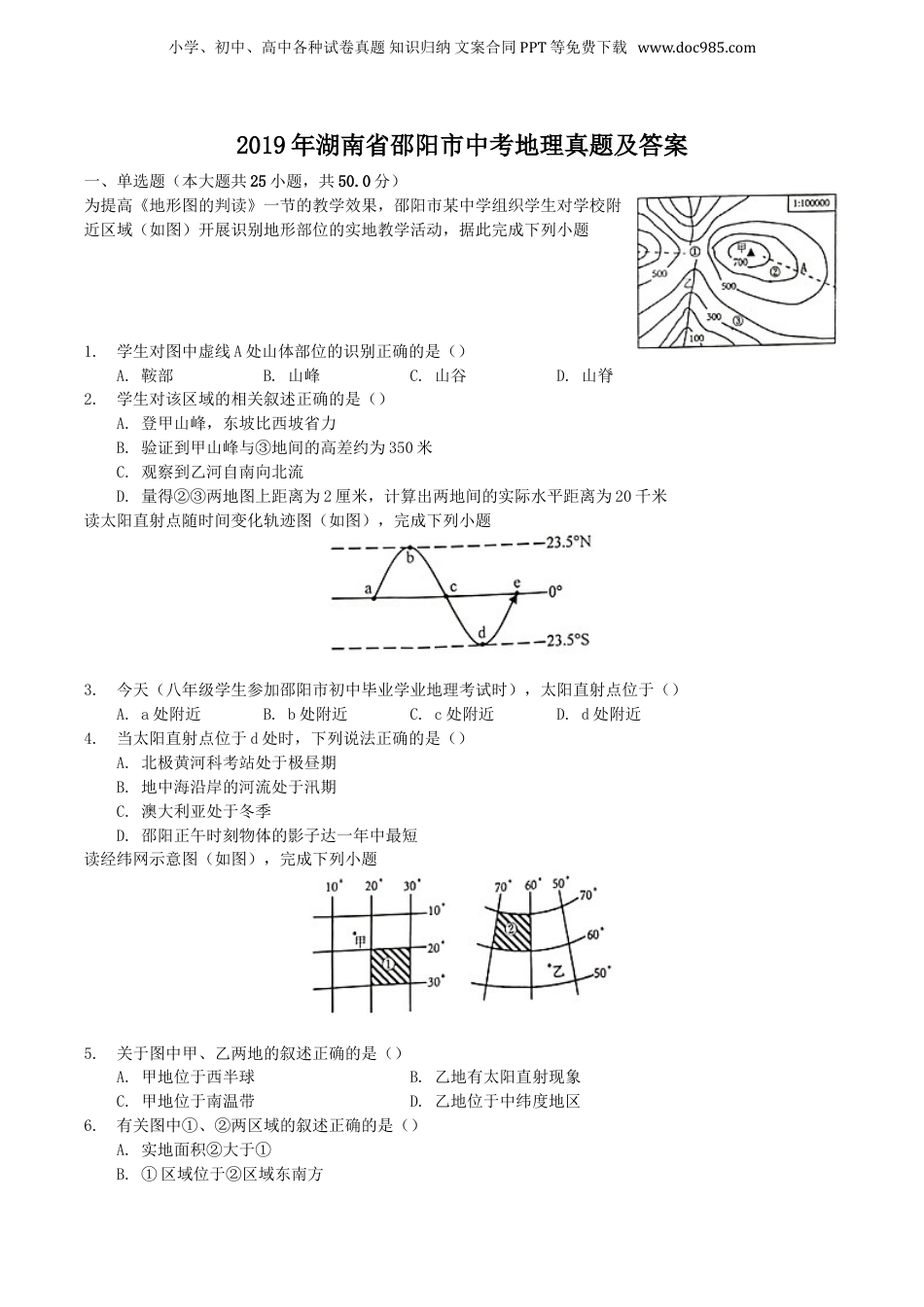 小学、初中、高中各种试卷真题知识归纳文案合同PPT等免费下载www.doc985.com2019年湖南省邵阳市中考地理真题及答案一、单选题(本大题共25小题,共50.0分)为提高《地形图的判读》一节的教学效果,邵阳市某中学组织学生对学校附近区域(如图)开展识别地形部位的实地教学活动,据此完成下列小题1.学生对图中虚线A处山体部位的识别正确的是()A.鞍部B.山峰C.山谷D.山脊2.学生对该区域的相关叙述正确的是()A.登甲山峰,东坡比西坡省力B.验证到甲山峰与③地间的高差约为350米C.观察到乙河自南向北流D.量得②③两地图上距离为2厘米,计算出两地间的实际水平距离为20千米读太阳直射点随时间变化轨迹图(如图),完成下列小题3.今天(八年级学生参加邵阳市初中毕业学业地理考试时),太阳直射点位于()A.a处附近B.b处附近C.c处附近D.d处附近4.当太阳直射点位于d处时,下列说法正确的是()A.北极黄河科考站处于极昼期B.地中海沿岸的河流处于汛期C.澳大利亚处于冬季D.邵阳正午时刻物体的影子达一年中最短读经纬网示意图(如图),完成下列小题5.关于图中甲、乙两地的叙述正确的是()A.甲地位于西半球B.乙地有太阳直射现象C.甲地位于南温带D.乙地位于中纬度地区6.有关图中①、②两区域的叙述正确的是()A.实地面积②大于①B.①区域位于②区域东南方小学、初中、高中各种试卷真题知识归纳文案合同PPT等免费下载www.doc985.comC.春分日,白昼时间①长于②D.图幅相同的①②两区域,比例尺①大于②2019年4月15日,当地时间18时左右,世界著名的文化遗产巴黎圣母院失火,遭受重大损失。据此完成7~8题。7.下列著名建筑与巴黎圣母院属于同一个国家的是()A.白金汉宫B.罗马古斗兽场C.卢浮宫D.奥林匹克遗址公园8.下列有关文化遗产及其保护的叙述不正确的是()A.文化遗产是了解当时人们生活情况的一部活的“百科全书”B.四合院和胡同承载着北京的传统文化,是北京特有的城市风貌C.云南丽江古城改建成现代化商业城市D.意大利著名水城威尼斯保持河多桥多的特色大洋洲国家巴布亚新几内亚盛产咖啡,该国咖啡一般生长在海拔1500米左右的高地,具有独特的苹果酸,是支撑经济的“黑色黄金”。结合下图完成下列小题。9.试推断该国适合咖啡生长的气候条件()A.位于热带,气候湿热B.光照充足,气温年较差大C.气候高寒,年降水量稀少D.全年温和,降水均匀10.巴布亚新几内亚的咖啡远销中国、澳大利亚、美国等国,说明()A.发达国家以生产和出口初级农矿产品为主B.国家间不需开展合作交流、取长补短C.发展中国家农业专业化、现代化水平高D.国家间要进行“南北对话”和“南南合作”乞力马扎罗山是非洲最高峰,位于赤道附近,却有“赤道雪峰”之称。据此完成下列小题11.乞力马扎罗山出现“赤道雪峰”奇景的原因是()A.地形地势B.海陆位置C.半球位置D.纬度位置12.下列关于非洲的叙述不正确的是()A.地形以高原为主,有“高原大陆”之称B.尼罗河自北向南注入地中海C.撒哈拉以南非洲是黑种人的故乡D.人口自然增长率居世界各大洲首位从俄罗斯亚马尔天然气工厂运送天然气到东亚各港口,有经大西洋的以往常规航线和经白令海峡的北冰洋航线(如图)。据此完成下列小题小学、初中、高中各种试卷真题知识归纳文案合同PPT等免费下载www.doc985.com13.与以往常规航线相比,北冰洋航线日趋重要。下列原因不可信的是()A.航行更省时B.航程更短C.全球气候变暖,北冰洋海冰部分消融D.北冰洋沿岸气候严寒,城市和港口稀少14.有关俄罗斯的叙述正确的是()A.交通运输方式单一,以铁路为主B.地跨亚欧两洲,亚洲部分占国土面积的3/4C.消费品制造业发达,重工业落后D.太平洋沿岸的圣彼得堡是全国第一大城市读南美洲某国图(如图),完成下列小题15.有关甲、乙两地形区的说法正确的是()A.甲是世界上最高的大高原B.乙分布有世界最大的热带雨林C.甲东临大西洋,西临太平洋D.乙地势平坦,人口稠密16.关于该国的叙述不正确的()A.被称为“咖啡王国”B.热带面积广阔C.混血种人占一半多D.已成为工农业大国湖北省有“千湖之省”的美誉,黑龙江省的大庆市有“百湖之城”的美称。据此完成下列小题17.如图中四省区轮廓与湖北省相对...