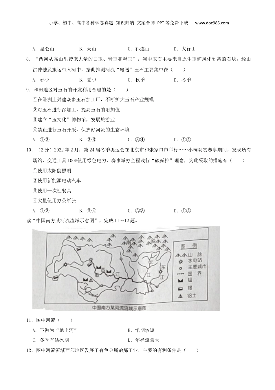 小学、初中、高中各种试卷真题知识归纳文案合同PPT等免费下载www.doc985.com2022年湖南省娄底市中考地理试卷三、选择题(每小题只有一项最符合题意的答案)(52分)王之涣(唐)《凉州词》:“黄河远上白云间,一片孤城万仞山。羌笛何须怨杨柳,春风不度玉门关。”(“玉门关”在今甘肃敦煌市西)。欣赏唐诗完成1~2题。1.“春风不度玉门关”,从地理学的角度来看,源于海洋的“春风”到达“玉门关”后已属强弩之末,难以再向内陆前行。诗中所写“春风”所到之处最可能出现的天气是()A.春风送暖入屠苏B.热风吹雨酒江天C.月落乌啼霜满天D.北风卷地白草折2.依米慕古人情怀,想体验诗中描绘的那种苍凉壮阔的景色,去哪个地区是最佳的选择()A.南方地区B.北方地区C.西北地区D.青藏地区“世界灌溉工程遗产”郑国渠开凿始于战国时期,开凿难度极大。古代劳动人民依靠双手,在崇山峻岭中,凿石挖土,肩挑背扛,挥汗如雨,前后苦干十年,开凿了一条长达150多千米的浩大河道,使渭河以北的关中沃野得到自流灌溉。读郑国渠及其附近区域地形分布图,完成3~4题。3.郑国渠是我国古代劳动人民辛勤劳动和智慧的结晶,巧妙利用自然条件实现自流灌溉,郑国渠的流向是()A.东北向西南B.西南向东北C.东南向西北D.西北向东南4.“谁知盘中餐,粒粒皆辛苦。”每粒粮食都来自劳动者的汗水,我国劳动人民在郑国渠自流灌溉的农田上辛勤耕种,种植的主要粮食作物可能是()A.甜菜B.甘蔗C.水稻D.小麦小学、初中、高中各种试卷真题知识归纳文案合同PPT等免费下载www.doc985.com孟煦东歌曲《2035去台湾》:“坐上那动车去台湾,就在那2035年,去看看那外婆澎湖湾,还有那脚印两对半。坐上那动车去台湾,就在那2035年,去看看那情歌阿里山,还有那神奇的日月潭……”欣赏歌曲结合所学知识完成5~6题。5.该歌曲2021年9月发布后,迅速火爆海峡两岸,引起两岸同胞的强烈共鸣,说明()A.高铁这张“中国名片”已经享誉世界B.阿里山、澎湖湾等自然风景异常秀丽C.两岸同根同源,对实现祖国统一有着共同的期盼D.海峡两岸即将陆地相连,密不可分6.“坐上那动车去台湾”,寄托了两岸同胞热切期盼修建高铁连通两地的愿望……假如2035年,规划中连接福州到台北的高铁建成,对台湾产生的积极影响是()①促进台湾旅游业的发展②促进台湾水稻种植、水果栽培和畜牧业等产业的发展③促进台湾与祖国大陆科技、文化的交流④促进台湾森林、矿产等资源的开发利用A.①②B.③④C.②④D.①③“临江之畔,璞石无光,千年磨砺,温润有方。”这是对和田玉最好的描述。玉龙喀什河源于莽莽高山,流入塔里木盆地后,与西边的喀拉喀什河汇合成和田河,两河从高山里带来大量的白玉、青玉和墨玉,和田自古出美玉。读和田河及附近地区示意图,完成7~9题。7.“玉龙喀什河源于莽莽高山”指的是()小学、初中、高中各种试卷真题知识归纳文案合同PPT等免费下载www.doc985.comA.昆仑山B.天山C.祁连山D.太行山8.“两河从高山里带来大量的白玉、青玉和墨玉”。河中玉石主要来自原生玉矿风化剥离的石块,经山洪冲蚀及搬运带入河中,据此推测河流“输送”玉石主要集中在()A.春季B.夏季C.秋季D.冬季9.和田地区对玉石的开发利用合理的是()①在绿洲上兴建众多玉石加工厂,不断扩大玉石产业规模②对玉石进行深加工,提高玉石的附加值③建立“玉文化”博物馆,发展旅游业④禁止进行玉石开采,保护好河流的生态环境A.①②B.②③C.③④D.①④10.(2分)2022年2月,第24届冬季奥运会在北京市和张家口市举行……小桐观赏赛事期间,发现所有场馆、交通工具100%使用绿色电力,赛事举办全程践行“碳减排”理念,为此采取的措施有()①使用太阳能照明②使用新能源电动汽车③使用一次性餐具④大量使用办公纸张A.①②B.③④C.②③D.①④读“中国南方某河流流域示意图”,完成11~12题。11.图中河流()A.下游为“地上河”B.汛期较短C.冬季有结冰期D.年径流量大12.图中河流流域西部地区发展了有色金属冶炼工业,主要的有利条件是()小学、初中、高中各种试卷真题知识归纳文案合同PPT等免费下载www.doc...