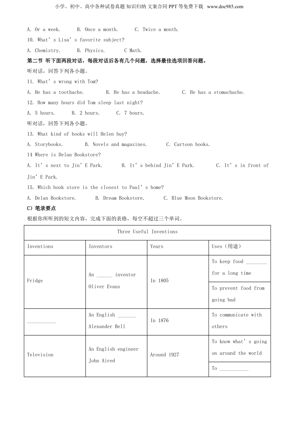 小学、初中、高中各种试卷真题知识归纳文案合同PPT等免费下载www.doc985.com2020年湖南岳阳中考英语试题及答案I.听力技能(共三部分,每段材料读两遍。)A)图片理解从每小题所给的三幅图中选出与你所听到的对话内容相同或相近的图画。1.A.B.C.2.A.B.C.3.A.B.C.4.A.B.C.5.A.B.C.B)对话理解根据你所听到的对话内容,选择最佳选项回答问题。听对话,回答下列各小题。6.Whattimeisitnow?A.9:00.B.9:15.C.9:30.7.What’stheweatherlike?A.Sunny.B.Snowy.C.Rainy.8.WheredidMandygoonvacation?A.Guizhou.B.Shanghai.C.Hangzhou.9.Howoftendoesthegirlgototheconcert?小学、初中、高中各种试卷真题知识归纳文案合同PPT等免费下载www.doc985.comA.Oraweek.B.Onceamonth.C.Twiceamonth.10.What’sLisa’sfavoritesubject?A.Chemistry.B.Physics.CMath.第二节听下面两段对话,每段对话后各有几个问题,选择最佳选项回答问题。听对话,回答下列各小题。11.What’swrongwithTom?A.Hehasatoothache.B.Hehasaheadache.C.Hehasastomachache.12.HowmanyhoursdidTomsleeplastnight?A.5hours.B.2hours.C.7hours.听对话,回答下列各小题。13.WhatkindofbookswillHelenbuy?A.Storybooks.B.Novelsandmagazines.C.Cartoonbooks.14WhereisDelanBookstore?A.It’snexttoJin’EPark.B.It’sbehindJin’EPark.C.It’sinfrontofJin’EPark.15.WhichbookstoreistheclosesttoPaul’shome?A.DelanBookstore.B.DreamBookstore.C.BlueMoonBookstore.C)笔录要点根据你所听到的短文内容,完成下面的表格,每空不超过三个单词。ThreeUsefulInventionsInventionsInventorsYearsUses(用途)FridgeAn______inventorOliverEvansIn1805Tokeepfood________foralongtimeTopreventfoodfromgoingbad___________AnEnglish_______AlexanderBellIn1876TocommunicatewithothersTelevisionAnEnglishengineerJohnAiredAround1927Toknowwhat’sgoingonaroundtheworldTo___________小学、初中、高中各种试卷真题知识归纳文案合同PPT等免费下载www.doc985.comII.知识运用A)单项填空从A、B、C三个选项中选择一个最佳答案。1.Ittookushalf___________hourtoreadLittleWomen.A.aB.anC.the【答案】B2.Thefamilyphotosaren’tin___________room,itmustbein___________.A.my;hisB.his;myC.me;his【答案】A3.Mikedoesn’thaveenoughmoney,sohecanonlyafford____________.A.abreadB.toomuchbreadC.apieceofbread【答案】C4.ThemovieNezhais__________educational________Iwanttoseeitagain.A.so;thatB.such;thatC.too;to【答案】A5.Chinaisover5,000yearsold.Ithasamuch__________historythantheUSA.A.longB.longerC.longest【答案】B6.Theschool____________thesportsmeetingbecauseofthebadweather.A.putoffB.putupC.puton【答案】A7.Ihaven’tseenmybestfriendLucyfor2months.I’mlookingforwardto______________avideocallwithher.A.haveB.havingC.has【答案】B8.SilverTealeaves__________byhandinJunshanIsland.A.ispickedB.arepickedC.picks【答案】B9.Iwonder___________________A.whenChinasentthelastBeidouSatellite(北斗卫星).B.whendidChinasendthelastBeidouSatellite.C.whendoesChinasendthelastBeidouSatellite.【答案】A10.—WhatdoyouthinkofTeenagerSaid(少年说)?—____________小学、初中、高中各种试卷真题知识归纳文案合同PPT等免费下载www.doc985.comA.Youarewelcome.B.Goodluck.C.Iloveit.【答案】CB)完型填空通读全文,掌握其大意,然后从各题所给的A、B、C三个选项中选出一个最佳答案。ManypeopleareplayingaroleinsavingtheearthonEarthDay.EarthDayisonApril22nd.Lotsofpeopleallovertheworldtrytodosomething___11___onthisday.InChina,peopleexpectedtokeeplightsoffforonehouratnight.Peopledon’tuse___12___inItaly.Peopledressuplike___13___andanimalstodanceinTimesSquare,NewYork(纽约时代广场).Onthatday,peoplecanseemanypostersaboutprotecting___14___animalsinCanadaandNorway(挪威).Afte...