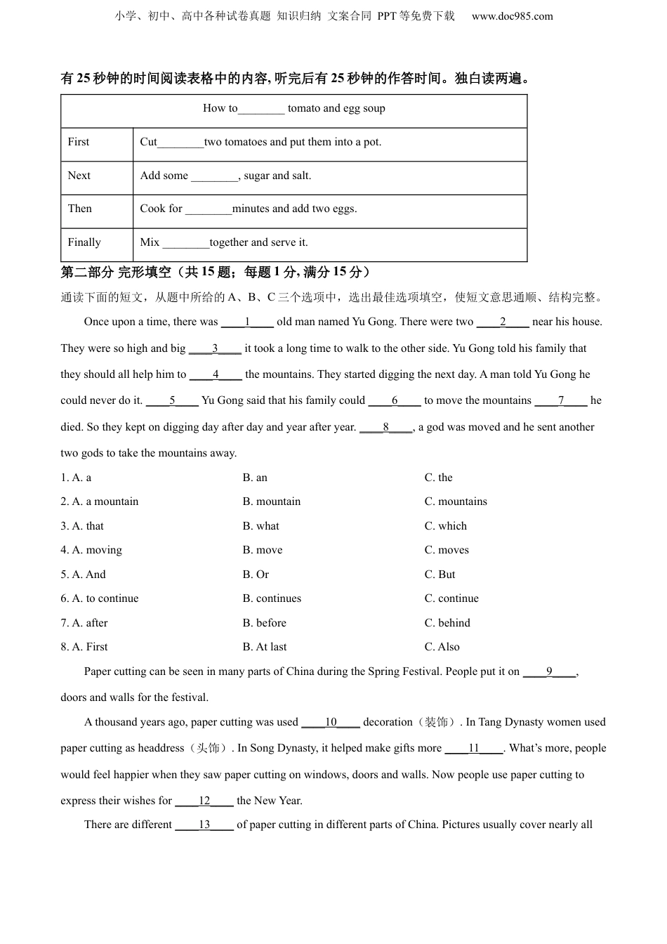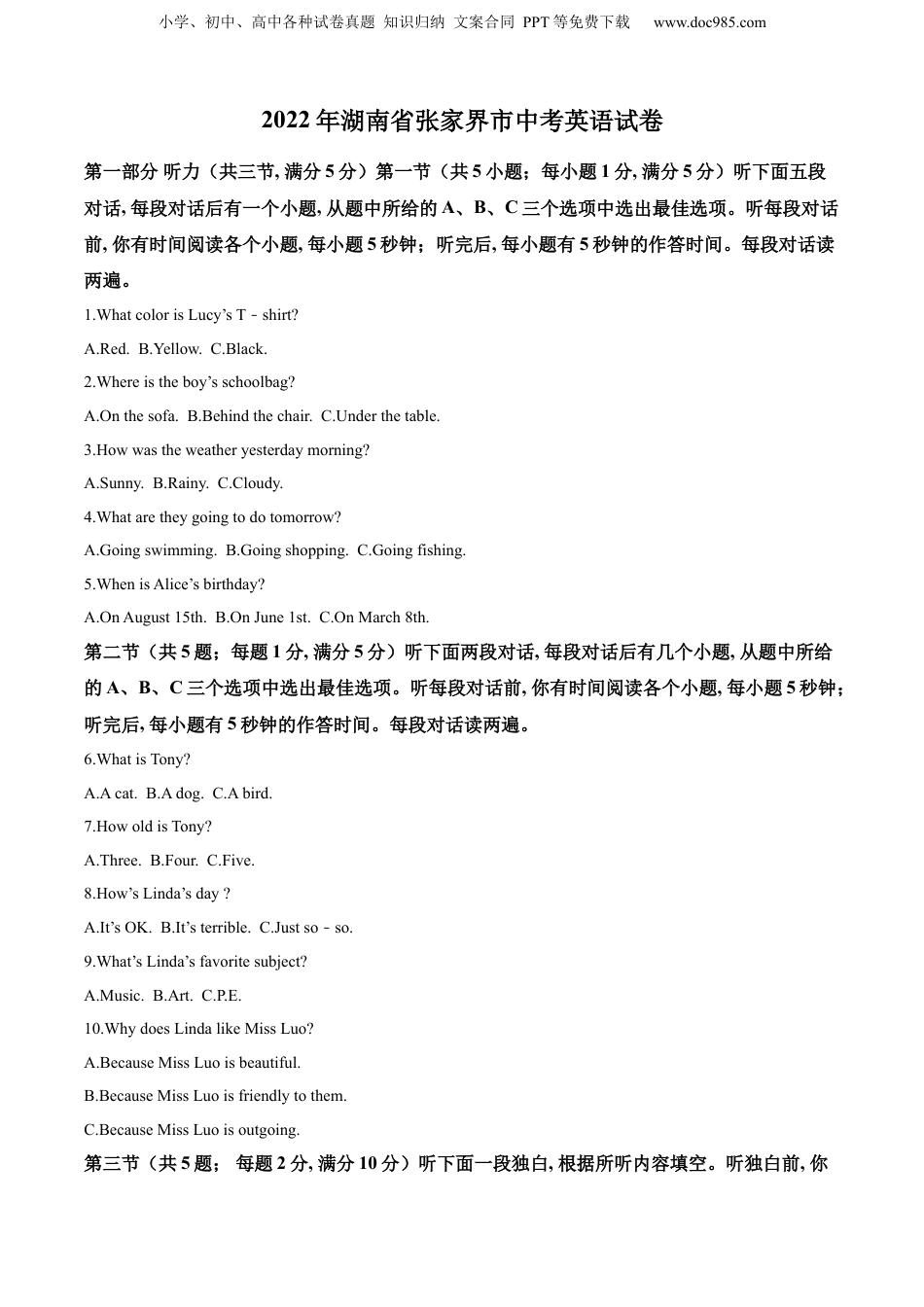 小学、初中、高中各种试卷真题知识归纳文案合同PPT等免费下载www.doc985.com2022年湖南省张家界市中考英语试卷第一部分听力(共三节,满分5分)第一节(共5小题;每小题1分,满分5分)听下面五段对话,每段对话后有一个小题,从题中所给的A、B、C三个选项中选出最佳选项。听每段对话前,你有时间阅读各个小题,每小题5秒钟;听完后,每小题有5秒钟的作答时间。每段对话读两遍。1.WhatcolorisLucy’sT﹣shirt?A.Red.B.Yellow.C.Black.2.Whereistheboy’sschoolbag?A.Onthesofa.B.Behindthechair.C.Underthetable.3.Howwastheweatheryesterdaymorning?A.Sunny.B.Rainy.C.Cloudy.4.Whataretheygoingtodotomorrow?A.Goingswimming.B.Goingshopping.C.Goingfishing.5.WhenisAlice’sbirthday?A.OnAugust15th.B.OnJune1st.C.OnMarch8th.第二节(共5题;每题1分,满分5分)听下面两段对话,每段对话后有几个小题,从题中所给的A、B、C三个选项中选出最佳选项。听每段对话前,你有时间阅读各个小题,每小题5秒钟;听完后,每小题有5秒钟的作答时间。每段对话读两遍。6.WhatisTony?A.Acat.B.Adog.C.Abird.7.HowoldisTony?A.Three.B.Four.C.Five.8.How’sLinda’sday?A.It’sOK.B.It’sterrible.C.Justso﹣so.9.What’sLinda’sfavoritesubject?A.Music.B.Art.C.P.E.10.WhydoesLindalikeMissLuo?A.BecauseMissLuoisbeautiful.B.BecauseMissLuoisfriendlytothem.C.BecauseMissLuoisoutgoing.第三节(共5题;每题2分,满分10分)听下面一段独白,根据所听内容填空。听独白前,你小学、初中、高中各种试卷真题知识归纳文案合同PPT等免费下载www.doc985.com有25秒钟的时间阅读表格中的内容,听完后有25秒钟的作答时间。独白读两遍。Howto________tomatoandeggsoupFirstCut________twotomatoesandputthemintoapot.NextAddsome________,sugarandsalt.ThenCookfor________minutesandaddtwoeggs.FinallyMix________togetherandserveit.第二部分完形填空(共15题;每题1分,满分15分)通读下面的短文,从题中所给的A、B、C三个选项中,选出最佳选项填空,使短文意思通顺、结构完整。Onceuponatime,therewas____1____oldmannamedYuGong.Thereweretwo____2____nearhishouse.Theyweresohighandbig____3____ittookalongtimetowalktotheotherside.YuGongtoldhisfamilythattheyshouldallhelphimto____4____themountains.Theystarteddiggingthenextday.AmantoldYuGonghecouldneverdoit.____5____YuGongsaidthathisfamilycould____6____tomovethemountains____7____hedied.Sotheykeptondiggingdayafterdayandyearafteryear.____8____,agodwasmovedandhesentanothertwogodstotakethemountainsaway.1.A.aB.anC.the2.A.amountainB.mountainC.mountains3.A.thatB.whatC.which4.A.movingB.moveC.moves5.A.AndB.OrC.But6.A.tocontinueB.continuesC.continue7.A.afterB.beforeC.behind8.A.FirstB.AtlastC.AlsoPapercuttingcanbeseeninmanypartsofChinaduringtheSpringFestival.Peopleputiton____9____,doorsandwallsforthefestival.Athousandyearsago,papercuttingwasused____10____decoration(装饰).InTangDynastywomenusedpapercuttingasheaddress(头饰).InSongDynasty,ithelpedmakegiftsmore____11____.What’smore,peoplewouldfeelhappierwhentheysawpapercuttingonwindows,doorsandwalls.Nowpeopleusepapercuttingtoexpresstheirwishesfor____12____theNewYear.Therearedifferent____13____ofpapercuttingindifferentpartsofChina.Picturesusuallycovernearlyall小学、初中、高中各种试卷真题知识归纳文案合同PPT等免费下载www.doc985.comthings,fromflowers,birdstothefamouspeople.Now,there____14____factoriesforpapercuttinginChina.Papercuttinghaschangedfromdecorationtoakindofart.Atthesametime,papercutting____15____appearsincartoons,magazinesorTVprograms.9.A.floorsB.desksC.windows10.A.forB.offC.of11.A.uglyB.beautifulC.bad12.A.welcomeB.welcomingC.welcomes13.A.kindB.akindC.kinds14.A.amB.isC.are15.A...