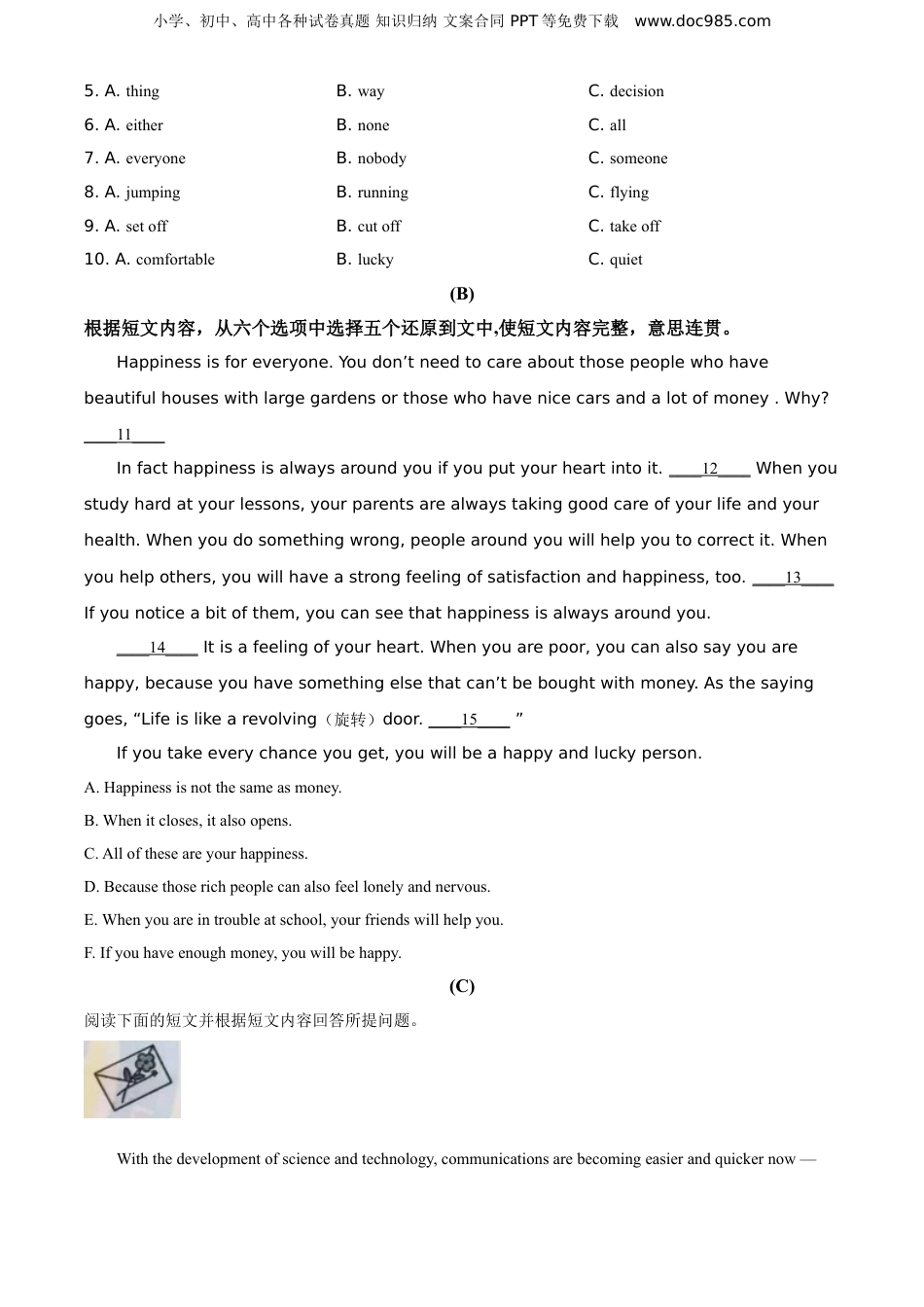 小学、初中、高中各种试卷真题知识归纳文案合同PPT等免费下载www.doc985.com湖南省衡阳市2021年中考英语试题(原卷版)考生注意:1.本试卷分试题卷和答题卡两部分。2.全部答案必须按要求写在答题卡中对应题号的方格里。要求书写工整、清晰、规范,卷面整洁。3.选择题最符合题意的答案只有1个。不选、多选、错选、涂写不清或是不填答案编号字母而抄写英语答案的,均不给分。4.本试卷共两大题,56小题,满分100分。考试时量90分钟。5.完卷后,答题卡和试题卷分别交回。I.阅读技能(六个部分。共35小题,计60分)(A)Manyyearsago,therewasakingwholikedfalcons(猎鹰)verymuch.Onceheget____1____nicefalcons.Hehadnotseensuchbeautifulfalconsbefore.Helovedthemsomuchthatheorderedthebestfalconerto____2____themtofly.Afterseveralmonths,thekindcametosee____3____thetrainingwasgoingon.Hefoundthatonefalconhadalreadybeenabletoflyhighinthesky,whiletheotheronewasstayingatthebranch(树枝)ofatree____4____withoutmoving.Thekingcalledallhisfalconerstogetherandorderedthemtotryevery____5____theycouldtomakeitfly.But____6____ofthemsuccessful.Oneday,whilethekingwastakingawalkintheforest,anideacametohismind.Hedecidedtofind____7____whoknewthenaturalenvironmentwelltosolvetheproblem.Thenhesentforafarmerwholivedintheforestintohispalacetotrainitatonce.Thenextmorning,thekingsawtheotherfalcon____8____aboveintheskyfreely.“Itisunbelievable!”shoutedtheking.“Howcouldyoumakeithappen?”Thefarmerreplied,“It’sveryeasy.Ijust____9____thebranchwherethefalconrested.”Itisalwaysthesametohumans.Weallhave“twoflyingwings”inourheartsaswell,butweoftenseemnottonoticethemandstaywherewefeelsafeand____10____.Wewon’trealizewecanflysohighandfreelyuntilthe“branch”wearerestingonbreaks.1.A.twoB.threeC.four2.A.trainB.keepC.feed3.A.whatB.howC.when4.A.happilyB.freelyC.quietly小学、初中、高中各种试卷真题知识归纳文案合同PPT等免费下载www.doc985.com5.A.thingB.wayC.decision6.A.eitherB.noneC.all7.A.everyoneB.nobodyC.someone8.A.jumpingB.runningC.flying9.A.setoffB.cutoffC.takeoff10.A.comfortableB.luckyC.quiet(B)根据短文内容,从六个选项中选择五个还原到文中,使短文内容完整,意思连贯。Happinessisforeveryone.Youdon’tneedtocareaboutthosepeoplewhohavebeautifulhouseswithlargegardensorthosewhohavenicecarsandalotofmoney.Why?____11____Infacthappinessisalwaysaroundyouifyouputyourheartintoit.____12____Whenyoustudyhardatyourlessons,yourparentsarealwaystakinggoodcareofyourlifeandyourhealth.Whenyoudosomethingwrong,peoplearoundyouwillhelpyoutocorrectit.Whenyouhelpothers,youwillhaveastrongfeelingofsatisfactionandhappiness,too.____13____Ifyounoticeabitofthem,youcanseethathappinessisalwaysaroundyou.____14____Itisafeelingofyourheart.Whenyouarepoor,youcanalsosayyouarehappy,becauseyouhavesomethingelsethatcan’tbeboughtwithmoney.Asthesayinggoes,“Lifeislikearevolving(旋转)door.____15____”Ifyoutakeeverychanceyouget,youwillbeahappyandluckyperson.A.Happinessisnotthesameasmoney.B.Whenitcloses,italsoopens.C.Alloftheseareyourhappiness.D.Becausethoserichpeoplecanalsofeellonelyandnervous.E.Whenyouareintroubleatschool,yourfriendswillhelpyou.F.Ifyouhaveenoughmoney,youwillbehappy.(C)阅读下面的短文并根据短文内容回答所提问题。Withthedevelopmentofscienceandtechnology,communicationsarebecomingeasierandquickernow—小学、初中、高中各种试卷真题知识归纳文案合同PPT等免费下载www.doc985.compeoplecanusetelephones,cellphones,faxmachinesandtheInternet.Itmeansthatweseldomwritelettersnow.ButaTVshow,LettersAlive(《见字如面》),isbring...