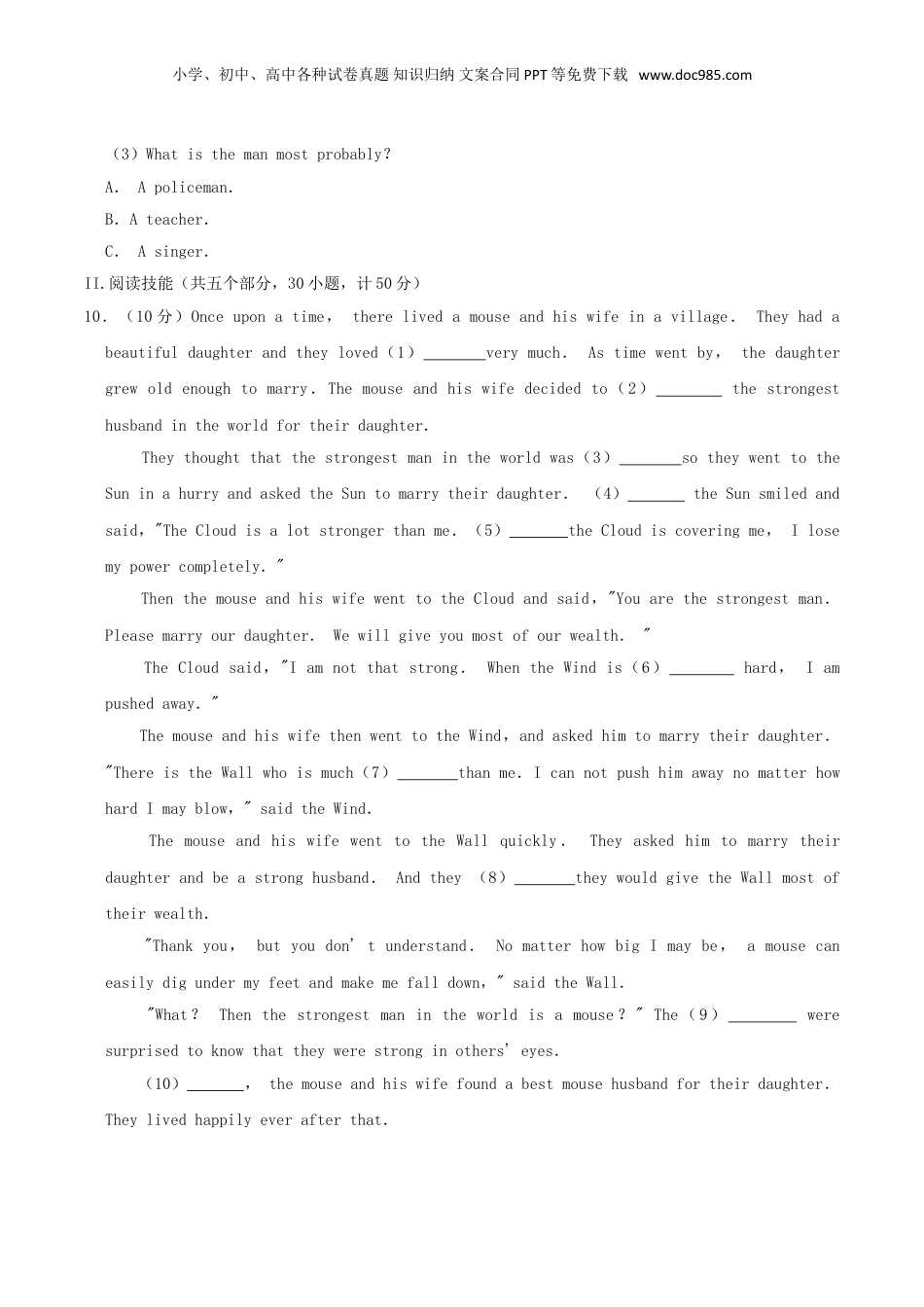 小学、初中、高中各种试卷真题知识归纳文案合同PPT等免费下载www.doc985.com2020年湖南省衡阳市中考英语真题及答案I.听力技能(共一个部分,15小题,计15分)对话理解.根据你所听到的对话,从A、B、C三个选项中选择最佳选项回答问题.听下面五段对话,每听完一段对话,回答一个小题.1.(1分)Whoisreading?A.Lily.B.Tom.C.Lucy.2.(1分)Whatistheweatherlike?A.Sunny.B.Snowy.C.Rainy.3.(1分)HowdidBillycometoschoolyesterday?A.Bybike.B.Bybus.C.Bysubway.4.(1分)WhatdoesMarylikebest?A.Pizza.B.Sushi.C.Friedrice.5.(1分)WhatwillthewomanhavetodonextFriday?A.Haveaclass.B.Haveameeting.C.Giveaspeech.6.(2分)听第六段对话,回答下列小题.(1)Whatwilltheboydotomorrow?A.Flykites.B.Haveapicnic.C.Makesomefood.(2)Howoftendoestheboyhaveapicnic?A.Onceaweek.B.Twiceamonth.小学、初中、高中各种试卷真题知识归纳文案合同PPT等免费下载www.doc985.comC.Onceamonth.7.(2分)听第七段对话,回答下列小题.(1)WhatcolordoesMr.Greensdaughterlike?A.Red.B.Green.C.White.(2)WhereisMr.Green'sdaughternow?A.InFrance.B.InEngland.C.InAmerica.8.(3分)听第八段对话,回答下列小题.(1)Wherearethespeakers?A.Atacoffeehouse.B.Atadanceschool.C.Inanoffice.(2)Howmaythewomanfeelnow?A.Bored.B.Cool.C.Relaxed.(3)Whodoesthewomanwanttomeethere?A.Ayounglady.B.Anoldwoman.C.Theman.9.(3分)听第九段对话,回答下列小题.(1)WhatwasJanedoingwhenshefoundherbrotherwaslost?A.Shewassingingsongs.B.Shewaslisteningtosongs.C.Shewaswalkinginthestreet.(2)HowoldisJane'sbrother?A.4.B.5.C.6.小学、初中、高中各种试卷真题知识归纳文案合同PPT等免费下载www.doc985.com(3)Whatisthemanmostprobably?A.Apoliceman.B.Ateacher.C.Asinger.II.阅读技能(共五个部分,30小题,计50分)10.(10分)Onceuponatime,therelivedamouseandhiswifeinavillage.Theyhadabeautifuldaughterandtheyloved(1)verymuch.Astimewentby,thedaughtergrewoldenoughtomarry.Themouseandhiswifedecidedto(2)thestrongesthusbandintheworldfortheirdaughter.Theythoughtthatthestrongestmanintheworldwas(3)sotheywenttotheSuninahurryandaskedtheSuntomarrytheirdaughter.(4)theSunsmiledandsaid,"TheCloudisalotstrongerthanme.(5)theCloudiscoveringme,Ilosemypowercompletely."ThenthemouseandhiswifewenttotheCloudandsaid,"Youarethestrongestman.Pleasemarryourdaughter.Wewillgiveyoumostofourwealth."TheCloudsaid,"Iamnotthatstrong.WhentheWindis(6)hard,Iampushedaway."ThemouseandhiswifethenwenttotheWind,andaskedhimtomarrytheirdaughter."ThereistheWallwhoismuch(7)thanme.IcannotpushhimawaynomatterhowhardImayblow,"saidtheWind.ThemouseandhiswifewenttotheWallquickly.Theyaskedhimtomarrytheirdaughterandbeastronghusband.Andthey(8)theywouldgivetheWallmostoftheirwealth."Thankyou,butyoudon'tunderstand.NomatterhowbigImaybe,amousecaneasilydigundermyfeetandmakemefalldown,"saidtheWall."What?Thenthestrongestmanintheworldisamouse?"The(9)weresurprisedtoknowthattheywerestronginothers'eyes.(10),themouseandhiswifefoundabestmousehusbandfortheirdaughter.Theylivedhappilyeverafterthat.小学、初中、高中各种试卷真题知识归纳文案合同PPT等免费下载www.doc985.com(1)A.himB.youC.her(2)A.lookforB.lookafterC.lookup(3)A.theMoonB.theSunC.theEarth(4)A.AlthoughB.ButC.Or(5)A.WhenB.WhereC.What(6)A.pushingB.pullingC.blowing(7)A.weakerB.biggerC.stronger(8)A.promisedB.preventedC.prote...