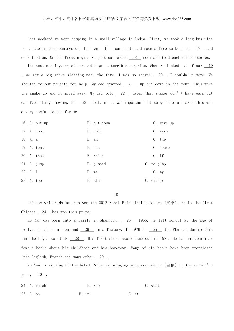 小学、初中、高中各种试卷真题知识归纳文案合同PPT等免费下载www.doc985.com2018年湖南省张家界市中考英语真题及答案注意事项:1、答题前,考生务必将自己的姓名、准考证号写在答题卡和该试题卷的封面上。2、考生作答时,选择题和非选择题均须写在答题卡上,在草稿纸和本试题卷上答题无效。考生在答题卡上按如下要求答题:(1)选择题部分用2B铅笔把对应题目的答案标号所在方框涂黑,修改时用橡皮擦干净,不留痕迹。(2)非选择题部分(包括填空题、回答问题和写作题)请按题号用0.5毫米黑色墨水签字笔书写,否则作答无效。(3)保持字体工整、笔迹清晰、卡面清洁、不折叠。(4)请在各题目的答题区域内作答,超出黑色矩形框的答案无效。3、考试结束后,将本试题卷和答题卡一并交回。4、本试题卷共7页。如缺页,考生须声明,否则后果自负。考生注意:本试卷分为听力、完型填空、阅读理解和写作四部分,满分100分,时量120分钟。第一部分听力(共三节,满分20分)做题时,请先将答案标在试卷上,录音内容结束后,你将有两分钟的时间将答案转涂到答题卡上。第一节(共5小题;每小题1分,满分5分)听下面五段对话,每段对话后有一个小题,从题中所给的A、B、C三个选项中选出最佳选项,并标在试卷的相应位置。听完每段对话后,你都有10秒钟的时间来回答有关小题和阅读下一小题,每段对话读两遍。1.WhatclubdoesLisawanttojoin?A.Thesportsclub.B.Thechessclub.C.Themusicclub.2.IsGraceathome?A.Yes,sheis.B.No,sheisn’t.C.Sorry,Idon’tknow.3.WhydoesTomlikepandas?A.Becausetheyareugly.B.Becausetheyarehandsome.C.Becausetheyarecute.4.HowoftendoesChengTaoread?A.Everyday.B.Twiceaweek.C.Threetimesaweek.5.Whoistaller?A.Bill.B.Laura.C.Bill’seldersister.小学、初中、高中各种试卷真题知识归纳文案合同PPT等免费下载www.doc985.com第二节(共5小题;每小题1分,满分5分)听下面2段对话,每段对话后有2~3个小题,从每题所给的A、B、C三个选项中选出最佳选项,并标在试卷的相应位置。听每段对话前,你将有时间阅读各个小题,每小题5秒钟;听完后各小题将给出5秒钟的作答时间。每段对话读两遍。听第6段对话,回答第6和第7两个小题。6.What’sLindadoing?A.She’scleaningherroom.B.She’sdoingherhomework.C.She’scookingathome.7.WhydoesJimcallLinda?A.Toinvitehertothesupermarket.B.Toinvitehertowatchamovie.C.Toinvitehertohavedinner.听第7段对话,回答第8至第10三个小题。8.WhendidTinagotoSanya?A.Lastsummer.B.Thisspring.C.Thissummer.9.HowdidTinagothere?A.Bybus.B.Byplane.C.Bytrain.10.Didsheplayvolleyball?A.Yes,shedid.B.No,shedidn’t.C.No,shedoesn’t.第三节(共5小题;每小题2分,满分10分)听下面一段独白,根据所听内容填空。听独白前,你将有15秒钟的时间阅读表格中的内容,听完后将给出25秒钟的作答时间。独白念两遍。Greatsale!TimeFrom11toFriday.SpecialsweatersWehavegreensweatersforonly12.ForboysBlack13foronly¥22onthesecondfloor.ForgirlsSkirtsin14foronly¥20onthe15floor.第二部分完型填空(共15小题;每小题1分,满分15分)通读下面短文,从每题所给的A、B、C三个选项中,选出最佳选项填空,使短文意思通顺、结构完整。A小学、初中、高中各种试卷真题知识归纳文案合同PPT等免费下载www.doc985.comLastweekendwewentcampinginasmallvillageinIndia.First,wetookalongbusridetoalakeinthecountryside.Thenwe16ourtentsandmadeafiretokeepus17andcookfoodon.Onthefirstnight,wejustsatunder18moonandtoldeachotherstories.Thenextmorning,mysisterandIgotaterriblesurprise.Whenwelookedoutofour19,wesawabigsnakesleepingnearthefire.Iwassoscared20Icouldn’tmove.Weshoutedtoourparentsforhelp.Mydadstarted21upanddowninthetent.Thiswokethesnakeupanditmovedaway.Mydadtold22laterthatsnakesdon’thaveearsbutcanfeelthingsmoving.He23toldmeitwasimportantnottogonearasnake.Thiswasaveryusefullessonforme.16.A.putupB.putdow...