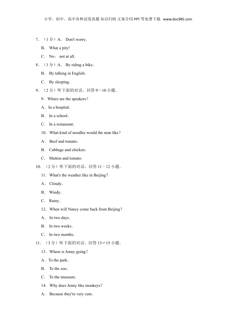 小学、初中、高中各种试卷真题知识归纳文案合同PPT等免费下载www.doc985.com2014年湖南省郴州市中考英语试卷一、听力技能(每小题1分,共20分)1.(1分)2.(1分)3.(1分)4.(1分)A.Allright.B.Thesametoyou.C.Fine,thankyou.5.(1分)A.Thankyou.B.Allright.C.Yes,verywell.6.(1分)A.Nextyear.B.Fortwoyears.C.In2008.小学、初中、高中各种试卷真题知识归纳文案合同PPT等免费下载www.doc985.com7.(1分)A.Don'tworry.B.Whatapity!C.No,notatall.8.(1分)A.Byridingabike.B.BytalkinginEnglish.C.Bysleeping.9.(2分)听下面的对话,回答9~10小题.9.Wherearethespeakers?A.Inahospital.B.Inaschool.C.Inarestaurant.10.Whatkindofnoodleswouldthemanlike?A.Beefandtomato.B.Cabbageandchicken.C.Muttonandtomato.10.(2分)听下面的对话,回答11﹣12小题.11.What'stheweatherlikeinBeijing?A.Cloudy.B.Windy.C.Rainy.12.WhenwillNancycomebackfromBeijing?A.Intwodays.B.Intwoweeks.C.Intwomonths.11.(3分)听下面的对话,回答13〜15小题.13.WhereisJennygoing?A.Tothepark.B.Tothezoo.C.Tothemuseum.14.WhydoesJennylikemonkeys?A.Becausethey'reverycute.小学、初中、高中各种试卷真题知识归纳文案合同PPT等免费下载www.doc985.comB.Becausethey'reugly.C.Becausethey'rescary.15.HowwillJennygetthere?A.Bybike.B.Bycar.C.Bybus.12.(5分)NameFavoriteSubjectReasonTimeMike(16)interesting(17)SallyMath(18)EverydayBillP.E.exciting(19)GinaMusic(20)Thursday二、单项填空(每小题1分,共10分)13.(1分)﹣WhatdoyouthinkoftheprogramDadWhereAreWeGoing?一Ithinkit'sinterestingprogram.()A.aB.anC.the14.(1分)Lastnight,TomandCindyenjoyedatthedancingparty.()A.MyselfB.himselfC.themselves15.(1分)一Wouldyoulikesome﹣No,thankyou.Idon'tlikedrinksatall.()A.CoffeeB.BreadC.meat16.(1分)AboutofthestudentsinourclasslikeEnglishbest.()A.twothirdB.twothirdsC.secondthree17.(1分)一Thearticleiskindofdifficultforme.﹣Takeiteasy.Themoreyouread,theyou'llunderstand.()A.WellB.bestC.better18.(1分)一Whosedictionaryisthis?一notbeAlice's.Herdictionaryishere.()A.CanB.mayC.must小学、初中、高中各种试卷真题知识归纳文案合同PPT等免费下载www.doc985.com19.(1分)Look!WangPingthefloorwithhersister.()A.SweepsB.issweepingC.swept20.(1分)ItissaidthatanairportinChenzhouinafewyears.()A.willbuildB.willbebuiltC.isbuilt21.(1分)一Whatkindofmusicdoyoulike?一IlikemusicIcandanceto.()A.ThatB.whoC.what22.(1分)Doyouknow?()A.whytheearthgoesaroundthesunB.whytheearthgoaroundthesunC.whydoestheearthgoaroundthesun三、完形填空(每小题10分,共10分)23.(10分)Oneafternoon,thetwinbrothers,MartinandLarrydidn'tgohomeafterschool.TheywenttoMolly's(31)tohelpherdothehomework.Whenitwastimeforsupper,Molly'sparentsinvited(32)tohavedinner,butthey(33)andwenthome.Whentheygottothefrontoftheirhouse,theysawa(34)manwhowaslookingforsomethingintheirlivingroom.+Hemustbeathief.,saidLarry,"I'llcallthe(35)andyoutrytotalktohim.,'ThenMartinwentinsidewhileLarry(36)tocallthepolice.WhenthemansawMartin,hesaid,"Maybeyoudon'tknowme,(37)I‘myourfathe'sbestfriend.Hehadaseriousaccidentandhe'sinhospital.Icometogetmoneyforhim.""I'msosorrytohearthat.Waitaminute.Iknowwherethe(38)is."ThenMartinledthemantoabedroomandsaid,"Thereisayellowboxunderthebed.Boandgetit."Themanwassogladthatheclimbedinwithoutthinking.Justatthistime,Marti...
