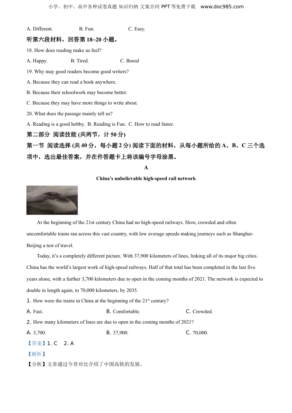 小学、初中、高中各种试卷真题知识归纳文案合同PPT等免费下载www.doc985.com湖南省永州市2021年中考英语试题(解析版)第一部分听力技能(共两节,计20分)第一节(共5分,每小题1分)听下面五段材料,每段材料后各有1个小题,从各小题所给的A、B、C三个选顶中选出最佳答案,井标在试卷的相应位置。听每段材料前,你将有时间阅读各个小题,每小题5秒钟。听完后,各小题将给出5秒钟的作答时间。1.WhatisGracedoingnow?2.What’sthematerwiththewoman?3.WhatdoesAlicedoafterschool?4.Whereisthewatchmade?5.HowdoesKategotoschool?小学、初中、高中各种试卷真题知识归纳文案合同PPT等免费下载www.doc985.com第二节(共15分,每小题1分)听下面六段材料,每段材料后各有几个小题,从各小题所给的A、B、C三个选顶中选出最佳答案,井标在试卷的相应位置。听每段材料前,你将有时间阅读各个小题,每小题5秒钟。听完后,各小题将给出5秒钟的作答时间。听第一段材料,回答第6~7小题。6.Wheredoesthemanwanttogo?A.Abank.B.Ahotel.C.Asupermarket.7.Howfarisitfromheretothedestination(目的地)?A.About4kilometers.B.About4kilometers.C.About6kilometers.听第二段材料,回答第8~9小题。8.WhatkindofmusicdoesJanelooklike?A.Pop.B.Rock.C.Country.9.Whenshalltheymeet?A.At2:00p.m.B.At2:30p.m.C.At3:00p.m.听第三段材料,回答第10~11小题。10.Whatdoesthemanwanttobuy?A.Shirts.B.Coats.C.Skirts.11.Howmuchwillthewomanpayforthegifts?A.20dollars.B.35dollars.C.40dollars.听第四段材料,回答第12~14小题。12.HowwastheweatheronSaturday?A.Sunny.B.Cloudy.C.Rainy.13.WhatdidMarydoonSundayafternoon?A.Shevisitedhergrandparents.B.Sheplayedwithherbrother.C.Shevolunteeredinanoldpeople’shome.14.WhatdidMikethinkwasthemostdelicious?A.SaladB.Cake.C.Popcorn.听第五段材料,回答第15~17小题。15.WhatsubjectsshouldLucystudyhard?A.Mathandscience.B.Medicineandchemistry.C.Mathandchemistry.16.WhatdoesBobwanttobe?A.Aninventor.B.Adoctor.C.Ateacher.17.WhatdoesBobthinkofmedicine?小学、初中、高中各种试卷真题知识归纳文案合同PPT等免费下载www.doc985.comA.Different.B.Fun.C.Easy.听第六段材料,回答第18~20小题。18.Howdoesreadingmakeusfeel?A.Happy.B.Tired.C.Bored19.Whymaygoodreadersbecomegoodwriters?A.Becausetheycanreadabookanywhere.B.Becausetheirschoolworkmaybecomebetter.C.Becausetheymayhavemorethingstowriteabout.20.Whatdoesthepassagemainlytellus?A.Readingisagoodhobby.B.ReadingisFun.C.Howtoreadfaster.第二部分阅读技能(共两节,计50分)第一节阅读选择(共40分,每小题2分)阅读下面的材料,从每小题所给的A、B、C三个选项中,选出最佳答案,并在件答题卡上将该编号字母涂黑。AChina’sunbelievablehigh-speedrailnetworkAtthebeginningofthe21stcenturyChinahadnohigh-speedrailways.Slow,crowdedandoftenuncomfortabletrainsranacrossthisvastcountry,withlowaveragespeedsmakingjourneyssuchasShanghai-Beijingatestoftravel.Today,it’sacompletelydifferentpicture.With37,900kilometersoflines,linkingallofitsmajorbigcities.Chinahastheworld’slargestworkofhigh-speedrailways.Halfofthattotalhasbeencompletedinthelastfiveyearsalone,withafurther3,700kilometersduetoopeninthecomingmonthsof2021.Thenetworkisexpectedtodoubleinlengthagain,to70,000kilometers,by2035.1.HowwerethetrainsinChinaatthebeginningofthe21stcentury?A.Fast.B.Comfortable.C.Crowded.2.Howmanykilometersoflinesareduetoopeninthecomingmonthsof2021?A.3,700.B.37,900.C.70,000.【答案】1.C2.A【解析】【分析】文章通过今昔对比介绍了中国高铁的发展。小学、初中、高中各种试卷真题知识归纳文案合同PPT等免费下载www.doc985.com【1题详解】细节理解题。根据“Atthebeginningofthe21stcenturyChinahadnohigh-speedrailways.Slow,crowdedandoftenuncomfo...