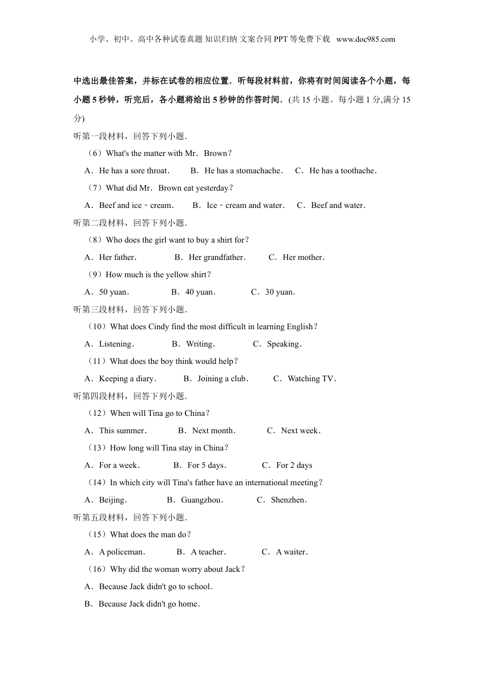 小学、初中、高中各种试卷真题知识归纳文案合同PPT等免费下载www.doc985.com2020年湖南省永州市中考英语试卷第一节听下面五段材料,每段材料后各有1个小题,从各小题所给的A、B、C三个选中选出最佳答案,并标在试卷的相应位置.听每段材料前,你将有时间阅读各个小题,每小题5秒钟.听完后,各小题将给出5秒钟的作答时间.(共5小题。每小题1分,满分5分)1.How'stheweatherinYongzhoutoday?2.WhatcanMaryplay?3.WhichoftheschoolthingsisJenny's?4.Wheredoesthemanwanttogo?5.WhatsubjectdoesAlicelike?第二节听下面六段材料,每段材料后各有几个小题,从各小题所给的A、B、C三个选项小学、初中、高中各种试卷真题知识归纳文案合同PPT等免费下载www.doc985.com中选出最佳答案,并标在试卷的相应位置.听每段材料前,你将有时间阅读各个小题,每小题5秒钟,听完后,各小题将给出5秒钟的作答时间.(共15小题。每小题1分,满分15分)听第一段材料,回答下列小题.(6)What'sthematterwithMr.Brown?A.Hehasasorethroat.B.Hehasastomachache.C.Hehasatoothache.(7)WhatdidMr.Browneatyesterday?A.Beefandice﹣cream.B.Ice﹣creamandwater.C.Beefandwater.听第二段材料,回答下列小题.(8)Whodoesthegirlwanttobuyashirtfor?A.Herfather.B.Hergrandfather.C.Hermother.(9)Howmuchistheyellowshirt?A.50yuan.B.40yuan.C.30yuan.听第三段材料,回答下列小题.(10)WhatdoesCindyfindthemostdifficultinlearningEnglish?A.Listening.B.Writing.C.Speaking.(11)Whatdoestheboythinkwouldhelp?A.Keepingadiary.B.Joiningaclub.C.WatchingTV.听第四段材料,回答下列小题.(12)WhenwillTinagotoChina?A.Thissummer.B.Nextmonth.C.Nextweek.(13)HowlongwillTinastayinChina?A.Foraweek.B.For5days.C.For2days(14)InwhichcitywillTina'sfatherhaveaninternationalmeeting?A.Beijing.B.Guangzhou.C.Shenzhen.听第五段材料,回答下列小题.(15)Whatdoesthemando?A.Apoliceman.B.Ateacher.C.Awaiter.(16)WhydidthewomanworryaboutJack?A.BecauseJackdidn'tgotoschool.B.BecauseJackdidn'tgohome.小学、初中、高中各种试卷真题知识归纳文案合同PPT等免费下载www.doc985.comC.BecauseJackdidsomethingwrong.(17)WhatdoesJacklooklike?A.Heisshortandhasbrownhair.B.Heisshortandhasblackhair.C.Heistallandhasblackhair.听第六段材料,回答下列小题.(18)Howmanysportsarementioned(提到)?A.One.B.Two.C.Three.(19)Howoftendotheyplaybasketball?A.Onceaweek.B.Twiceaweek.C.Threetimesaweek.(20)WhendoesthespeakerwatchtheNBAmatch?A.OnSaturday.B.OnSunday.C.Onweekends.第二部分阅读技能(共三节,满分50分)第一节阅读选择(共15小题。每小题2分,满分30分)阅读下面的材料,从每小题所给的A、B、C三个选项中,选出最佳答案,并在答题卡上将该编号字母涂黑。21.AImpressionsofYongzhouYongzhou,whoseneighboursareGuangdongandGuangxi,liesinthesouthofHunanProvince.Itcoversanareaof22,441km2.Thereare620millionpeoplelivinghere.Ifyouwanttocomeandtakeatrip.MountJiuyiandLiuziTemplearetwoofthemust﹣seeplacesofinterest.Don'tmissthedeliciousfood:DaozhouGreyGoose,Dong'anChicken,andYongzhouBloodDuck.WelcometoYongzhou!(21)WhereisYongzhou?A.InthesouthofHunan.B.InthesouthofGuangdong.C.InthesouthofGuangxi.(22)oucanenjoytheYongzhoufoodwithout.A.Dong'anChickenB.DaozhouGreyGooseC.BeijingDuck小学、初中、高中各种试卷真题知识归纳文案合同PPT等免费下载www.doc985.com23.BTheproperwaystosavethedrowning(溺水)student.Dos•Shoutloudlyandaskadultsforhelp.Atthesametime,dial110.•Findtheobjectswhichcanfloatsuchaswoodandbagsfilledwithemptyplasticbottlesandthrowthemtohim...