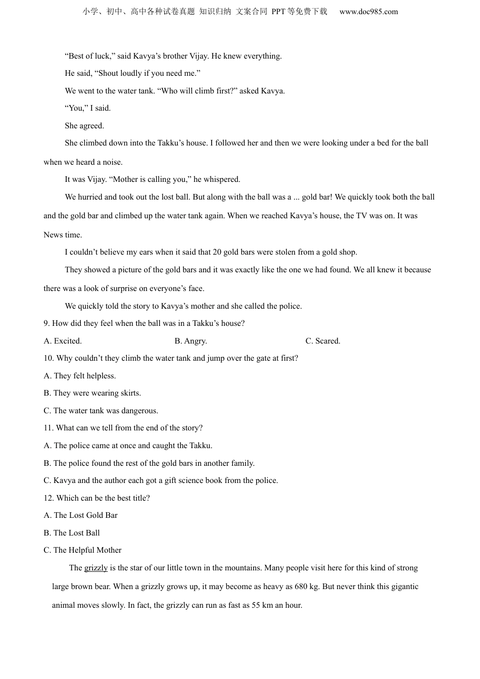 小学、初中、高中各种试卷真题知识归纳文案合同PPT等免费下载www.doc985.com2022年湖南省常德市中考英语试卷第I卷第一部分阅读技能共20题;每题2分,满分40分.阅读下面的材料,从每题所给的A、B、C三个选项中,选出最佳选项回答问题或完成句子。You’reinvitedtoapartyatJackandSue’snewhome!WemovedintoournewhomeinDecember.It’slocatedat36RiverRoad.CometoadinnerpartyonJanuary12andcelebratewithus.Drinksandsnackswillbeavailablefrom6P.M.to7P.M.Dinnerwillbeginat7P.M.PleaseletusknowbyJanuary5whetheryou’llcome.We’relookingforwardtoseeingyou!JackandSueHarrisTEL:02-33221100Email:jns@email.com.tw1.Whojustmoved?________A.Jack’sfriends.B.JackandSue.C.Jack’sparents.2.Accordingtotheinvitation,isthereapartyduringthedaytime?________A.Yes,thereis.B.No,thereisn’t.C.Notmentioned.3.Whenshouldtheguestsreplytotheinvitation?________A.InDecember.B.OnJanuary12.C.ByJanuary5.4.Wherecanwemostprobablyseetheinvitation?________A.Inthetextbook.B.InWechatmessages.C.Inadiarybook.小学、初中、高中各种试卷真题知识归纳文案合同PPT等免费下载www.doc985.comIhaveloveddancingeversinceIcanremember.ItwasapartofmylifewhenIwasgrowingupanditisstillimportanttomenow.△Whatcanbebetterthandancingtoyourfavoritesongs?Ilovegoingtoclubsanddiscos.Icandanceallnightlong.Inevergettiredofit.WhenIwassmall,Iusedtogotoschooldiscos.I’dalsodanceatthepartiesmyparents,friendsandneighborshad.Idon’tthinkI’lleverstopdancing.Ialsolovelookingatdancing.Balletisbeautiful.Dancesfromallovertheworldarebeautiful.Ithinkthelifeofaprofessionaldancermustbeagoodone.Onethingthatalwaysamazesmeishowmuchchildrenlovedancing.Ithinkdancingmustbeintheirblood.5.Whichcanbestreplace“△”inthepassage?________A.Ithastobethebestwaytoexercise.B.Whatfunitistosingmyfavoritesong!C.Dancingisasgoodassingingwhenexercise.6.Whatmaybe“discos”?________A.Amusichall.B.Adancehall.C.Asportshall.7.Whatdoesthewriterthinkofballet?________A.Relaxing.B.Terrible.C.Beautiful.8.Inthewriter’sopinion,dochildrenlovedancing?________A.Yes,theydo.B.No,theydon’t.C.Notmentioned.OnedayKavyaandIwereplayingwiththeracketandballandtheballwentintoaTakku’shouse.Thoughwewerescared,wewenttohishouseandaskedhimifhecouldgiveusourball.Hesaid“No”.Wefelthelpless.Suddenly,Ihadanidea.TherewasawatertankbehindtheTakku’shouse.IlookedatitandtoldKavya,“Kavya,lookatthis.Wecanclimbthewatertankandjumpoverthegate.”Kavyaagreed,butwewerebothwearingskirts.Wecouldn’tclimbwiththat.“Itdoesn’tmatter,wecanseetomorrow.Don’tforgettowearpants,”saidKavya.“Bye,”Isaidandwentbackhome.ThenextdayIwenttoKavya’shouseearly.Wewerebothwearingpants.小学、初中、高中各种试卷真题知识归纳文案合同PPT等免费下载www.doc985.com“Bestofluck,”saidKavya’sbrotherVijay.Hekneweverything.Hesaid,“Shoutloudlyifyouneedme.”Wewenttothewatertank.“Whowillclimbfirst?”askedKavya.“You,”Isaid.Sheagreed.SheclimbeddownintotheTakku’shouse.Ifollowedherandthenwewerelookingunderabedfortheballwhenweheardanoise.ItwasVijay.“Motheriscallingyou,”hewhispered.Wehurriedandtookoutthelostball.Butalongwiththeballwasa...goldbar!Wequicklytookboththeballandthegoldbarandclimbedupthewatertankagain.WhenwereachedKavya’shouse,theTVwason.ItwasNewstime.Icouldn’tbelievemyearswhenitsaidthat20goldbarswerestolenfromagoldshop.Theyshowedapictureofthegoldbarsanditwasexactlyliketheonewehadfound.Weallknewitbecausetherewasalookofsurpriseoneveryone’sface.WequicklytoldthestorytoKavya’smoth...