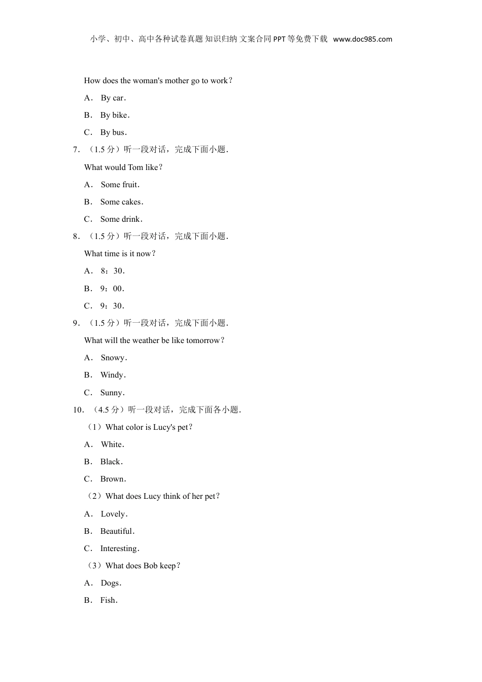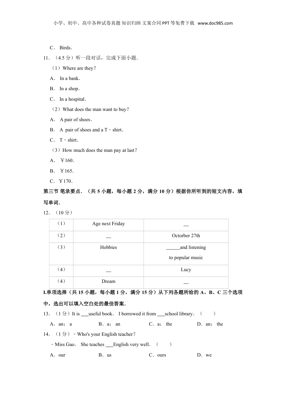 小学、初中、高中各种试卷真题知识归纳文案合同PPT等免费下载www.doc985.com2018年湖南省益阳市中考英语试卷第一部分听力(共三节,满分25分)第一节听对话选图.(共5小题,每小题1分,满分5分)1.(1分)Howdidherfathergotothestation?2.(1分)WhenwasHangzhouBayBridgeopenedtotraffic?3.(1分)WhatdoesFuwadoonweekends?4.(1分)Whatisthegirldoingatthemoment?5.(1分)Howistheweathernow?第二节对话理解(共6小题,每小题1.5分,满分15.0分)听下面六段对话,从题中所给A、B、C三个选项中选出最佳选项.每段对话读两遍.6.(1.5分)听一段对话,完成下面小题.小学、初中、高中各种试卷真题知识归纳文案合同PPT等免费下载www.doc985.comHowdoesthewoman'smothergotowork?A.Bycar.B.Bybike.C.Bybus.7.(1.5分)听一段对话,完成下面小题.WhatwouldTomlike?A.Somefruit.B.Somecakes.C.Somedrink.8.(1.5分)听一段对话,完成下面小题.Whattimeisitnow?A.8:30.B.9:00.C.9:30.9.(1.5分)听一段对话,完成下面小题.Whatwilltheweatherbeliketomorrow?A.Snowy.B.Windy.C.Sunny.10.(4.5分)听一段对话,完成下面各小题.(1)WhatcolorisLucy'spet?A.White.B.Black.C.Brown.(2)WhatdoesLucythinkofherpet?A.Lovely.B.Beautiful.C.Interesting.(3)WhatdoesBobkeep?A.Dogs.B.Fish.小学、初中、高中各种试卷真题知识归纳文案合同PPT等免费下载www.doc985.comC.Birds.11.(4.5分)听一段对话,完成下面小题.(1)Wherearethey?A.Inabank.B.Inashop.C.Inahospital.(2)Whatdoesthemanwanttobuy?A.Apairofshoes.B.ApairofshoesandaT﹣shirt.C.T﹣shirt.(3)Howmuchdoesthemanpayatlast?A.¥160.B.¥165.C.¥170.第三节笔录要点.(共5小题,每小题2分,满分10分)根据你所听到的短文内容,填写单词.12.(10分)(1)AgenextFriday(2)Octorber27th(3)Hobbiesandlisteningtopopularmusic(4)Lucy(4)DreamI.单项选择(共15小题,每小题1分,满分15分)从下列各题所给的A、B、C三个选项中,选出可以填入空白处的最佳答案.13.(1分)Itisusefulbook.Iborroweditfromschoollibrary.()A.an;aB.a;anC.a;theD.an;the14.(1分)﹣Who'syourEnglishteacher?﹣MissGao.SheteachesEnglishverywell.()A.ourB.usC.oursD.we小学、初中、高中各种试卷真题知识归纳文案合同PPT等免费下载www.doc985.com15.(1分)﹣MustIfinishtheworkintwodays,Mrs.White?﹣.()A.Yes,youneedB.No,youmustn'tC.No,youneedn'tD.Certainlynot16.(1分)﹣Excuseme,couldyoutellmewherethenearestpostofficeis?﹣Thenearestpostoffice?Youwillhavetowalk.()A.500﹣metresawayB.500metrefarC.500metresfartherD.500﹣metrefar17.(1分)Sheisplanningondriving.Let'shelphersomegoodideas.()A.comeoutB.comeupC.catchupwithD.comeupwith18.(1分)Yesterday,somedoctorsaboy.()A.hadsaved,dyingB.saved,deadC.hassaved,deadD.saved,dying19.(1分)I____inthissmallmountainvillagewhenIwasachild.()A.usetoliveB.usedtolivingC.usedtoliveD.usedtolife20.(1分)﹣Shallweplayfootballnow?﹣Sorry,Ican't.Becausemymotherisill,Ihavetoherathome.()A.lookforB.lookatC.lookafterD.looklike21.(1分)WhileIwithmyfriend,shecamein.()A.amtalkingB.wastalkingC.talkedD.amgoingtotalk22.(1分)Allofusenjoyplayingcomputergames,wecan'tspendtoomuchtimeonit.()A.andB.orC.butD.so23.(1分)Thestudentsgotwhentheywatchedtheinterestingfilm.()A.excitedB.boredC.sadD.upset24.(1分)﹣Thefoodisverydelicious.I'mveryfull.﹣Whydon'tyouawalkwithme?()A.takeB.totakeC.takesD.took小学、初中、高中各种试卷真题知识归纳文案合同PPT等免费下载www.doc985.com25.(1...