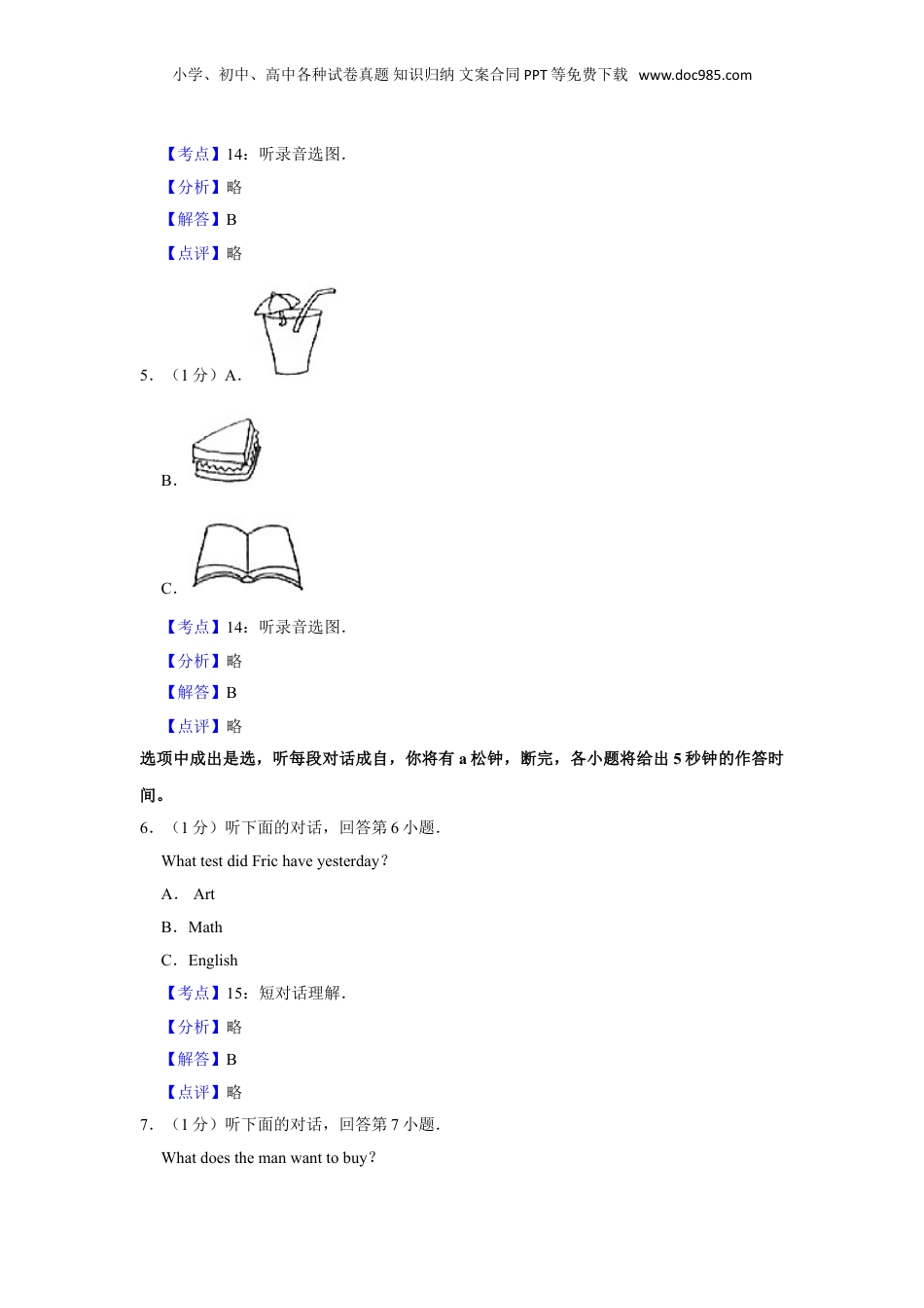 小学、初中、高中各种试卷真题知识归纳文案合同PPT等免费下载www.doc985.com2019年湖南省娄底市中考英语试卷(教师版)一、听力理解(共两节,20小题:每小题1分,计20分)第一节听下面5段对话,根据所听到的内容,选择相应的图画.听每段对话前,你将有时间阅读各个小题,每小题5秒钟.听完后,各小题将给出5秒钟的作答时间.1.(1分)A.B.C.【考点】14:听录音选图.菁优网版权所有【分析】略【解答】A【点评】略2.(1分)A.B.C.小学、初中、高中各种试卷真题知识归纳文案合同PPT等免费下载www.doc985.com【考点】14:听录音选图.菁优网版权所有【分析】略【解答】C【点评】略3.(1分)A.B.C.【考点】14:听录音选图.菁优网版权所有【分析】略【解答】A【点评】略4.(1分)A.B.C.小学、初中、高中各种试卷真题知识归纳文案合同PPT等免费下载www.doc985.com【考点】14:听录音选图.菁优网版权所有【分析】略【解答】B【点评】略5.(1分)A.B.C.【考点】14:听录音选图.菁优网版权所有【分析】略【解答】B【点评】略选项中成出是选,听每段对话成自,你将有a松钟,断完,各小题将给出5秒钟的作答时间。6.(1分)听下面的对话,回答第6小题.WhattestdidFrichaveyesterday?A.ArtB.MathC.English【考点】15:短对话理解.菁优网版权所有【分析】略【解答】B【点评】略7.(1分)听下面的对话,回答第7小题.Whatdoesthemanwanttobuy?小学、初中、高中各种试卷真题知识归纳文案合同PPT等免费下载www.doc985.comA.AmartrobotB.AsmallradioC.Amobilephone【考点】15:短对话理解.菁优网版权所有【分析】略【解答】C【点评】略8.(1分)听下面的对话,回答第8小题.Whataretheytalkingabout?A.Aphotoofamck.B.Aphotoofaatar.C.Aphotoofablackbole.【考点】15:短对话理解.菁优网版权所有【分析】略【解答】C【点评】略9.(1分)听下面的对话,回答第9小题.WhendidthefireinNotreDame(巴黎圣母院)takeplace?A.OnAprilI5th.B.OnApril14th.C.OnApril13th.【考点】15:短对话理解.菁优网版权所有【分析】略【解答】A【点评】略10.(1分)听下面的对话,回答第10小题.What'stheprobablerelationshipbetweenthetwospeaker?A.Doctorandpatent.B.Husbandandwife.C.Teacherandstudent.【考点】15:短对话理解.菁优网版权所有小学、初中、高中各种试卷真题知识归纳文案合同PPT等免费下载www.doc985.com【分析】略【解答】B【点评】略11.(2分)听下面的对话,回答下列小题.(1)Howmucharetheapples?A.13yuanakilo.B.15yuanakilo.C.30yuanakilo.(2)WhatdoesAlanthinkoftheapples?A.Deliciousandcheap.B.Deliciousbutexpensive.C.Sourandexpensive.【考点】17:长对话理解.菁优网版权所有【分析】略【解答】CB【点评】略12.(2分)听下面的对话,回答下列小题.(1)What'sthewoman?A.Areporter.B.Acleaner.C.Awriter.(2)WhyisLianshuiRivercleanandbeautfulnow?A.Themanhasgrownsomeflower.B.thewomenhaspreventedpollution.C.thegovernmenthastakensomemeasures.【考点】17:长对话理解.菁优网版权所有【分析】略【解答】AC【点评】略13.(3分)听下面的对话,回答下列小题.(1)Whoseclassareluvingachannysal?小学、初中、高中各种试卷真题知识归纳文案合同PPT等免费下载www.doc985.comA.Tony'sclass.B.David'sclass.C.Helen'sclass.(2)whatmightnotbeboughtonthecharitysale(义卖)A.Toys.B.Pent.C.Fridge.(3)Howmanystudentsaretakingpartinthecharitysale?A.10.B.40.C.10.【考点】17:长对话理解.菁优网版权所有【分析】略【解答】ACB【点评】略14.(3分)听下面一段独白,回答下列小题.(1)HowfarisstfromJenmy'shousetoLinda'shA.20kilometers.B.50kilometers.C.70kilometers.(2)HowoftendoesJennyvisithergrandparents?A.onceamonth.B.Twiceamonth.C.Threetimesamonth.(3)WhodidJenyandLindahaveapicnicwit?A.Jenmy'sfriend.B.Jen...