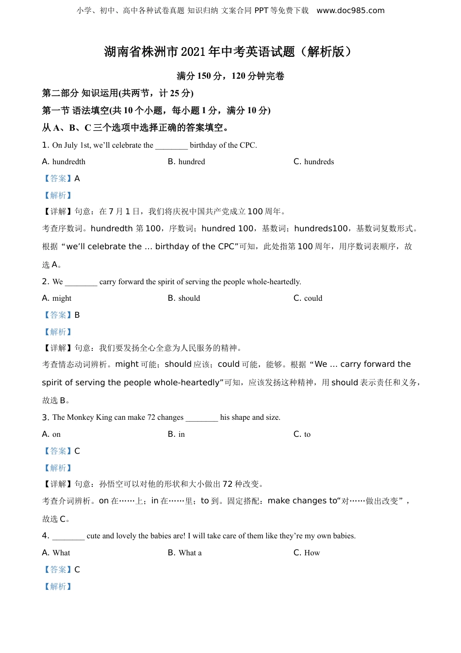 小学、初中、高中各种试卷真题知识归纳文案合同PPT等免费下载www.doc985.com湖南省株洲市2021年中考英语试题(解析版)满分150分,120分钟完卷第二部分知识运用(共两节,计25分)第一节语法填空(共10个小题,每小题1分,满分10分)从A、B、C三个选项中选择正确的答案填空。1.OnJuly1st,we’llcelebratethe________birthdayoftheCPC.A.hundredthB.hundredC.hundreds【答案】A【解析】【详解】句意:在7月1日,我们将庆祝中国共产党成立100周年。考查序数词。hundredth第100,序数词;hundred100,基数词;hundreds100,基数词复数形式。根据“we’llcelebratethe…birthdayoftheCPC”可知,此处指第100周年,用序数词表顺序,故选A。2.We________carryforwardthespiritofservingthepeoplewhole-heartedly.A.mightB.shouldC.could【答案】B【解析】【详解】句意:我们要发扬全心全意为人民服务的精神。考查情态动词辨析。might可能;should应该;could可能,能够。根据“We…carryforwardthespiritofservingthepeoplewhole-heartedly”可知,应该发扬这种精神,用should表示责任和义务,故选B。3.TheMonkeyKingcanmake72changes________hisshapeandsize.A.onB.inC.to【答案】C【解析】【详解】句意:孙悟空可以对他的形状和大小做出72种改变。考查介词辨析。on在……上;in在……里;to到。固定搭配:makechangesto“对……做出改变”,故选C。4.________cuteandlovelythebabiesare!Iwilltakecareofthemlikethey’remyownbabies.A.WhatB.WhataC.How【答案】C【解析】小学、初中、高中各种试卷真题知识归纳文案合同PPT等免费下载www.doc985.com【详解】句意:这些婴儿多可爱啊!我会像照顾自己的孩子一样照顾他们。考查感叹句。此句是感叹句,中心词cuteandlovely是形容词,用how引导的感叹句结构:how+形容词+主谓,故选C。5.ThisTVprogramdiscusseswherethebesttealeaves________.A.wereproducedB.haveproducedC.produced【答案】A【解析】【详解】句意:这个电视节目讨论最好的茶叶是在哪里生产的。考查一般过去时被动语态。主语thebesttealeaves与produce是被动关系,且“茶叶生产”这个动作是发生在过去,故从句要用一般过去时被动语态was/weredone的结构,故选A。6.Don’tplaywiththeknife,oryou’llcut________.A.itselfB.yourselfC.himself【答案】B【解析】【详解】句意:别玩刀子,不然你会割伤自己的。考查反身代词。itself它自己;yourself你自己;himself他自己。反身代词应与主语you在人称上保持一致,所以此空应填yourself,故选B。7.Theactiveladieslikemusic________theycandanceto.A.thatB.whereC.who【答案】A【解析】【详解】句意:活跃的女士们喜欢可以随着音乐跳舞的音乐。考查定语从句。此句是定语从句,先行词music指物,在从句中作宾语,用that引导定语从句,故选A。8.XiaoYun,the________childwasjustborn.Histwoeldersistersareatschool.A.youngerB.youngestC.older【答案】B【解析】【详解】句意:最小的孩子小云刚刚出生。他的两个姐姐都在上学。考查形容词最高级。younger更年轻的;youngest最年轻的;older更老的。根据“Histwoeldersistersareatschool”可知,与另两个姐姐相比是最小的小孩,用形容词最高级youngest,故选B。9.Look!Allthestudents________Englishpoems.Pleasetakeaphotofortheparents.A.arereadingB.havereadC.read小学、初中、高中各种试卷真题知识归纳文案合同PPT等免费下载www.doc985.com【答案】A【解析】【分析】【详解】句意:看,所有的学生正在读英语诗歌。请为父母拍一张照片。考查动词的时态。根据“look”可知句子讲述的是正在发生的事,用现在进行时,谓语动词用“arereading”。故选A。10.AllthestudentsinGradeThreearegoingto________thebanksoftheXiangjiangRiver.A.turnupB.giveupC.cleanup【答案】C【解析】【分析】【详解】句意:三年级的所有学生将清理湘江的江岸。考查动词短语。turnup调高;giveup放弃;cleanup清理。根据“thebanksoftheXiangjiangRiver”可知表达“清理,清除污染物”,用动词短语“cleanup...