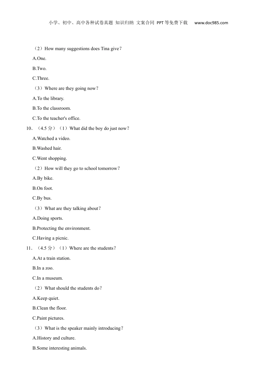 小学、初中、高中各种试卷真题知识归纳文案合同PPT等免费下载www.doc985.com2022年湖南省株洲市中考英语试卷第一部分听力技能(共两节,满分7.5分)第一节(共5个小题;每小题1.5分,满分7.5分)听下面5段对话。每段对话后有一个小题,从题中所给的A、B、C三个选项中选出最佳选项。听完每段对话后,你都有10秒钟的时间来回答有关小题和阅读下一小题。每段对话读两遍。1.WhatdoesJackhaveforbreakfast?A.B.C.2.WhatdoesXiaoMingliketodoinhisfreetime?A.B.C.3.Howlonghasthemanhadthisbike?A.Forthreeyears.B.Forfouryears.C.Forfiveyears.4.Whereisthepolicestation?A.Neartheschool.B.Behindthehospital.C.Acrossfromthebank.5.Whenwilltheplanetakeoff?A.At10:00.B.At11:00.C.At12:00.小学、初中、高中各种试卷真题知识归纳文案合同PPT等免费下载www.doc985.com第二节(共15个小题:每小题1.5分,满分22.5分)听下面6段对话或独白。每段对话或独白后有2~3个小题,从题中所给的A、B、C三个选项中选出最佳选项。听每段对话或独白前,你将有时间阅读各个小题,每小题5秒钟;听完后,各小题将给出5秒钟的作答时间。每段对话或独白读两遍。6.(3分)(1)HowoftendoesTomgotothemovies?A.Onceamonth.B.Twiceamonth.C.Threetimesamonth.(2)WhodoesTomusuallygowith?A.Hisfather.B.Hisfriend.C.Hiscousin.7.(3分)(1)What'sthematterwithRick?A.Hasafever.B.Hasacold.C.Hasatoothache.(2)Whoisthewoman?A.Rick'steacher.B.Rick'smom.C.Rick'sclassmate.8.(3分)(1)Whenistheparty?A.OnSundaymorning.B.OnSundayafternoon.C.OnSundayevening.(2)Whatwilltheydointheparty?A.Makeacake.B.Playwordgames.C.Listentomusic.9.(4.5分)(1)WhatkindoftestwillJerryhave?A.AChinesetest.B.Amathtest.C.AnEnglishtest.小学、初中、高中各种试卷真题知识归纳文案合同PPT等免费下载www.doc985.com(2)HowmanysuggestionsdoesTinagive?A.One.B.Two.C.Three.(3)Wherearetheygoingnow?A.Tothelibrary.B.Totheclassroom.C.Totheteacher'soffice.10.(4.5分)(1)Whatdidtheboydojustnow?A.Watchedavideo.B.Washedhair.C.Wentshopping.(2)Howwilltheygotoschooltomorrow?A.Bybike.B.Onfoot.C.Bybus.(3)Whataretheytalkingabout?A.Doingsports.B.Protectingtheenvironment.C.Havingapicnic.11.(4.5分)(1)Wherearethestudents?A.Atatrainstation.B.Inazoo.C.Inamuseum.(2)Whatshouldthestudentsdo?A.Keepquiet.B.Cleanthefloor.C.Paintpictures.(3)Whatisthespeakermainlyintroducing?A.Historyandculture.B.Someinterestinganimals.小学、初中、高中各种试卷真题知识归纳文案合同PPT等免费下载www.doc985.comC.Somebasicrules.第二部分知识运用(共两节,满分10分)第一节语法填空(共10个小题:每小题1分,满分10分)从A、B、C三个选项中选择正确的答案填空。12.(1分)I'mgoingtovolunteerinopenairconcert.﹣()A.anB.aC./13.(1分)Maryisabooklover.Shecouldreadbyattheageoffive.()A.herselfB.himselfC.themselves14.(1分)lovelyBingDwendwenis!Everyonewantstohaveone.()A.WhatB.WhataC.How15.(1分)ThreeChineseastronauts(宇航员)toChinaSpaceStationsuccessfullyonJune5,2022.()A.sentB.aresentC.weresent16.(1分)YuanLongpingisagreatscientistwillliveinourheartforever.()A.whichB.whoC.what17.(1分)Hedidn'tgotobedhefinishedhisworklastnight.()A.becauseB.ifC.until18.(1分)Listen!Theysongsforthe100birthdayoftheCCYL(中国共青团).()A.aresingingB.sangC.willsing19.(1分)Wheneveryouarefarawayfromhome,pleaseremember,"Eastorwest,homeis."()A.goodB.betterC.best20.(1分)asharedfuture,weshouldlearnfromeachotherandhelpeachother.()A.CreateB.TocreateC.Creating21.(1分)ThoughTuYouyoufailedmanytimes,sheneverhereffortsto...