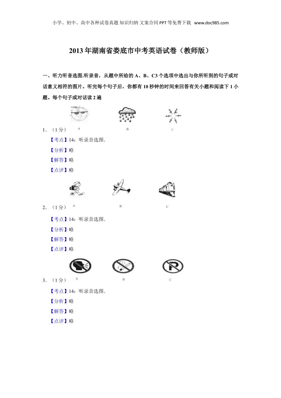 小学、初中、高中各种试卷真题知识归纳文案合同PPT等免费下载www.doc985.com2013年湖南省娄底市中考英语试卷(教师版)一、听力听音选图.听录音,从题中所给的A、B、C3个选项中选出与你所听到的句子或对话意义相符的图片。听完每个句子后,你都有10秒钟的时间来回答有关小题和阅读下1小题。每个句子或对话读2遍1.(1分)【考点】14:听录音选图.菁优网版权所有【分析】略【解答】略【点评】略2.(1分)【考点】14:听录音选图.菁优网版权所有【分析】略【解答】略【点评】略3.(1分)【考点】14:听录音选图.菁优网版权所有【分析】略【解答】略【点评】略小学、初中、高中各种试卷真题知识归纳文案合同PPT等免费下载www.doc985.com4.(1分)【考点】14:听录音选图.菁优网版权所有【分析】略【解答】略【点评】略5.(1分)【考点】14:听录音选图.菁优网版权所有【分析】略【解答】略【点评】略二、对话理解听下面7段短对话,每段对话后各有l个小题,从题中所给的A、B、C3个选项中选出符合对话内容的最佳选项.听每段对话前,你将有5秒钟的时间来阅读有关小题.听完每段对话后,你将有5秒钟的作答时间.每段对话读2遍.6.(1分)WhatcolorisLucy'sdress?A.BlueB.YellowC.Purple.【考点】15:短对话理解.菁优网版权所有【分析】略【解答】B【点评】略7.(1分)WhenisTom'smother'sbirthday?A.June22ndB.July22ndC.June21st.【考点】15:短对话理解.菁优网版权所有【分析】略【解答】A【点评】略8.(1分)Whereisthegirl?小学、初中、高中各种试卷真题知识归纳文案合同PPT等免费下载www.doc985.comA.Intheclassroom.B.Inthebookshop.C.Inthelibrary.【考点】15:短对话理解.菁优网版权所有【分析】略【解答】C【点评】略9.(1分)WhyisBilllateforschool?A.BecauseheisillB.BecausehisbikeisbrokenC.Becausethetrafficisheavy.【考点】15:短对话理解.菁优网版权所有【分析】略【解答】B【点评】略10.(1分)Whosentthegirlane﹣mail?A.apenpalB.aclassmateC.hersister.【考点】15:短对话理解.菁优网版权所有【分析】略【解答】A【点评】略11.(1分)WhatkindofmusicdoesAlicelikebest?A.LightmusicB.RockmusicC.Popmusic.【考点】15:短对话理解.菁优网版权所有【分析】略【解答】C【点评】略12.(1分)Howfarisitfromtheboy'shometoschool?A.5kmB.10kmC.12km.【考点】15:短对话理解.菁优网版权所有【分析】略【解答】B【点评】略小学、初中、高中各种试卷真题知识归纳文案合同PPT等免费下载www.doc985.com三、短文理解13.(3分)听下面一段独白,独白后有3个小题.根据所听到的独白内容,在各小题空白处填入1个适当的词.听独白前,你将有15秒钟的时间阅读各个小题.听完独白后,你将有30秒钟的作答时间.独白读2遍.13.AfamilyofmicewereinthekitchenonSaturdaymorning.14.Thecatquicklyranaway.15.That'swhyit'simportanttolearnasecondlanguage.【考点】16:短文理解.菁优网版权所有【分析】略【解答】13.Saturday14.ran15.second【点评】略四、反应14.(5分)听下面5个句子.报据你所听到的内容和实际情况,给每个句子写出简要答语.听完每个句子后,你都有15秒钟的作答时间.每个句子读2遍.16.略17.略18.略19.略20.略.【考点】12:句子理解.菁优网版权所有【分析】略【解答】略【点评】略五、知识单项选择(共10小题,计10分)从A、B、C3个选项中选出1个能填入所给句子空白处的最佳选项。15.(1分)﹣MyfamilyandIwillgotoChangshathissummerholiday.﹣Have_________goodtime.()A.aB.anC.the【考点】52:不定冠词(a,an).菁优网版权所有【分析】﹣﹣我和我的家人今年暑假要去长沙.﹣﹣玩得开心.小学、初中、高中各种试卷真题知识归纳文案合同PPT等免费下载www.doc985.com【解答】答案:A.考查冠词.句意"我和我的家人今年暑假要去长沙.玩得开心.".haveagoodtime玩得开心,过得愉快,固定搭配.good是以辅音音素/g/开头的,用a修饰.答案是A.【点评】考查冠词,冠词包括...