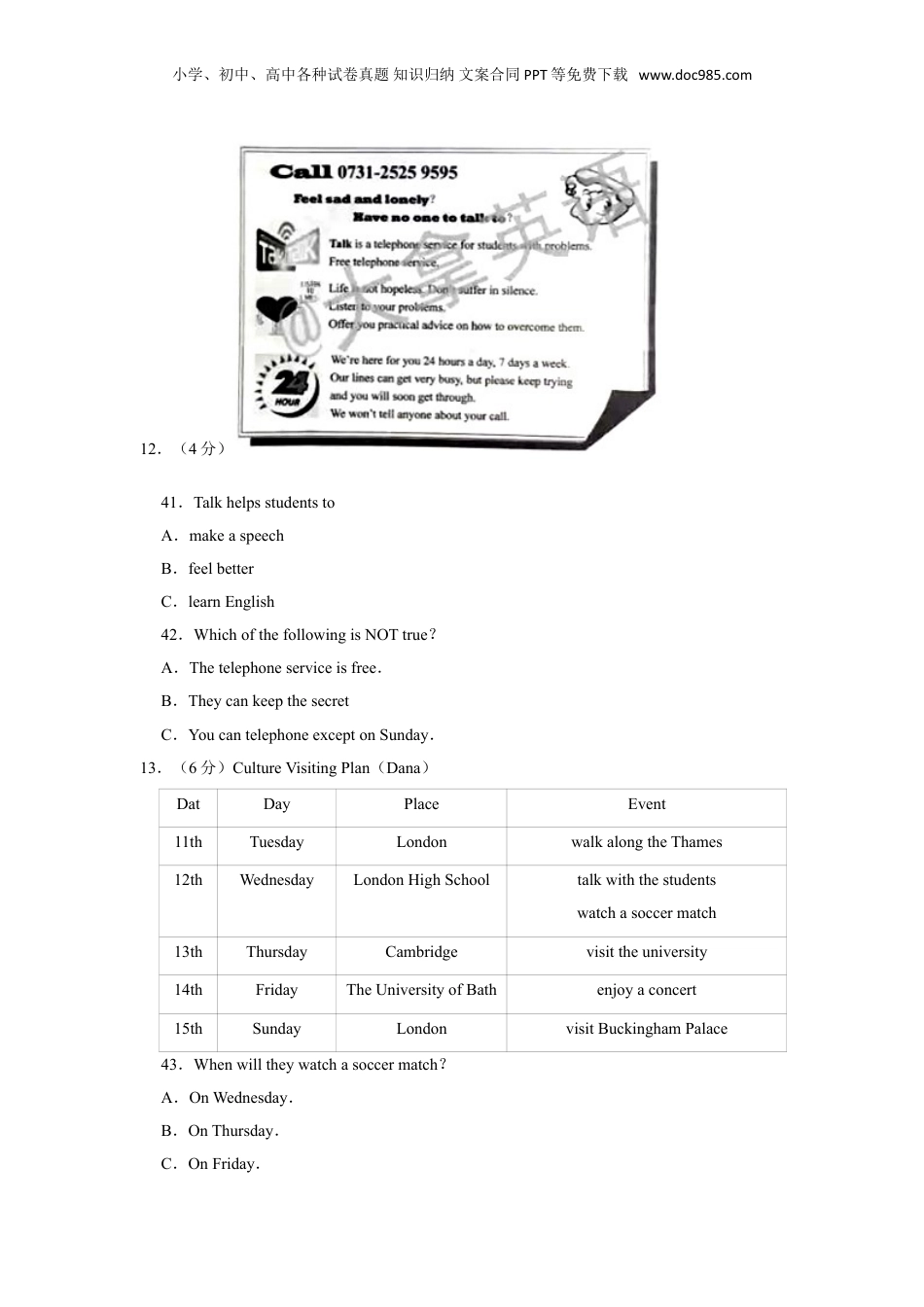 小学、初中、高中各种试卷真题知识归纳文案合同PPT等免费下载www.doc985.com2017年湖南省株洲市中考英语试卷一、知识运用(共2节,计25分).1.(1分)We________buildourcountryintoacountryofpeace,acountryofwealth,acountryofopeningup.()A.mightB.shouldC.could2.(1分)Youcankeeponeoftheoldphotos.________ofthem.()A.NeitherB.BothC.Either3.(1分)Heknewhissubject________AtoZ.()A.fromB.atC.on4.(1分)XiaoFangintroducedherselftothenewstudentsinEnglishin_________lesson.()A.thefirstB.atC.one5.(1分)Bequiet!Abird________somethingonthewindow.()A.AreB.eatsC.iseating6.(1分)Iorderedahamburgerandsalad.________hamburgerwasnicebutthesaladwasnotdelicious.()A.AnB.TheC.A7.(1分)Theman________calledyesterdaywantstobuythehouse.()A.whoB.whatC.which8.(1分)Thomasisthe________playerinthebasketballteambutheisthebest.()A.shorterB.shortC.shortest9.(1分)Thesinger________whilestillatschool()A.hasdiscoveredB.wasdiscoveredC.discovered10.(1分)______thelight,please.Thisisaroomwithenoughnaturallight.()A.TurnoffB.TurnonC.Turndown二、完型填空(10小题,15分)11.(15分)"Ihavetogetthecow'sbabytothehouseoritwillfreezetodeath,"LiMingsaidtohimself.Hetriedtoliftit,butitwastoo(31)LiMinglookedaroundthelittlebarn(牲口棚).Hesawnothinghecoulduseto(32)小学、初中、高中各种试卷真题知识归纳文案合同PPT等免费下载www.doc985.comthebaby.Thenhemadeadecision.Hequicklytookoffhiscoat,placeditonthegroundbesidethebaby,andgentlyslid(滑动)thebabyonit.As(33)ashecould,LiMingpulledthebabyoutofthebarnandmadehiswaybacktothe(34).LiMingtookthequilt(被子)offhisbedandrubbedthebabydry.Itlayonhis(35),unabletolifthishead.Hepullhiswet,snowycoatunderthebabyandcoveredthelittleanimalwithhisquilt.Afterputtingonemorepiecesofwoodonthefire,LiMingpulledonhiscoat.Itwasstillwetfromtheground,(36)itwasbetterthannothing.Hetookabigbottleandmadehiswaybacktothebarn.Hewantedtogetsomemilk.Atfirsthisfingersweretoocold,butfinallythewarmthofthecow'sbodywarmed(37)enough,sohecouldmilk.Hestartedbacktothehouse.LiMingwasjustbeginningtospoonmilkintothebaby'smouthwhenFatherandMothercameintothehouse."Howdidyougetthebabyinhere?''Fatherasked(38)thelittleanimal.LiMingexplainedhowhehad(39)thebabyonhiscoat.,Doyouthinkhe'llmakeit?""He'll(40)FathertoldLiMing,'"thankstoyou."31.A.heavyB.lightC.weak32.A.serveB.liftC.feed33.A.quietlyB.slowlyC.carefully34.A.schoolB.hospitalC.house35.A.quiltB.coatC.jacket36.A.butB.soC.and37.A.itB.themC.her38.A.examiningB.hittingC.pulling39.A.driedB.pulledC.checked40.A.dieB.seeC.live三、阅读理解(共三节,计40分)小学、初中、高中各种试卷真题知识归纳文案合同PPT等免费下载www.doc985.com12.(4分)41.TalkhelpsstudentstoA.makeaspeechB.feelbetterC.learnEnglish42.WhichofthefollowingisNOTtrue?A.Thetelephoneserviceisfree.B.TheycankeepthesecretC.YoucantelephoneexceptonSunday.13.(6分)CultureVisitingPlan(Dana)DatDayPlaceEvent11thTuesdayLondonwalkalongtheThames12thWednesdayLondonHighSchooltalkwiththestudentswatchasoccermatch13thThursdayCambridgevisittheuniversity14thFridayTheUniversityofBathenjoyaconcert15thSundayLondonvisitBuckinghamPalace43.Whenwilltheywatchasoccermatch?A.OnWednesday.B.OnThursday.C.OnFriday.小学、初中、高中各种试卷真题知识归纳文案合同PPT等免费下载www.doc985...