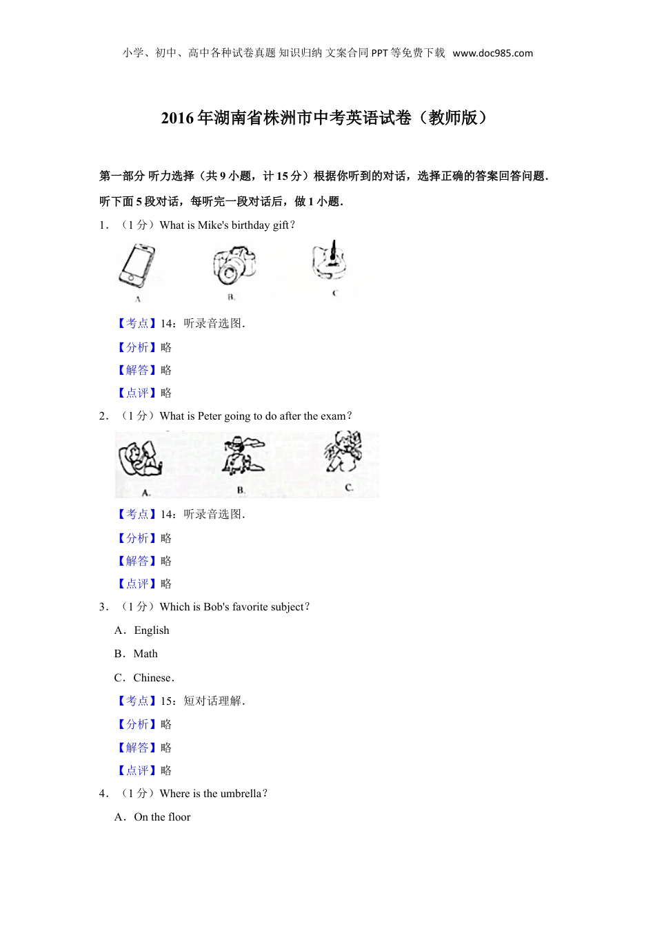 小学、初中、高中各种试卷真题知识归纳文案合同PPT等免费下载www.doc985.com2016年湖南省株洲市中考英语试卷(教师版)第一部分听力选择(共9小题,计15分)根据你听到的对话,选择正确的答案回答问题.听下面5段对话,每听完一段对话后,做1小题.1.(1分)WhatisMike'sbirthdaygift?【考点】14:听录音选图.菁优网版权所有【分析】略【解答】略【点评】略2.(1分)WhatisPetergoingtodoaftertheexam?【考点】14:听录音选图.菁优网版权所有【分析】略【解答】略【点评】略3.(1分)WhichisBob'sfavoritesubject?A.EnglishB.MathC.Chinese.【考点】15:短对话理解.菁优网版权所有【分析】略【解答】略【点评】略4.(1分)Whereistheumbrella?A.Onthefloor小学、初中、高中各种试卷真题知识归纳文案合同PPT等免费下载www.doc985.comB.IntheschoolbagC.Onthedesk.【考点】15:短对话理解.菁优网版权所有【分析】略【解答】略【点评】略5.(1分)HowoftendoesScottgoswimming?A.OnceaweekB.TwiceaweekC.Threetimesaweek.【考点】15:短对话理解.菁优网版权所有【分析】略【解答】略【点评】略6.(2分)听第六段对话,做第6﹣7小题.6.WhereisLindanow?A.InHongKongB.InNewYorkC.InAustralia7.How'stheweatherinZhuzhou?A.RainyB.SunnyC.Cloudy.【考点】17:长对话理解.菁优网版权所有【分析】略【解答】略【点评】略7.(2分)听第七段对话,做第8﹣9小题.8.WhereisDavidgoingforthesummercamp?A.ToBeijingB.ToLondon小学、初中、高中各种试卷真题知识归纳文案合同PPT等免费下载www.doc985.comC.ToParis9.HowlongisDavidgoingtostaythere?A.FortwentydaysB.ForthirtydaysC.Forfortydays.【考点】15:短对话理解.菁优网版权所有【分析】略【解答】略【点评】略8.(3分)听第八段对话,做第10﹣12小题.10.Whatdoesthewomanneed?A.AscarfB.AsweaterC.Askirt11.Whatcolordoesthewomanlikebest?A.YellowB.RedC.Blue12.Howmuchshouldthewomanpay?A.10dollarsB.11dollarsC.12dollars.【考点】17:长对话理解.菁优网版权所有【分析】略【解答】略【点评】略9.(3分)听第九段对话,做第13﹣15题.13.Whatdoesthemando?A.AworkerB.AteacherC.Adoctor小学、初中、高中各种试卷真题知识归纳文案合同PPT等免费下载www.doc985.com14.Whereisthesupermarket?A.OnCenterStreetB.OnNorthStreetC.OnNewStreet15.Howwillthemangotothesupermarket?A.BytaxiB.BybikeC.Bybus.【考点】17:长对话理解.菁优网版权所有【分析】略【解答】略【点评】略第二节笔录要点(5小题,计5分)根据你所听到的内容,填写下面的表格,每空不超过3个单词.10.(5分)PicnicWhoteachers,studentsand(16)略Whenfrom(17)略tofouro'clockp.m.Wherebeside(18)略Howtogo(19)略Whattotakegirls:fruitandvegetablesboys:meat,(20)略【考点】16:短文理解.菁优网版权所有【分析】略【解答】略【点评】略第二部分知识运用第一节语法填空(共15小题,计15分)从A.B.C三个选项中选择正确的答案填空.11.(1分)TheChineseteamareworkinghard________honorsinthe2016OlympicGames.()A.towinB.winC.winning小学、初中、高中各种试卷真题知识归纳文案合同PPT等免费下载www.doc985.com【考点】DD:不定式.菁优网版权所有【分析】为了在2016年奥运会上赢得荣誉,中国队正在努力(备战).【解答】答案:A分析句子,发现句子中已有谓语动词are,所以此句中不可能出现两个谓语动词;联系前后句子的关系对比,可知TheChineseteamareworkinghard中国队正在努力(备战)为的是在奥运会上赢得荣誉,所以此处应用动词不定式作目的状语,to后跟动词原形win.故选A【点评】此题考查动词不定式的用法.做题时联系前后语境从句子的意义出发根据语法知识作答即可.12.(1分)Thetwinsareindifferentclasses.OneisinClassOneand______isinClassTwo.()A.anotherB.otherC.theother【考点】65:不定代词.菁优网版权所有【分析...