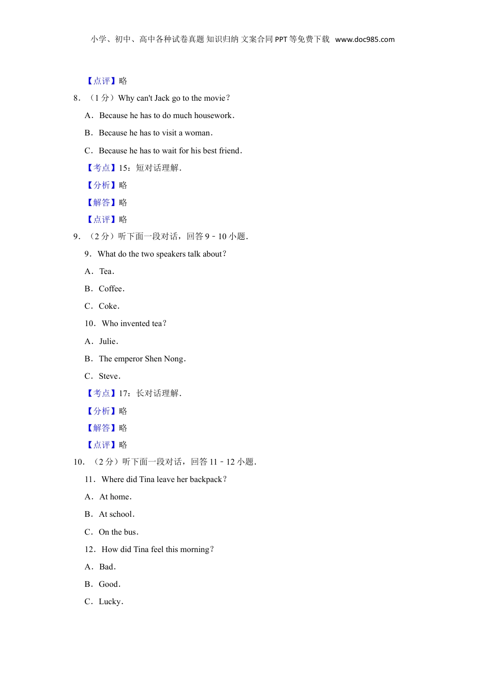 小学、初中、高中各种试卷真题知识归纳文案合同PPT等免费下载www.doc985.com2012年湖南省株洲市中考英语试卷(教师版)一、听力题(共12小题,满分20分)1.(1分)【考点】14:听录音选图.菁优网版权所有【分析】略【解答】略【点评】略2.(1分)【考点】14:听录音选图.菁优网版权所有【分析】略【解答】略【点评】略3.(1分)【考点】14:听录音选图.菁优网版权所有【分析】略【解答】略【点评】略小学、初中、高中各种试卷真题知识归纳文案合同PPT等免费下载www.doc985.com4.(1分)【考点】14:听录音选图.菁优网版权所有【分析】略【解答】略【点评】略5.(1分)WhendidJohnwatchthefootballmatch?A.Yesterdaymorning.B.Yesterdayafternoon.C.Lastnight.【考点】15:短对话理解.菁优网版权所有【分析】略【解答】略【点评】略6.(1分)Wherewillthetwospeakersgo?A.Toabookshop.B.Toahospital.C.Toaschool.【考点】15:短对话理解.菁优网版权所有【分析】略【解答】略【点评】略7.(1分)Howwastheweatheryesterday?A.Sunny.B.Rainy.C.Cloudy.【考点】15:短对话理解.菁优网版权所有【分析】略【解答】略小学、初中、高中各种试卷真题知识归纳文案合同PPT等免费下载www.doc985.com【点评】略8.(1分)Whycan'tJackgotothemovie?A.Becausehehastodomuchhousework.B.Becausehehastovisitawoman.C.Becausehehastowaitforhisbestfriend.【考点】15:短对话理解.菁优网版权所有【分析】略【解答】略【点评】略9.(2分)听下面一段对话,回答9﹣10小题.9.Whatdothetwospeakerstalkabout?A.Tea.B.Coffee.C.Coke.10.Whoinventedtea?A.Julie.B.TheemperorShenNong.C.Steve.【考点】17:长对话理解.菁优网版权所有【分析】略【解答】略【点评】略10.(2分)听下面一段对话,回答11﹣12小题.11.WheredidTinaleaveherbackpack?A.Athome.B.Atschool.C.Onthebus.12.HowdidTinafeelthismorning?A.Bad.B.Good.C.Lucky.小学、初中、高中各种试卷真题知识归纳文案合同PPT等免费下载www.doc985.com【考点】17:长对话理解.菁优网版权所有【分析】略【解答】略【点评】略11.(4分)第三节听短文,然后根据短文内容判断下列句子的正误(T/F).13.Peterhasalovelydog.14.PeterhasnotimetolookafterKittynow.15.Peterisstudyingforamathcompetition.16.Thecompetitionwillbeheldnextmonth.【考点】16:短文理解.菁优网版权所有【分析】略【解答】略【点评】略12.(4分)第四节根据你所听到的内容,填写下面的表格,每空不超过3个单词.Mynewfriend,JaneAge(17)Appearancetalland(18)LanguagesEnglishandalittle(19)Hobbies(20)anddancing【考点】16:短文理解.菁优网版权所有【分析】略【解答】略【点评】略II.知识运用(两节,共20个小题,计20分)第一节单项填空。从A、B、C三个选项中选择最佳答案填空。(共10个小题,每小题1分)13.(1分)Thisis______story﹣book.ItwaswrittenbyYangHongying.()A.theB.aC.an【考点】52:不定冠词(a,an).菁优网版权所有【分析】这是一本故事书,它是杨红樱写的.【解答】答案B结合句意,根据story﹣book为可数名词单数形式,泛指一本书,故排除A,再根据a与小学、初中、高中各种试卷真题知识归纳文案合同PPT等免费下载www.doc985.coman区别,a用于辅音音素前,而an则用于元音音素前,story﹣book发/stɔ:rɪbʊk/,辅音因素开头,排除C,故选B【点评】结合句意,利用排除法,排除不合适选项,再根据a与an区别,推出答案14.(1分)Bananas,applesandorangesareall____________.()A.fruitsB.vegetablesC.drinks【考点】48:名词的词义辨析.菁优网版权所有【分析】香蕉、苹果和橙子都是水果.【解答】答案:Afruit水果;vegetable蔬菜;drink饮料;根据Bananas,applesandoranges可知它们都是水果,故选A.【点评】本题考查名词词义辨析,先弄清所给词的词义,再根据情景选择正确答案.15.(1分)It'scoldoutside.You'dbetter__...