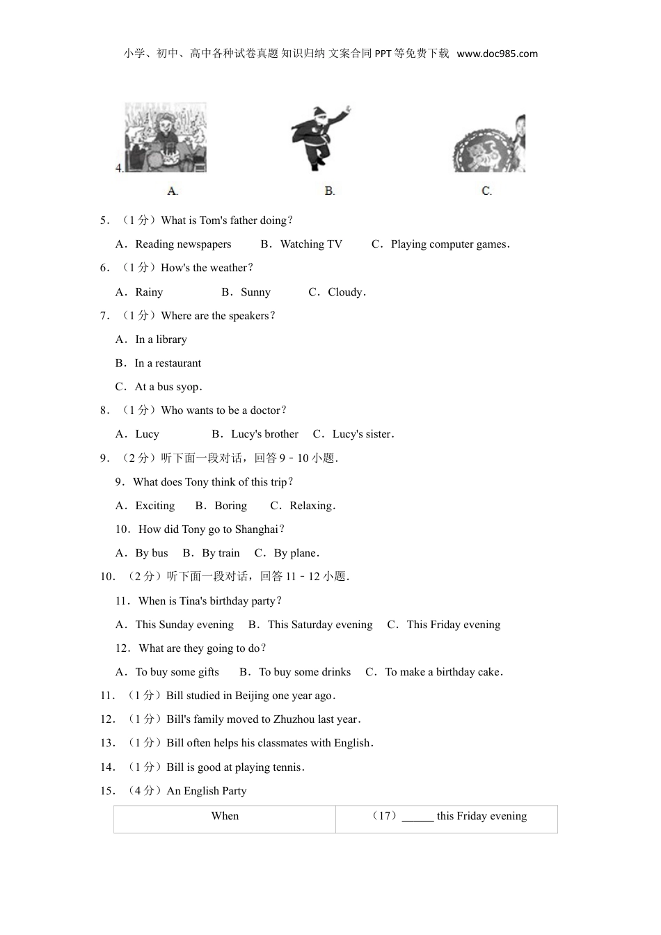 小学、初中、高中各种试卷真题知识归纳文案合同PPT等免费下载www.doc985.com2011年湖南省株洲市中考英语试卷一、听力技能(共15小题,满分20分)1.(1分)2.(1分)3.(1分)4.(1分)小学、初中、高中各种试卷真题知识归纳文案合同PPT等免费下载www.doc985.com5.(1分)WhatisTom'sfatherdoing?A.ReadingnewspapersB.WatchingTVC.Playingcomputergames.6.(1分)How'stheweather?A.RainyB.SunnyC.Cloudy.7.(1分)Wherearethespeakers?A.InalibraryB.InarestaurantC.Atabussyop.8.(1分)Whowantstobeadoctor?A.LucyB.Lucy'sbrotherC.Lucy'ssister.9.(2分)听下面一段对话,回答9﹣10小题.9.WhatdoesTonythinkofthistrip?A.ExcitingB.BoringC.Relaxing.10.HowdidTonygotoShanghai?A.BybusB.BytrainC.Byplane.10.(2分)听下面一段对话,回答11﹣12小题.11.WhenisTina'sbirthdayparty?A.ThisSundayeveningB.ThisSaturdayeveningC.ThisFridayevening12.Whataretheygoingtodo?A.TobuysomegiftsB.TobuysomedrinksC.Tomakeabirthdaycake.11.(1分)BillstudiedinBeijingoneyearago.12.(1分)Bill'sfamilymovedtoZhuzhoulastyear.13.(1分)BilloftenhelpshisclassmateswithEnglish.14.(1分)Billisgoodatplayingtennis.15.(4分)AnEnglishPartyWhen(17)thisFridayevening小学、初中、高中各种试卷真题知识归纳文案合同PPT等免费下载www.doc985.comWhere(18)ActivitiesenjoyEnglishsongsandstories(19)talkwithforeignfriendsRulesnotbringfriendsfromotherschoolsnotbring(20)tothepartyⅡ知识运用(两节,共20个小题,计20分)第一节单项填空从A、B、C三个选项中选择最佳答案填空.(共10个小题,每小题1分)16.(1分)Healthyfoodandexercisehelp________tostudybetter.()A.usB.weC.our17.(1分)Iamgoingtomake________specialhouseformypetpigthisweekend.()A.anB.aC.the18.(1分)Listen!Someone_________forhelp!()A.calledB.iscallingC.hascalled19.(1分)﹣Let'sgodancingtonight!﹣Sorry,I________.Ihavetogotomyguitarlesson.()A.mustn'tB.needn'tC.can't20.(1分)﹣Doyouknow________shewenttothemovielastnight?﹣Onfoot.()A.whenB.whyC.how21.(1分)Tonywants_______ajobasalanguageteacherinChina.()A.tofindB.findingC.find22.(1分)Marydidn'tgotoJohn'sbirthdaypartybecauseshe________.()A.wasn'tinvitedB.didn'tinviteC.isn'tinvited23.(1分)Heknows_________aboutcomputerthanme.()A.muchB.moreC.most24.(1分)Jim_________inZhuzhousincehefinishedhiscollege.()A.worksB.isworkingC.hasworked25.(1分)Ginalovessingers_______writetheirownmusic.()小学、初中、高中各种试卷真题知识归纳文案合同PPT等免费下载www.doc985.comA.whichB.whoC.hasworked第二节完形填空通读下面的短文,掌握其大意,然后从各题所给的A、B、C三个选项中选出一个最佳答案.(共10个小题,每小题10分)26.(10分)Oneverycoldmorning,my,fatherandIwereworkingonthefarm.IaskedhimhowlongImuststayinthe(31)."Aboutanhour."heanswered."IwishIcouldgohonenow﹣my(32)aches.""Iamsorry,butcan'tyoustaytilllunchtime?"saidmyfather."Butmyheadacheisgetting(33).""Well,"saidhe,"youmaygohome.Idon'twantyoutoworkifyouaresick.Gostraighthome(34)tellyourmothertogiveyousomerhubarb(大黄,一种苦药).Itwill(35)youalot."Iwentbackhome.However,Itoldmymotherthatmyheadwasbetter,hopingnotto(36)theterriblemedicine.Butitwastoo(37).Sheunderstoodmy(38)aswellasmyfather.Soshepreparedtherhubarb.Ihadtoswallow(吞)alloftherhubarb.Dearme!Howbitteritwas!Iwouldrather(39)alldayinthefield.Butitcured(治愈)mylaziness,andIlearnedthatitisimportanttobe(40...