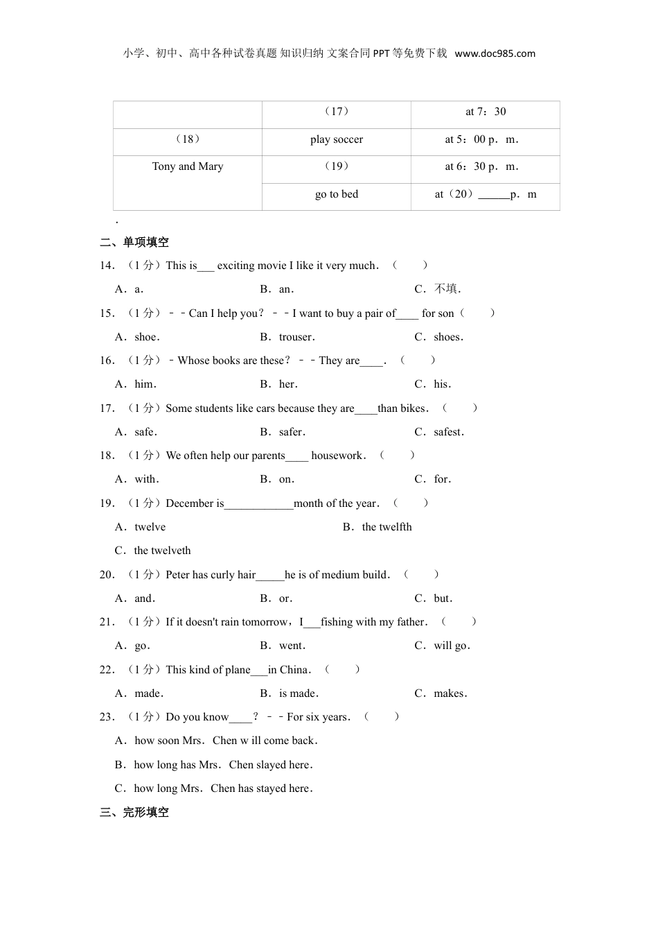 小学、初中、高中各种试卷真题知识归纳文案合同PPT等免费下载www.doc985.com2015年湖南省怀化市中考英语试卷一、听力题1.(1分)2.(1分)3.(1分)4.(1分)5.(1分)6.(1分)WhatisTina'sfavoritecolor?A.Blue.B.Black.C.Green.7.(1分)Whoseruleristhis!A.Peter's.B.Jim's.C.Tom's.8.(1分)WheredidKategolastSunday?A.Shewenttothebeach.B.Sheclimbedthemountains.小学、初中、高中各种试卷真题知识归纳文案合同PPT等免费下载www.doc985.comC.Shevisitedhergrandparents.9.(1分)A.MondayB.TuesdayC.wednesday.10.(1分)Whyisn'tTimatschool?A.Becausehehasitfever.B.Shehasatoothache.C.Shehasaheadache.11.(2分)听下面的对话,回答第11﹣12小题.11.WhatisTimgoingtobewhenhegrowsup?A.Anengineer.B.Adoctor,CAcomputerprogrammer.12.Howishegoingtodothat?A.Heisgoing10lakeactinglessons.B.Heisgoing10lakepianolessons.C.Heisgoingtostudyhard.12.(3分)听下面的对话,问答第13﹣15小题.13.Whatsubjec1doesMrSmithteach?A.Math.B.Music.C.P.E.14.WhatdoesMr.Smithlklike?A.Heistall.B.Heisshort.C.Heisofmediumheigh1.15.WhatdoesSallythinkofhermathteacher?A.Strict.B.Popular.C.Funny.13.(5分)NamesActivitiesTimeTonyandMarygetupat(16)a.m.小学、初中、高中各种试卷真题知识归纳文案合同PPT等免费下载www.doc985.com(17)at7:30(18)playsoccerat5:00p.m.TonyandMary(19)at6:30p.m.gotobedat(20)p.m.二、单项填空14.(1分)Thisis___excitingmovieIlikeitverymuch.()A.a.B.an.C.不填.15.(1分)﹣﹣CanIhelpyou?﹣﹣Iwanttobuyapairof____forson()A.shoe.B.trouser.C.shoes.16.(1分)﹣Whosebooksarethese?﹣﹣Theyare____.()A.him.B.her.C.his.17.(1分)Somestudentslikecarsbecausetheyare____thanbikes.()A.safe.B.safer.C.safest.18.(1分)Weoftenhelpourparents____housework.()A.with.B.on.C.for.19.(1分)Decemberis____________monthoftheyear.()A.twelveB.thetwelfthC.thetwelveth20.(1分)Peterhascurlyhair_____heisofmediumbuild.()A.and.B.or.C.but.21.(1分)Ifitdoesn'traintomorrow,I___fishingwithmyfather.()A.go.B.went.C.willgo.22.(1分)Thiskindofplane___inChina.()A.made.B.ismade.C.makes.23.(1分)Doyouknow____?﹣﹣Forsixyears.()A.howsoonMrs.Chenwillcomeback.B.howlonghasMrs.Chenslayedhere.C.howlongMrs.Chenhasstayedhere.三、完形填空小学、初中、高中各种试卷真题知识归纳文案合同PPT等免费下载www.doc985.com24.(15分)WhenIwasabout12yearsold,Ireallywantedanew(31)!Itoldmyparentsmybirthdaywish,butIknewtherewaslittlehopebecausemyfamilycould(32)havethatmoney.Onmybirthdaymyparentstoldmetheyhadmygiftoutsideinthebackyard.AtonceIrushedouttotheyard.Therewasmybike,butitwasn'tthebikeIwanted.Thisonewas(33)andrusty(生锈的),Ididn'tlikeitall!IthoughtIhurtmyparents'feelings(34)theysawthedisappointmentonmyfaces.I(35)theoldbikeandrodeit,feelingbadthatIhadmademyparentsfeelthisway.SoIputonasmile,rodeas(36)asIcouldanddidn'tlookbackAstimewentby,Ibeganto(37)myparentsgavemesomethingmuchmorethanjustarusty(生锈的)oldbike.Theygavemealifelessonaboutlove.Whenyougive(38)outoflove,itdoesn'tmatterwhatitisin.Whatmattersisthelovethatisinit.Iliketorememberthisstorybecausegivingagiftisnotaboutmoney.It'sabouthowmuch(39)youcanfeelfromit.Rememberthis,agiftthatcost2!isn'tany(40)valuable(有价值的)thanonethatcostsonehundreddollars.31.A.bikeB.cameraC.modelplane32.A.slowlyB.qui...