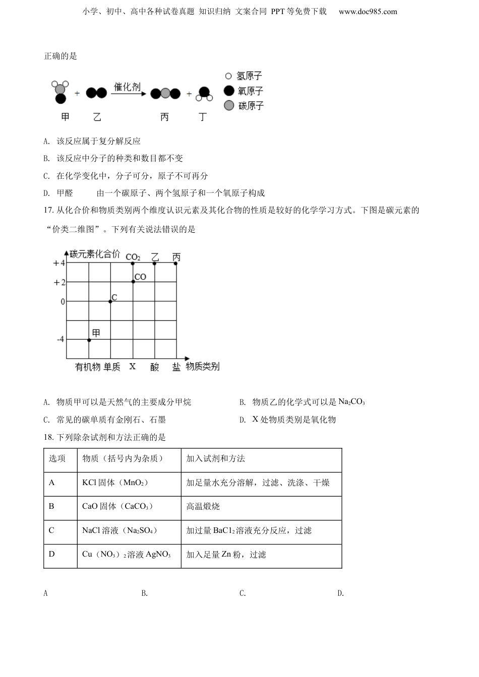 小学、初中、高中各种试卷真题知识归纳文案合同PPT等免费下载www.doc985.com2022年湘潭市初中毕业学业考试可能用到的相对原子质量:H-1C-12O-16Na-23Mg-24S-32C1-35.5Ca-40一、选择题(本题包括20小题,每小题2分,共40分。每小题只有一个正确答案)1.中国古代文明与技术,促进了世界文明发展。下列古代工艺主要发生化学变化的是A.活字印刷B.海水晒盐C.彩陶烧制D.机杼织布2.下列物质的用途主要利用其物理性质的是A.酒精用作燃料B.石墨用作电极C.小苏打用于治疗胃酸过多D.熟石灰用来改良酸性土壤3.下列厨房中的物品所使用的主要材料属于有机合成材料的是A.塑料盆B.玻璃杯C.不锈钢炊具D.木筷4.绿植养护需要用到营养液,下列营养液的成分中属于复合肥的是A.(NH4)2SO4B.Ca(H2PO4)2C.KNO3D.KCl5.下列四种元素,幼儿及青少年缺少时会患佝偻病和发育不良的是()A.锌B.铁C.碘D.钙6.正确的操作是实验成功的基础。下列操作中错误的是A.量取液体的体积B.稀释浓硫酸C.连接仪器D.熄灭酒精灯7.下列物质能在氧气中剧烈燃烧、火星四射、产生黑色固体的是A.木炭B.硫粉C.红磷D.铁丝8.2022年6月3日国家发改委、国家能源局等联合印发了《“十四五”可再生能源发展规划下列属于可再生能源的是A.风能B.煤C.天然气D.石油9.高铁是中国一张靓丽的名片,车厢内禁止吸烟须张贴的标志是小学、初中、高中各种试卷真题知识归纳文案合同PPT等免费下载www.doc985.comA.B.C.D.10.空气是人类赖以生存的物质基础。下列有关说法错误的是A.空气中的氧气是一种常见的燃料B.二氧化硫是空气污染物之一C.空气中氮气的体积分数约为78%D.植树造林有利于保护空气11.下列不能与稀盐酸反应的物质是A.银B.氧化铜C.碳酸钠D.氢氧化钾12.从宏观走进微观,探寻变化的奥秘,下列事实与微观解释不相符的是A.“酒香不怕巷子深”一一分子在不断运动B.6000L氧气加压可装入40L的钢瓶中一一氧分子的体积变小C.品红在热水中比在冷水中扩散会更快一一温度升高分子运动加快D.1滴水中大约有167×1021个水分子一一通常分子的质量和体积都很小13.青铜是人类最早使用的铜锡合金。下列说法中错误的是A.青铜属于金属材料B.青铜的硬度比纯铜更大C.青铜的熔点比纯铜的熔点要低D.铜是目前世界年产量最高的金属14.下列实验操作或对意外事故的处理方法错误的A.取液后的胶头滴管平放于实验台上B.实验时,应穿好实验服,戴好防护眼镜C.点燃氢气等可燃性气体前一定要检验其纯度D.若不慎将浓硫酸沾到皮肤上,应立即用大量水冲洗,再涂上3%~5%的碳酸氢钠溶液15.下列关于燃烧与灭火的说法错误的是A.电器失火立即用水灭火B.白磷放入水中保存,是为了隔绝空气C.剪烛芯使蜡烛熄灭的原理是清除可燃物D.扑灭图书、档案等物的失火,应使用二氧化碳灭火器16.科学家研制出了一种可用于去除甲醛(CH2O)的方法,其反应的微观示意图如下,从图中获取的信息小学、初中、高中各种试卷真题知识归纳文案合同PPT等免费下载www.doc985.com正确的是A.该反应属于复分解反应B.该反应中分子的种类和数目都不变C.在化学变化中,分子可分,原子不可再分D.甲醛是由一个碳原子、两个氢原子和一个氧原子构成17.从化合价和物质类别两个维度认识元素及其化合物的性质是较好的化学学习方式。下图是碳元素的“价类二维图”。下列有关说法错误的是A.物质甲可以是天然气的主要成分甲烷B.物质乙的化学式可以是Na2CO3C.常见的碳单质有金刚石、石墨D.X处物质类别是氧化物18.下列除杂试剂和方法正确的是选项物质(括号内为杂质)加入试剂和方法AKCl固体(MnO2)加足量水充分溶解,过滤、洗涤、干燥BCaO固体(CaCO3)高温煅烧CNaCl溶液(Na2SO4)加过量BaC12溶液充分反应,过滤DCu(NO3)2溶液AgNO3加入足量Zn粉,过滤A.B.C.D.小学、初中、高中各种试卷真题知识归纳文案合同PPT等免费下载www.doc985.com19.在一密闭容器内加入X、Y、Z、W四种物质,一定条件下发生化学反应。一段时间后,测得反应前后各物质的质量如下表(已知X、Y的相对分子质量之比为14:1)。下列说法正确的是物质XYZW反应前质量/g4012110反应后质量/g126待测44A.W可能是单质B.反应中X、W两物质变化的质量比是3:11C.Z一定是该反应...