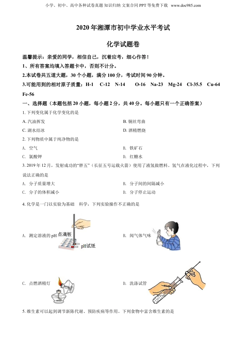 小学、初中、高中各种试卷真题知识归纳文案合同PPT等免费下载www.doc985.com2020年湘潭市初中学业水平考试化学试题卷温馨提示:亲爱的同学,相信自己,沉着应考,细心作答!1、所有答案均填入答题卡中,否则不计分。2.本试卷共五道大题,30个小题,满分100分,考试时间90分钟。3.可能用到的相对原子质量:H-1C-12N-14O-16Na-23Mg-24Cl-35.5Cu-64Fe-56一、选择题(本题包括20小题,每小题2分,共40分。每小题只有一个正确答案)1.下列变化属于化学变化的是A.汽油挥发B.铜丝弯曲C.湖水结冰D.酒精燃烧2.下列物质中属于纯净物的是A.空气B.铁矿石C.氯酸钾D.红糖水3.2019年12月,发射成功的“胖五”(长征五号运载火箭)使用了液氢做燃料。氢气在液化过程中,下列说法正确的是A.分子质量增大B.分子间的间隔减小C.分子的体积减小D.分子停止运动4.化学是一门以实验为基础的科学,下列实验操作不正确的是A.测定溶液的pHB.闻气体气味C.点燃酒精灯D.洗涤试管5.维生素可以起到调节新陈代谢、预防疾病等作用。下列食物中富含维生素的是小学、初中、高中各种试卷真题知识归纳文案合同PPT等免费下载www.doc985.comA.凉拌黄瓜B.毛氏红烧肉C.清蒸鳜鱼D.麻婆豆腐6.下列物质在氧气中燃烧,有刺激性气味的气体生成的是A.镁条B.铁丝C.白磷D.硫7.化肥对提高农作物的产量具有重要作用。下列化肥中属于磷肥的是A.Ca3(PO4)2B.KClC.CO(NH2)2D.KNO38.化学元素与人体健康密切相关。下列元素缺乏会引起食欲不振,生长迟缓,发育不良的是A.氟B.锌C.钙D.硒9.2020年,“中国水周”活动的主题为“坚持节水优先,建设幸福河湖”。下列图标是我国“国家节水标志”的是A.B.C.D.10.C3N4是一种新型材料,其中碳元素的化合价为+4价,则氮元素的化合价为A.-4B.+3C.+4D.-311.生活中一些常见物质的近似pH如下,其中碱性最强的是A.肥皂9.5~10.5B.厕所清洁剂1.2~2.0C.炉具清洁剂12.0~13.0D.牙膏8.2~8.912.我国第一艘国产航母“山东舰”在制造的过程中使用了大量的金属材料。下列有关金属材料的说法错误的是A.合金的硬度一般比组成它们的纯金属更高B.钢铁是使用最多的金属材料C.金属在常温下都是固体D.大多数金属为电和热的优良导体13.为及时发现燃气泄漏,常在燃气中加入微量具有难闻气味的乙硫醇(C2H5SH),乙硫醇燃烧的化学方小学、初中、高中各种试卷真题知识归纳文案合同PPT等免费下载www.doc985.com程式为:,其中X的化学式为A.SO2B.H2SC.COD.H214.防火安全重于泰山,每个公民掌握一定的消防知识很有必要。下列有关灭火措施处理不当的是A.炒菜时油锅中的油不慎着火,可用锅盖盖灭B.家用电器着火时,立即用水进行灭火C.油罐着火时需要用水喷淋降温D.可用二氧化碳灭火器扑灭图书、档案、贵重设备、精密仪器等物的失火15.某反应的微观示意图如下图所示,其中“”代表氢原子,“”代表氧原子,“”代表碳原子,下列说法错误的是A.该反应属于化合反应B.反应前后原子数目不变C.反应中甲、乙的分子个数之比为1:1D.甲和丙都属于氧化物16.某pH=12的无色溶液中大量存在的离子有Na+、Ba2+、NO、X,则X可能是A.Cu2+B.Cl-C.H+D.SO17.归纳总结是学习化学的重要方法之一。下列选项正确的是A.金属的熔点:B.地壳中的元素含量:C.空气中气体的体积分数:D.金属的活动性顺序:18.下列除杂的试剂和方法不可行的是选项物质(括号内为杂质)除杂试剂和方法小学、初中、高中各种试卷真题知识归纳文案合同PPT等免费下载www.doc985.comACO2(CO)通过足量灼热的氧化铜BFeSO4溶液(CuSO4)加入过量铁粉,过滤CNaCl(AgCl)加足量水溶解、过滤、蒸发结晶DCuO(C)加足量稀盐酸,过滤,干燥A.AB.BC.CD.D19.下列图像分别表示实验过程中某些量的变化,其中叙述正确的是A.图A是加热一定质量的氯酸钾和二氧化锰的固体混合物B.图B是在某一密闭装置内点燃白磷C.图C是向一定量的硫酸和硫酸铜的混合溶液中逐渐滴加氢氧化钠溶液D.图D是向一定质量的蒸馏水中逐渐加入生石灰20.某固体由镁、锌、铁三种金属中的一种或几种组成,现取ag固体于烧杯中,再加入足量稀盐酸,充分反应后,将所得溶液小心蒸干(不考虑操作过程中物质的损耗),得到(a+14.2)g不含结晶...