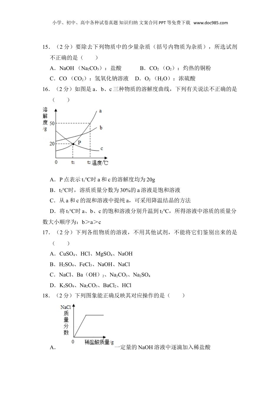 小学、初中、高中各种试卷真题知识归纳文案合同PPT等免费下载www.doc985.com2017年湖南省湘潭市中考化学试卷一、选择题(本题包括20小题,每小题2分,共40分.每小题只有一个正确答案)1.(2分)下列变化过程中主要发生物理变化的是()A.石油分馏B.火药爆炸C.粮食酿酒D.高炉炼铁2.(2分)下列物品所使用的主要材料,不属于有机高分子材料的是()A.汽车轮胎B.手机塑料外壳C.钛合金表链D.羊绒围巾3.(2分)下列实验操作不正确的是()A.倾倒液体B.取用固体C.读液体体积D.检查装置气密性4.(2分)下列物质加入水中,不能形成溶液的是()A.食盐B.葡萄糖C.氢氧化钠D.植物油5.(2分)米饭能为人体提供的营养素是()A.糖类B.蛋白质C.无机盐D.维生素6.(2分)下列对实验现象的描述,错误的是()A.镁条在空气中剧烈燃烧,发出耀眼白光,生成一种白色固体B.硫在氧气中燃烧产生明亮的蓝紫色火焰,生成无色有刺激性气味的气体C.铁丝在氧气中剧烈燃烧,火星四射,生成一种红色固体D.将少量高锰酸钾放入水中,所得溶液呈紫红色7.(2分)“端午粽飘香”的现象说明分子()A.大小改变B.间隔改变C.不停运动D.质量改变小学、初中、高中各种试卷真题知识归纳文案合同PPT等免费下载www.doc985.com8.(2分)下列物质的化学名称与俗名,对应错误的是()A.汞一水银B.氯化钠一食盐C.乙醇一酒精D.氧化钙一熟石灰9.(2分)2017年中国水周的宣传主题为“落实绿色理念,全面推行河长制”.下列有关说法中不正确的是()A.硬水经过吸附、过滤可变成软水B.净化水程度最高的方法是蒸馏C.水是一种常见的溶剂D.为爱护水资源,既要节约用水,又要防止水污染10.(2分)目前,湘潭市正在努力创建全国文明卫生城市.下列做法不符合这一主题的是()A.城市道路定时洒水降尘B.公共场所禁止吸烟C.建筑工地加强扬尘控制D.垃圾露天焚烧处理11.(2分)风吹灭蜡烛,主要灭火原理是()A.隔绝空气B.降低可燃物的着火点C.消除可燃物D.使可燃物温度降到着火点以下12.(2分)二氧化铅(PbO2)是生产汽车蓄电池的电极材料,其中铅元素的化合价是()A.+1B.+2C.+4D.﹣413.(2分)往适量的水中加入下列物质,温度明显降低的是()A.浓硫酸B.氢氧化钠C.氯化钠D.硝酸铵14.(2分)如图是某个化学反应的微观示意图,图中“〇”、“●”表示不同元素的原子.从图中获得的有关信息不正确的是()A.化学反应中分子可分为原子B.该反应为置换反应C.反应前后原子的种类不变D.生成物为化合物小学、初中、高中各种试卷真题知识归纳文案合同PPT等免费下载www.doc985.com15.(2分)要除去下列物质中的少量杂质(括号内物质为杂质),所选试剂不正确的是()A.NaOH(Na2CO3):盐酸B.CO2(O2):灼热的铜粉C.CO(CO2):氢氧化钠溶液D.O2(H2O):浓硫酸16.(2分)如图是a.b、c三种物质的溶解度曲线,下列有关说法不正确的是()A.P点表示t1℃时a和c的溶解度均为20gB.t2℃时,溶质质量分数为30%的a溶液是饱和溶液C.从a和c的混和溶液中提纯a,可采用降温结晶的方法D.将t1℃时a、b、c的饱和溶液分别升温到t2℃,所得溶液中溶质的质量分数大小顺序为:b>a>c17.(2分)下列各组物质的溶液,不用其他试剂,不能将它们鉴别出来的是()A.CuSO4、HCl、MgSO4、NaOHB.H2SO4、FeCl3、NaOH、NaClC.NaCl、Ba(OH)2、Na2CO3、Na2SO4D.K2SO4、Na2CO3、BaCl2、HCl18.(2分)下列图象能正确反映其对应操作的是()A.一定量的NaOH溶液中逐滴加入稀盐酸小学、初中、高中各种试卷真题知识归纳文案合同PPT等免费下载www.doc985.comB.等质量、等质量分数的稀硫酸中分别加入足量的镁粉和锌粉C.用适量KClO3和MnO2的混合物加热制取O2D.等质量、不同形状的石灰石中分別加入足量相同的稀盐酸19.(2分)一定条件下,一个密闭容器内发生反应,测得反应前后各物质的质量如下表所示.下列有关说法不正确的是()物质ABCD反应前的质量(g)15152520反应后的质量(g)010xyA.x的取值范围是:0≤X≤45B.参加反应的A和B的质量之比为3:1C.当y≤20时,该反应为化合反应D.x+y=65...