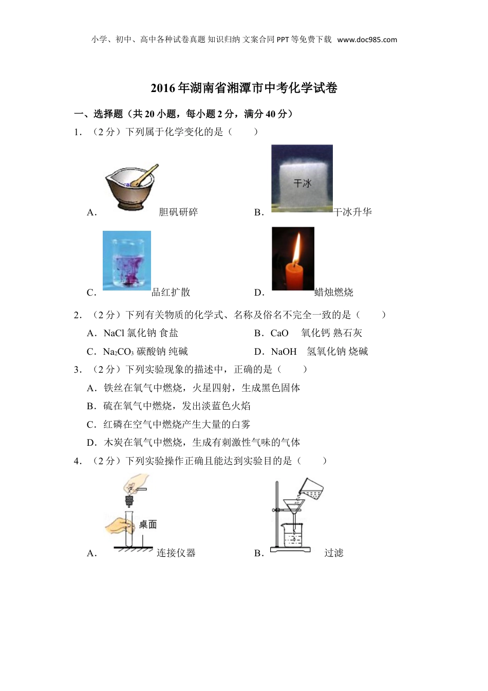 小学、初中、高中各种试卷真题知识归纳文案合同PPT等免费下载www.doc985.com2016年湖南省湘潭市中考化学试卷一、选择题(共20小题,每小题2分,满分40分)1.(2分)下列属于化学变化的是()A.胆矾研碎B.干冰升华C.品红扩散D.蜡烛燃烧2.(2分)下列有关物质的化学式、名称及俗名不完全一致的是()A.NaCl氯化钠食盐B.CaO氧化钙熟石灰C.Na2CO3碳酸钠纯碱D.NaOH氢氧化钠烧碱3.(2分)下列实验现象的描述中,正确的是()A.铁丝在氧气中燃烧,火星四射,生成黑色固体B.硫在氧气中燃烧,发出淡蓝色火焰C.红磷在空气中燃烧产生大量的白雾D.木炭在氧气中燃烧,生成有刺激性气味的气体4.(2分)下列实验操作正确且能达到实验目的是()A.连接仪器B.过滤小学、初中、高中各种试卷真题知识归纳文案合同PPT等免费下载www.doc985.comC.稀释浓硫酸D.检查气密性5.(2分)下列说法正确的是()A.锈蚀后的铁制品没有回收价值B.用活性炭除异味是利用了其吸附性C.农药和化肥的使用对生活和生产有利无弊D.海鲜可浸泡在甲醛溶液中保鲜6.(2分)下列关于“燃烧和灭火”的叙述正确的是()A.油锅着火可立即盖上锅盖灭火B.用扇子扇风熄灭蜡烛是因为隔绝了氧气C.可燃物与氧气接触就可以燃烧D.只有含碳元素的物质才能燃烧7.(2分)下列化肥属于含磷复合肥料的是()A.NH4NO3B.KNO3C.(NH4)2HPO4D.Ca(H2PO4)28.(2分)某同学经体验发现缺少维生素,该同学饮食中需要适量增加的食物是()A.米饭、面条B.蔬菜、水果C.瘦肉、鸡蛋D.奶油、花生油9.(2分)下列事实的微观解释错误的是()选项事实微观解释A温度降低,汽油的密度增大分子的体积变小B春天公园里散发出阵阵花香分子在不断运动C10mL酒精与10mL水混合后体积小于20mL分子之间有间隙D一滴水中含有约1.67×1021个水分子水分子的体积和质量都很小A.AB.BC.CD.D10.(2分)测定人体内体液的pH,可以帮助人们了解身体的健康状况,一些体液的近似pH如下:小学、初中、高中各种试卷真题知识归纳文案合同PPT等免费下载www.doc985.com液体胃液胰液胆汁血浆pH0.91.5﹣7.58.0﹣7.17.3﹣7.357.45﹣下列液体中,碱性最强的是()A.胃液B.胰液C.胆汁D.血浆11.(2分)2015年3月9日,太阳能飞机“阳光动力2号”开始环球飞行,并在名古屋和夏威夷之间创下了118小时不间断飞行的记录,下列有关能源和环保的说法错误的是()A.“阳光动力2号”所用太阳能是绿色环保新能源B.煤、石油、天然气等化石燃料是不可再生能源C.煤完全燃烧后就不会对环境造成污染D.可燃冰具有能量高、燃烧值大等优点,其主要成分是CH412.(2分)每年5月12日是我国的“防灾减灾日”,以下有关火灾现场处理方法错误的是()A.身上着火不可乱跑,要就地打滚使火熄灭B.用水浇湿毛巾或衣物,捂住口鼻,低姿行走到安全通道C.人员被火势围困在高层建筑时使用楼内电梯撤退D.逃生路线被火封住,应退回室内,关闭门窗,向门窗浇水,发出求救信号13.(2分)被誉为“21世纪神奇材料”的石墨烯以其神奇特性承载着人们的无数想象。石墨烯是从石墨中分离出来的一层或几层碳原子构成的石墨片,用石墨烯和铝合金可制出一种具备特殊性能的烯合金,下列对石墨烯和烯合金的说法错误的是()A.石墨烯在一定条件下能与氧化反应B.石墨烯是一种新型的化合物C.烯合金具有优良的导电性D.烯合金是一种新型材料14.(2分)下列物质露置在空气中一段时间后,因为发生化学变化而质量增加的是()A.浓硫酸B.浓盐酸C.氢氧化钠D.石灰石小学、初中、高中各种试卷真题知识归纳文案合同PPT等免费下载www.doc985.com15.(2分)下列各组离子在pH=1的溶液中能大量共存,并形成无色透明溶液的是()A.Fe3+、NO3﹣、OH﹣B.K+、NO3﹣、CO32﹣C.Ba2+、MnO4﹣、SO42﹣D.NH4+、Cl﹣、SO42﹣16.(2分)下列关于溶液的说法错误的是()A.固体、液体、气体都可以做溶质B.NH4NO3溶解过程中吸热,溶液温度降低C.欲使100克KNO3溶液的质量分数由5%变成10%,可向其中加入5克KNO3固体D.25℃时,将某KNO3溶液蒸发10克水析出a克晶体,再蒸发10克水析出b克晶体,a与b的质量不...