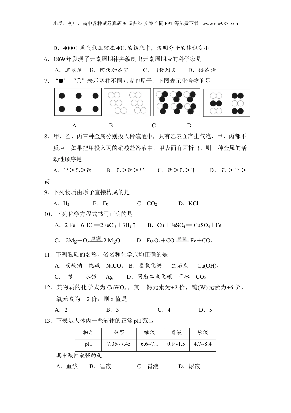 小学、初中、高中各种试卷真题知识归纳文案合同PPT等免费下载www.doc985.com2018年湖南省邵阳市中考化学试卷考试时量为90分钟,满分为100分。可能用到的相对原子质量:H—1C—12O—16Na—23Mg—24Al—27Cl—35.5一、选择题。(本大题共25个小题,每小题2分,共50分。每小题只有一个选项符合题意)1.下列过程发生化学变化的是A.西瓜榨汁B.滴水成冰C.纸张燃烧D.蜡烛熔化2.空气是一种宝贵的自然资源。右图为空气成分示意图,其中R指的是A.氮气B.氧气C.稀有气体D.二氧化碳3.下列有关实验现象描述正确的是A.硫在氧气中燃烧产生淡蓝色的火焰B.红磷在空气中燃烧产生大量的白烟C.碳在空气中燃烧生成二氧化碳D.将铁丝伸入盛有氧气的集气瓶中剧烈燃烧4.下列图示操作正确的是ABCDA.浓硫酸的稀释B.给液体加热C.测定溶液的pHD.量取一定量的液体5.下列说法正确的是A.水变成水蒸气说明分子可以再分B.八月丹桂飘香,说明分子在不停运动C.保持水的化学性质的最小粒子是氢原子和氧原子小学、初中、高中各种试卷真题知识归纳文案合同PPT等免费下载www.doc985.comD.4000L氧气能压缩在40L的钢瓶中,说明分子的体积变小6.1869年发现了元素周期律并编制出元素周期表的科学家是A.道尔顿B.阿伏加德罗C.门捷列夫D.侯德榜7.“”“”表示两种不同元素的原子,下图表示化合物的是ABCD8.甲、乙、丙三种金属分别投入稀硫酸中,只有乙表面产生气泡,甲、丙都不反应;如果把甲投入丙的硝酸盐溶液中,甲表面有丙析出,则三种金属的活动性顺序是A.甲>乙>丙B.乙>丙>甲C.丙>乙>甲D.乙>甲>丙9.下列物质由原子直接构成的是A.H2B.FeC.CO2D.KCl10.下列化学方程式书写正确的是A.2Fe+6HCl==2FeCl3+3H2↑B.Cu+FeSO4==CuSO4+FeC.2Mg+O22MgOD.Fe2O3+COFe+CO211.下列物质的名称、俗名和化学式均正确的是A.碳酸钠纯碱NaCO3B.氢氧化钙生石灰Ca(OH)2C.银水银AgD.固态二氧化碳干冰CO212.某物质的化学式为CaWOx,其中钙元素为+2价,钨(W)元素为+6价,氧元素为—2价,则x值是A.2B.3C.4D.513.下表是人体内一些液体的正常pH范围物质血浆唾液胃液尿液pH7.35~7.456.6~7.10.9~1.54.7~8.4其中酸性最强的是A.血浆B.唾液C.胃液D.尿液小学、初中、高中各种试卷真题知识归纳文案合同PPT等免费下载www.doc985.com14.稀土是一种重要的战略资源。铈是一种常见的稀土元素,下列有关铈的说法正确的是A.铈属于非金属元素B.铈原子的中子数是58C.铈原子的核外电子数是58D.铈原子的相对原子质量是140.1g15.膳食平衡是人体健康的重要保证。蛋白质是构成细胞的基本物质,下列食物中富含蛋白质的是A.大米、小麦B.牛奶、鸡蛋C.花生油、猪油D.黄瓜、苹果16.某纯净物X在氧气中燃烧的化学方程式为:2X+5O24CO2+2H2O,则X的化学式是A.C2H4B.C2H5OHC.C2H2D.CH417.某原子得到两个电子后的结构示意图为,则x的值是A.14B.16C.18D.2018.吸烟有害身体健康,香烟的烟气中含有几百种有毒物质,其中易与人体血红蛋白相结合的有毒气体是A.CO2B.N2C.O2D.CO19.2018年3月9日,特朗普正式签署关税令“对进口钢铁和铝分别征收25%的关税”,这一做法严重违反国际贸易规则,严重损害我国利益。下列选项中不属于合金的是A.钢B.金刚石C.焊锡D.黄铜20.下列图像能正确反映其对应关系的是小学、初中、高中各种试卷真题知识归纳文案合同PPT等免费下载www.doc985.comA.①表示向NaOH溶液中不断加水稀释B.②表示水电解生成氢气与氧气的质量关系C.③表示用等质量、等质量分数的过氧化氢溶液制取氧气D.④表示分别向等质量、等质量分数的稀硫酸中加入足量的镁、铝21.用括号内的物质不能区分的一组是A.NaCl、NaOH、NH4NO3三种固体(水)B.K2CO3、Na2SO4、BaCl2三种溶液(稀硫酸)C.铁粉、碳粉、氧化铜粉末(稀盐酸)D.NaOH、NaCl、Na2SO4三种溶液(酚酞)22.推理是化学学习的重要方法,下列推理正确的是A.中和反应一定生成盐和水,则生成盐和水的反应一定是中和反应B.酸溶液一定显酸性,则显酸性的溶液一定是酸C.有氧气参加的反应一定是氧化反应,则氧化反应一定有氧气...