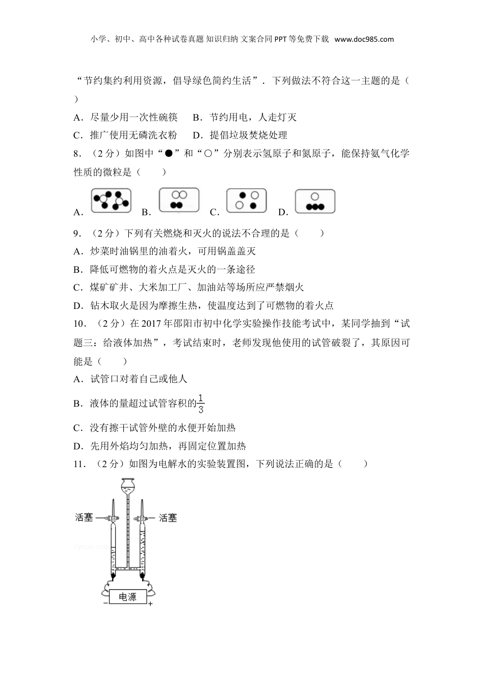 小学、初中、高中各种试卷真题知识归纳文案合同PPT等免费下载www.doc985.com2017年湖南省邵阳市中考化学试卷一、选择题(本大题共25小题,每小题2分,共50分,每小题只有一个选项符合题意)1.(2分)下列变化中,属于化学变化的是()A.瓷碗破碎B.冰雪融化C.大米酿酒D.铁铸成锅2.(2分)下列图示操作中错误的是()A.气密性检查B.pH值测定C.浓硫酸稀释D.滴加液体3.(2分)下列物品用到的主要材料,不属于有机合成材料的是()A.塑胶水管B.涤纶运动服C.汽车轮胎D.不锈钢饭盒4.(2分)2017年4月22日,湖南省首届芍药花节在邵东县斫曹乡芍药花基地举行,引来无数游客,走近基地,芍药花香扑面而来,用分子观点解释正确的是()A.分子不断运动B.分子很小C.不同分子,性质不同D.分子间有间隔5.(2分)下列有关实验现象的描述正确的是()A.红磷在空气中燃烧,产生大量白烟B.硫在空气中燃烧,发出明亮的蓝紫色火焰C.木炭在氧气中燃烧,发出白光,生成二氧化碳D.铁在空气中剧烈燃烧,火星四射,生成黑色固体6.(2分)某同学书写的试剂标签如图所示,其中错误的是()A.B.C.D.7.(2分)2017年4月22日是第48个世界地球日,我国今年的活动主题是小学、初中、高中各种试卷真题知识归纳文案合同PPT等免费下载www.doc985.com“节约集约利用资源,倡导绿色简约生活”.下列做法不符合这一主题的是()A.尽量少用一次性碗筷B.节约用电,人走灯灭C.推广使用无磷洗衣粉D.提倡垃圾焚烧处理8.(2分)如图中“●”和“○”分别表示氢原子和氮原子,能保持氨气化学性质的微粒是()A.B.C.D.9.(2分)下列有关燃烧和灭火的说法不合理的是()A.炒菜时油锅里的油着火,可用锅盖盖灭B.降低可燃物的着火点是灭火的一条途径C.煤矿矿井、大米加工厂、加油站等场所应严禁烟火D.钻木取火是因为摩擦生热,使温度达到了可燃物的着火点10.(2分)在2017年邵阳市初中化学实验操作技能考试中,某同学抽到“试题三:给液体加热”,考试结束时,老师发现他使用的试管破裂了,其原因可能是()A.试管口对着自己或他人B.液体的量超过试管容积的C.没有擦干试管外壁的水便开始加热D.先用外焰均匀加热,再固定位置加热11.(2分)如图为电解水的实验装置图,下列说法正确的是()小学、初中、高中各种试卷真题知识归纳文案合同PPT等免费下载www.doc985.comA.在水中加入少量硫酸钠以增强水的导电性B.与负极相连的玻璃管内得到的气体能使带火星的木条复燃C.该实验中所得氢气和氧气的质量比约为2:1D.该实验说明水是由氢气和氧气组成的12.(2分)下列化学方程式及其反应类型都正确的是()选项化学方程式反应类型AMg+O2MgO2化合反应BH2O2H2O+O↑分解反应CFe+H2SO4═FeSO4+H2↑置换反应D2KNO3+Ba(OH)2═Ba(NO3)2+2KOH复分解反应A.AB.BC.CD.D13.(2分)2017年5月9日,中国科学院发布了113号、115号、117号及118号四种元素的中文名称,其中一种元素在元素周期表中的信息如图所示,下列有关该元素说法错误的是()A.相对原子质量为288B.核内有115个质子C.是非金属元素D.核内有173个中子14.(2分)下列有关物质性质和用途的说法错误的是()A.氮气化学性质稳定,可作保护气B.生石灰能吸收水分,可作食品干燥剂C.金刚石硬度大,可作钻探机钻头D.硫酸呈酸性,可用于去除水垢15.(2分)下列各组离子能在pH=10的溶液中大量共存的是()A.Na+,Mg2+,CO32﹣B.H+,Cu2+,NO3﹣C.NH4+,Fe3+,SO42﹣D.K+,Ba2+,Cl﹣小学、初中、高中各种试卷真题知识归纳文案合同PPT等免费下载www.doc985.com16.(2分)如图为测定空气中氧气含量的实验装置,下列做法合理的是()A.用过量的红磷进行实验B.红磷点燃后,缓慢伸入瓶中并塞紧橡皮塞C.红磷熄灭后,立即打开止水夹D.用木炭代替红磷进行实验17.(2分)下列物质的分类正确的是()A.碱:烧碱、纯碱B.氧化物:干冰、氧化汞C.混合物:生铁、冰水混合物D.有机物:酒精、碳酸氢钠18.(2分)在“粗盐难溶性杂质的去除”实验中,操作步骤为:溶解、过滤、蒸发、计算产率.下列各步骤的一些做法正确的是()A....