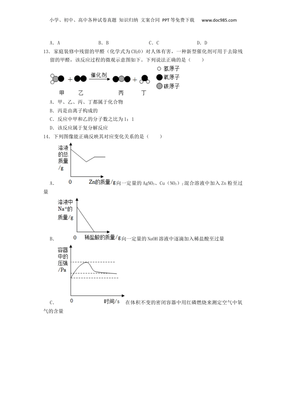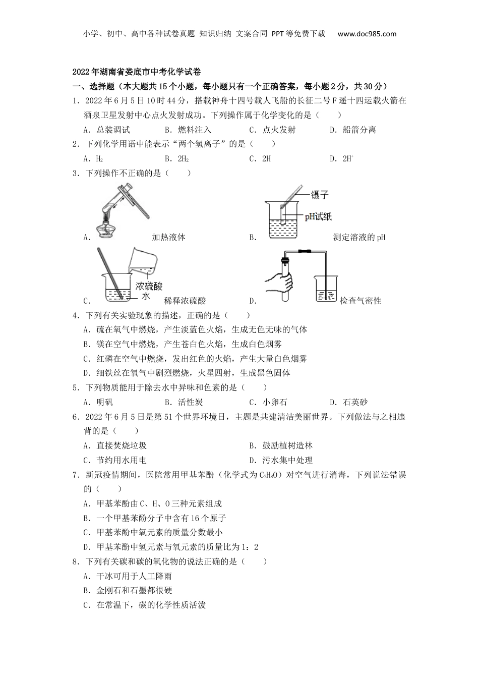 小学、初中、高中各种试卷真题知识归纳文案合同PPT等免费下载www.doc985.com2022年湖南省娄底市中考化学试卷一、选择题(本大题共15个小题,每小题只有一个正确答案,每小题2分,共30分)1.2022年6月5日10时44分,搭载神舟十四号载人飞船的长征二号F遥十四运载火箭在酒泉卫星发射中心点火发射成功。下列操作属于化学变化的是()A.总装调试B.燃料注入C.点火发射D.船箭分离2.下列化学用语中能表示“两个氢离子”的是()A.H2B.2H2C.2HD.2H+3.下列操作不正确的是()A.加热液体B.测定溶液的pHC.稀释浓硫酸D.检查气密性4.下列有关实验现象的描述,正确的是()A.硫在氧气中燃烧,产生淡蓝色火焰,生成无色无味的气体B.镁在空气中燃烧,产生苍白色火焰,生成白色烟雾C.红磷在空气中燃烧,发出红色的火焰,产生大量白色烟雾D.细铁丝在氧气中剧烈燃烧,火星四射,生成黑色固体5.下列物质能用于除去水中异味和色素的是()A.明矾B.活性炭C.小卵石D.石英砂6.2022年6月5日是第51个世界环境日,主题是共建清洁美丽世界。下列做法与之相违背的是()A.直接焚烧垃圾B.鼓励植树造林C.节约用水用电D.污水集中处理7.新冠疫情期间,医院常用甲基苯酚(化学式为C7H8O)对空气进行消毒,下列说法错误的()A.甲基苯酚由C、H、O三种元素组成B.一个甲基苯酚分子中含有16个原子C.甲基苯酚中氧元素的质量分数最小D.甲基苯酚中氢元素与氧元素的质量比为1:28.下列有关碳和碳的氧化物的说法正确的是()A.干冰可用于人工降雨B.金刚石和石墨都很硬C.在常温下,碳的化学性质活泼小学、初中、高中各种试卷真题知识归纳文案合同PPT等免费下载www.doc985.comD.CO和CO2都具有可燃性9.汽车尾气中的氮氧化合物和一氧化碳对空气会造成污染,通常采用催化净化装置将其转化成无毒物质再排放。其主要反应原理为2NO+2COX+2CO2,请推测X的化学式()A.O2B.N2C.H2OD.NO210.根据下列实验方案进行实验,能达到相应实验目的的是()编号ABCD实验方案实验目的探究影响物质溶解性的因素探究温度对分子运动速率的影响探究铁钉生锈时氧气是否参与反应探究催化剂对过氧化氢分解速率的影响A.AB.BC.CD.D11.现有Zn、Cu、Ag三种金属,每种金属限用一次,只用一种试剂就可以验证它们的金属活动性强弱,则该试剂是()A.AgNO3溶液B.CuSO4溶液C.稀H2SO4溶液D.ZnCl2溶液12.现代社会化学与生产、生活密切相关,下列描述错误的是()A.化学与健康①铁是人体必需的常量元素,人体缺铁容易造成贫血②甲醛溶液可大量用于海鲜的防腐B.化学与环保①使用一些新型的、可降解的塑料,可以减少“白色污染”②将垃圾进行分类回收再利用C.化学与材料①塑料、合成纤维、合成橡胶都属于合成材料②日常使用的金属材料,大多数属于合金D.化学与能源①太阳能、风能、地热能、潮汐能是人们正在开发和利用的新能源②人类目前所消耗的能量主要来自化石能源小学、初中、高中各种试卷真题知识归纳文案合同PPT等免费下载www.doc985.comA.AB.BC.CD.D13.家庭装修中残留的甲醛(化学式为CH2O)对人体有害,一种新型催化剂可用于去除残留的甲醛,该反应过程的微观示意图如下。下列说法正确的是()A.甲、乙、丙、丁都属于化合物B.丙是由离子构成的C.反应中甲和乙的分子数之比为1:1D.该反应属于复分解反应14.下列图像能正确反映其对应变化关系的是()A.向一定量的AgNO3、Cu(NO3)2混合溶液中加入Zn粉至过量B.向一定量的NaOH溶液中逐滴加入稀盐酸至过量C.在体积不变的密闭容器中用红磷燃烧来测定空气中氧气的含量小学、初中、高中各种试卷真题知识归纳文案合同PPT等免费下载www.doc985.comD.向等质量的水中分别加入等质量的NH4NO3固体和NaOH固体15.下列各组物质的溶液,不用其它试剂,用观察或组内物质相互混合的方法,不能将它们一一鉴别出来的是()A.CuSO4、NaOH、NaClB.Na2CO3、Ca(OH)2、HClC.FeCl3、FeSO4、NaNO3D.Ba(NO3)2、NaCl、H2SO4六、填空题(本大题共5个小题,每空2分,共40分)16.(10分)端午节到了,化学兴趣小组的同学们带上粽子、皮蛋、植物油、水果、牛奶去乡下看...
