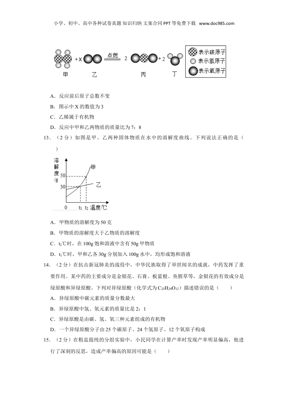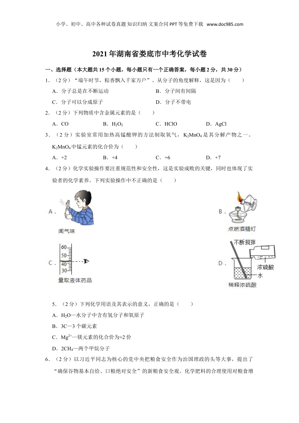小学、初中、高中各种试卷真题知识归纳文案合同PPT等免费下载www.doc985.com2021年湖南省娄底市中考化学试卷一、选择题(本大题共15个小题,每小题只有一个正确答案,每小题2分,共30分)1.(2分)“端午时节,粽香飘入千家万户”。从分子的角度解释,这是因为()A.分子总是在不断运动B.分子间有间隔C.分子可以分成原子D.分子不带电2.(2分)下列物质中含金属元素的是()A.COB.H2O2C.HClOD.AgCl3.(2分)实验室常用加热高锰酸钾的方法制取氧气,K2MnO4是其分解产物之一。K2MnO4中锰元素的化合价为()A.+2B.+4C.+6D.+74.(2分)化学实验操作要注重规范性和安全性,这是实验成败的关键,同时也体现了实验者的化学素养。下列实验操作中不正确的是()5.(2分)下列化学用语及其表示的意义,正确的是()A.H2O—水分子中含有氢分子和氧原子B.3C—3个碳元素C.Mg2+—镁元素的化合价为+2价D.2CH4—两个甲烷分子6.(2分)以习近平同志为核心的党中央把粮食安全作为治国理政的头等大事,提出了“确保谷物基本自给、口粮绝对安全”的新粮食安全观。化学肥料的合理使用对粮食增小学、初中、高中各种试卷真题知识归纳文案合同PPT等免费下载www.doc985.com产起着重要作用,下列化肥属于复合肥的是()A.KClB.NH4NO3C.KNO3D.Ca(H2PO4)27.(2分)无人机的用途越来越广泛,可以用于航拍、喷洒农药等。制无人机框架宜选用密度小、强度高、硬度较大,化学稳定性好的金属材料,下列材料中最适合做无人机框架的是()A.生铁B.黄铜C.铝合金D.纯铝8.(2分)化学让我们鉴赏了溶液的颜色美。下列物质溶于水后能得到无色溶液的是()A.CuSO4B.MgCl2C.KMnO4D.FeCl39.(2分)认真观察、准确记录和仔细分析实验现象是学习化学的重要方法。下列有关实验现象的描述不正确的是()A.红磷在空气中燃烧产生大量的白烟B.细铁丝在氧气中燃烧,火星四射,生成黑色固体C.木炭在氧气中燃烧发白光,生成能使澄清石灰水变浑浊的气体D.镁条在空气中燃烧发出耀眼的白光,生成氧化镁10.(2分)下列物质的性质与用途对应关系错误的是()A.金刚石硬度大,可制造钻头B.铜有优良的导电性,可用作电线C.稀有气体通常状况下为气态,常用作保护气D.一氧化碳气体高温时具有还原性,可用于冶炼铁等金属11.(2分)治疗胃酸(主要成分是HCl)过多,可服用含Al(OH)3的药片,制取这类药物不可以使用KOH替代Al(OH)3,最不科学的理由是()A.KOH与胃酸不反应B.KOH易溶于水C.KOH有强烈的腐蚀性D.Al(OH)3的来源更广泛12.(2分)乙烯(C2H4)是一种可燃性气体,常做水果催熟剂。乙烯完全燃烧的微观示意图如图所示,下列说法中,不正确的是()小学、初中、高中各种试卷真题知识归纳文案合同PPT等免费下载www.doc985.comA.反应前后原子总数不变B.图示中X的数值为3C.乙烯属于有机物D.反应中甲和乙两物质的质量比为7:813.(2分)如图是甲、乙两种固体物质在水中的溶解度曲线。下列说法正确的是()A.甲物质的溶解度为50克B.甲物质的溶解度大于乙物质的溶解度C.t2℃时,在100g饱和溶液中含有50g甲物质D.t1℃时,甲和乙各30g分别加入100g水中,均形成饱和溶液14.(2分)在抗击新冠肺炎的战役中,中华民族取得了举世闻名的成就,中药发挥了重要作用。某中药的主要成分是金银花、石膏、板蓝根、鱼腥草等,金银花的有效成分是绿原酸和异绿原酸。下列对异绿原酸(化学式为C25H24O12)描述错误的是()A.异绿原酸中碳元素的质量分数最大B.异绿原酸中氢、氧元素的质量比是2:1C.异绿原酸是由碳、氢、氧三种元素组成的有机物D.一个异绿原酸分子由25个碳原子、24个氢原子、12个氧原子构成15.(2分)在粗盐提纯的分组实验中,小民同学在计算产率时发现产率明显偏高,他进行了深刻的反思,造成产率偏高的原因可能是()小学、初中、高中各种试卷真题知识归纳文案合同PPT等免费下载www.doc985.comA.操作①中粗盐没有充分溶解B.操作④中有液体溅出C.操作⑤中水分没有完全蒸干D.操作⑤中没有使用玻璃棒搅拌二、填空题(本大题共5个小题,每空2分,共40分。选择填空题多选少选...