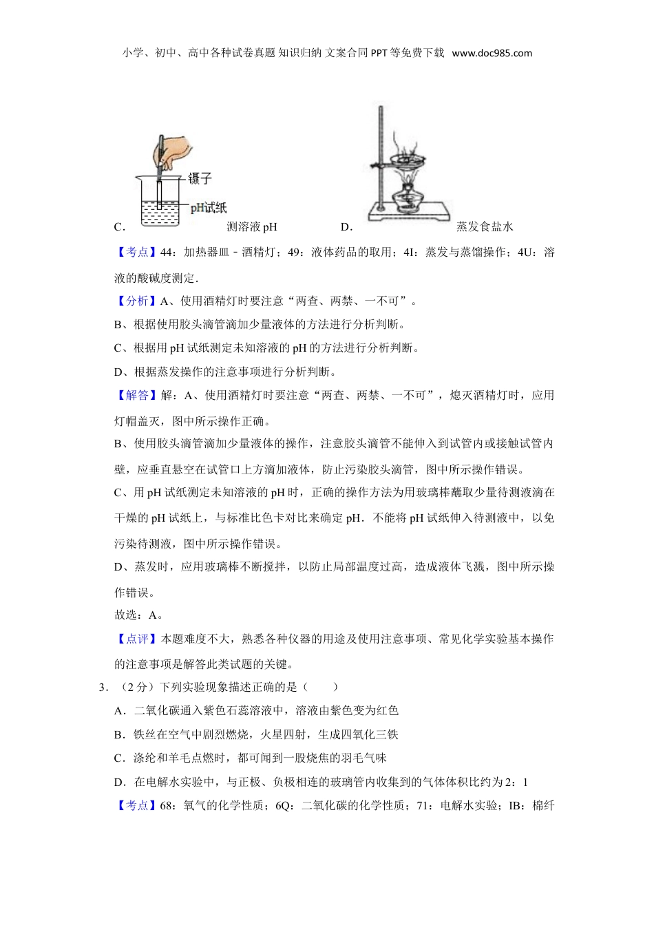 小学、初中、高中各种试卷真题知识归纳文案合同PPT等免费下载www.doc985.com2017年湖南省娄底市中考化学试卷(教师版)一、选择题1.(2分)2017年5月14日至15日在中国北京举行“一带一路”国际合作高峰论坛。古丝绸之路将我国的发明和技术传送到国外,下列古代生产工艺中主要体现物理变化的是()A.粮食酿酒B.纺纱织布C.烧制瓷器D.冶炼生铁【考点】E3:化学变化和物理变化的判别.菁优网版权所有【分析】化学变化是指有新物质生成的变化,物理变化是指没有新物质生成的变化,化学变化和物理变化的本质区别是否有新物质生成;据此分析判断。【解答】解:A、粮食酿酒过程中有新物质酒精生成,属于化学变化。B、纺纱织布过程中只是形状发生改变,没有新物质生成,属于物理变化。C、烧制瓷器过程中有新物质生成,属于化学变化。D、冶炼生铁过程中有新物质生成,属于化学变化。故选:B。【点评】本题难度不大,解答时要分析变化过程中是否有新物质生成,若没有新物质生成属于物理变化,若有新物质生成属于化学变化。2.(2分)下列实验操作正确的是()A.熄灭酒精灯B.滴加液体小学、初中、高中各种试卷真题知识归纳文案合同PPT等免费下载www.doc985.comC.测溶液pHD.蒸发食盐水【考点】44:加热器皿﹣酒精灯;49:液体药品的取用;4I:蒸发与蒸馏操作;4U:溶液的酸碱度测定.菁优网版权所有【分析】A、使用酒精灯时要注意“两查、两禁、一不可”。B、根据使用胶头滴管滴加少量液体的方法进行分析判断。C、根据用pH试纸测定未知溶液的pH的方法进行分析判断。D、根据蒸发操作的注意事项进行分析判断。【解答】解:A、使用酒精灯时要注意“两查、两禁、一不可”,熄灭酒精灯时,应用灯帽盖灭,图中所示操作正确。B、使用胶头滴管滴加少量液体的操作,注意胶头滴管不能伸入到试管内或接触试管内壁,应垂直悬空在试管口上方滴加液体,防止污染胶头滴管,图中所示操作错误。C、用pH试纸测定未知溶液的pH时,正确的操作方法为用玻璃棒蘸取少量待测液滴在干燥的pH试纸上,与标准比色卡对比来确定pH.不能将pH试纸伸入待测液中,以免污染待测液,图中所示操作错误。D、蒸发时,应用玻璃棒不断搅拌,以防止局部温度过高,造成液体飞溅,图中所示操作错误。故选:A。【点评】本题难度不大,熟悉各种仪器的用途及使用注意事项、常见化学实验基本操作的注意事项是解答此类试题的关键。3.(2分)下列实验现象描述正确的是()A.二氧化碳通入紫色石蕊溶液中,溶液由紫色变为红色B.铁丝在空气中剧烈燃烧,火星四射,生成四氧化三铁C.涤纶和羊毛点燃时,都可闻到一股烧焦的羽毛气味D.在电解水实验中,与正极、负极相连的玻璃管内收集到的气体体积比约为2:1【考点】68:氧气的化学性质;6Q:二氧化碳的化学性质;71:电解水实验;IB:棉纤小学、初中、高中各种试卷真题知识归纳文案合同PPT等免费下载www.doc985.com维、羊毛纤维和合成纤维的鉴别.菁优网版权所有【分析】A、根据二氧化碳的化学性质,进行分析判断.B、根据铁丝在空气中不能燃烧,进行分析判断.C、根据羊毛的主要成分是蛋白质,燃烧产生烧焦羽毛的气味,进行分析判断.D、根据电解水的实验现象,进行分析判断.【解答】解:A、二氧化碳通入紫色石蕊溶液中,二氧化碳与水反应生成碳酸,碳酸能使紫色石蕊溶液变红色,故选项说法正确。B、铁丝在空气中只能烧至发红,不会产生火星,故选项说法错误。C、羊毛的主要成分是蛋白质,燃烧产生烧焦羽毛的气味,涤纶燃烧产生碳酸气味,故选项说法错误。D、电解水时,可观察到:与电源正极相连的试管内产生的气体体积少,与电源负极相连的试管内的气体体积多;且两者的体积之比大约是1:2,故选项说法错误。故选:A。【点评】本题难度不大,掌握常见物质燃烧的现象、二氧化碳的化学性质、电解水的实验现象即可正确解答,在描述实验现象时,需要注意生成物的颜色、状态.4.(2分)下列关于分子和原子的说法错误的是()A.“墙内开花墙外香”说明分子是不断运动的B.“热胀冷缩”说明分子的体积随温度的变化而变化C.在化学变化中,分子可以再分,原子不可分D.在原子中,质子数一定等...