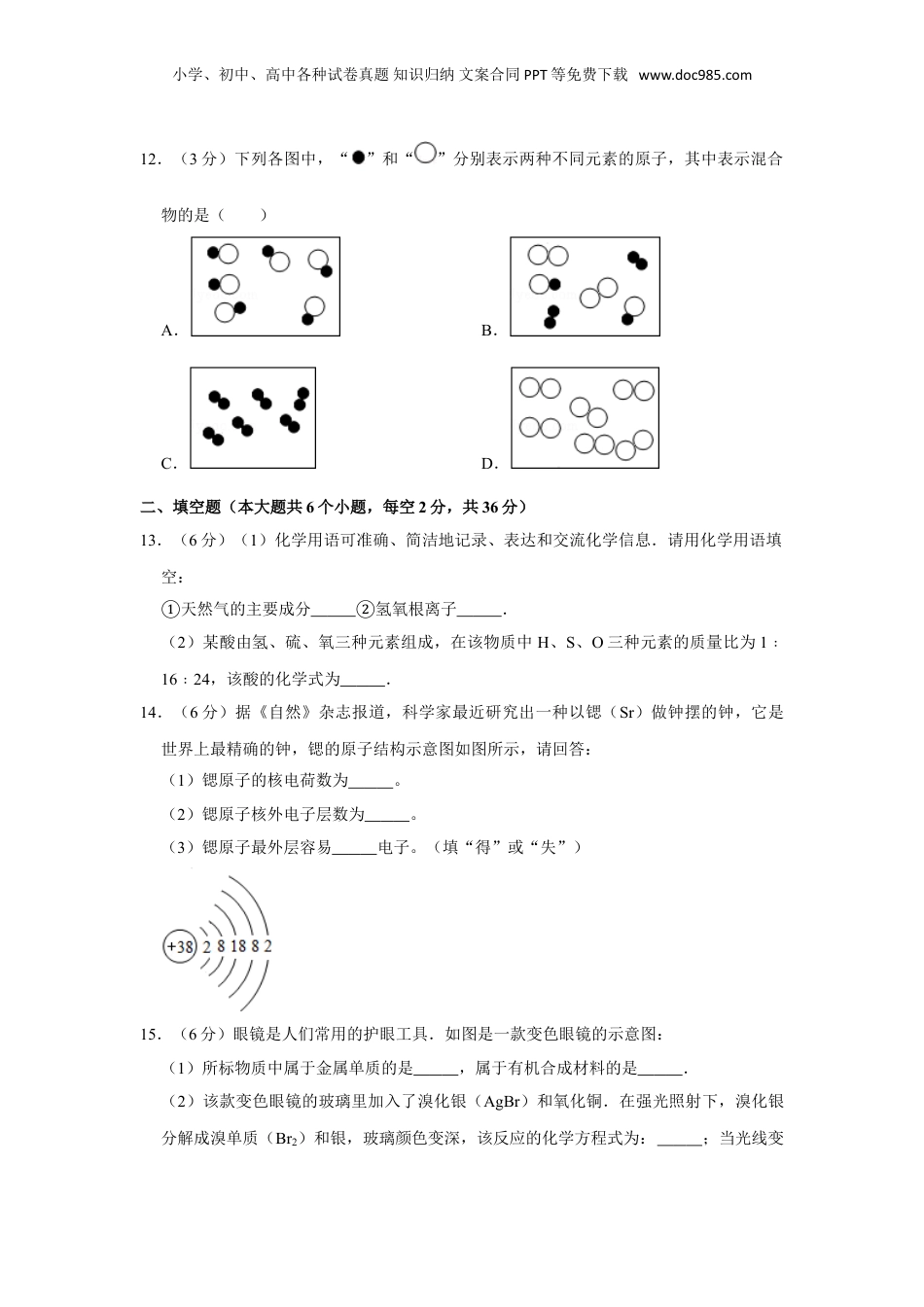 小学、初中、高中各种试卷真题知识归纳文案合同PPT等免费下载www.doc985.com2015年湖南省娄底市中考化学试卷一、选择题(本大题有12个小题,每小题只有一个正确答案,共36分)1.(3分)下列描述中表达的是物质化学性质的是()A.干冰能升华B.氧气是一种无色无味的气体C.氢氧化钠在空气中易变质D.水蒸发产生水蒸气2.(3分)下列事故的处理方法错误的是()A.炒菜时,油锅着火,立即盖上锅盖B.图书室内文字资料起火,立即用泡沫灭火器灭火C.发生一氧化碳中毒,立即转移到通风的地方救治D.如果浓硫酸沾到皮肤上,先用大量水冲洗,再涂上3%~5%的碳酸氢钠溶液3.(3分)三月中旬,湖南媒体报道,不法商贩用具有漂白防腐作用的焦亚硫酸钠(化学式为Na2S2O5)处理生姜,使生姜变得又黄又亮,从而谋取利益.过量的焦亚硫酸钠会严重危害人体健康.Na2S2O5中硫元素的化合价为()A.﹣2B.+2C.+4D.+64.(3分)2015年娄底市着力打造生态旅游区,下列做法不符合这一主题的是()A.爱护花草树木B.随意排放废水C.分类回收垃圾D.绿色低碳出行5.(3分)下列说法正确的是()A.油脂会使人发胖,故禁止食用油脂B.农药化肥能提高农作物的产量,故应大量使用农药化肥小学、初中、高中各种试卷真题知识归纳文案合同PPT等免费下载www.doc985.comC.“五月粽香飘万家”,说明分子之间有间隔D.高炉炼铁是利用一氧化碳的还原性6.(3分)现将X、Y两种金属片分别插入硫酸铜溶液中,X无明显变化,Y表面有铜析出,则X、Y、Cu三种金属的活动性由强到弱的顺序是()A.X>Y>CuB.Cu>X>YC.Y>Cu>XD.X>Cu>Y7.(3分)我市盛产金属锑。如图是锑元素在元素周期表中的部分信息,下列有关说法不正确的是()A.锑元素属于金属元素B.锑元素的相对原子质量是121.8gC.锑原子核外有51个电子D.锑元素的原子序数为518.(3分)地壳中含量最多的金属元素是()A.铝B.钙C.氧D.硅9.(3分)检验氢气纯度时,判断氢气较纯的现象是()A.听到尖锐的爆鸣声B.听到轻微的爆鸣声C.未听到声音D.试管炸裂10.(3分)下列选项中物质的名称,俗名,化学式不一致的是()A.银水银AgB.碳酸钠纯碱Na2CO3C.氧化钙生石灰CaOD.氢氧化钠苛性钠NaOH11.(3分)摘录某同学实验记录本中有关实验现象的记录,其中肯定有误的是()A.硫在氧气中燃烧,会发出明亮的蓝紫色火焰,产生有刺激性气味的气体B.细铁丝在氧气中点燃时,剧烈燃烧,火星四射,生成黑色固体C.点燃一氧化碳时,火焰呈蓝色,产物能使澄清石灰水变浑浊D.在空气中打开盛浓盐酸的试剂瓶瓶塞,有刺激性气味,产生白烟小学、初中、高中各种试卷真题知识归纳文案合同PPT等免费下载www.doc985.com12.(3分)下列各图中,“”和“”分别表示两种不同元素的原子,其中表示混合物的是()A.B.C.D.二、填空题(本大题共6个小题,每空2分,共36分)13.(6分)(1)化学用语可准确、简洁地记录、表达和交流化学信息.请用化学用语填空:①天然气的主要成分②氢氧根离子.(2)某酸由氢、硫、氧三种元素组成,在该物质中H、S、O三种元素的质量比为1﹕16﹕24,该酸的化学式为.14.(6分)据《自然》杂志报道,科学家最近研究出一种以锶(Sr)做钟摆的钟,它是世界上最精确的钟,锶的原子结构示意图如图所示,请回答:(1)锶原子的核电荷数为。(2)锶原子核外电子层数为。(3)锶原子最外层容易电子。(填“得”或“失”)15.(6分)眼镜是人们常用的护眼工具.如图是一款变色眼镜的示意图:(1)所标物质中属于金属单质的是,属于有机合成材料的是.(2)该款变色眼镜的玻璃里加入了溴化银(AgBr)和氧化铜.在强光照射下,溴化银分解成溴单质(Br2)和银,玻璃颜色变深,该反应的化学方程式为:;当光线变小学、初中、高中各种试卷真题知识归纳文案合同PPT等免费下载www.doc985.com暗时,溴和银在氧化铜作用下,重新生成溴化银,玻璃颜色变浅,氧化铜在该反应中起作用.16.(6分)甲、乙两种物质的溶解度曲线如图所示,根据图示回答下列问题:(1)甲、乙两种物质中溶解度受温度影响不大的是物质;(2)P点的意义是。(3)t2℃时,50g甲...