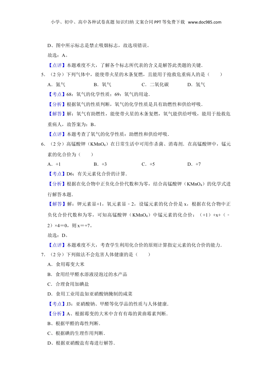 小学、初中、高中各种试卷真题知识归纳文案合同PPT等免费下载www.doc985.com2006年湖南省娄底市中考化学试卷(教师版)一、选择题(每小题只有一个正确答案,请将正确答案的序号填入相应的答题栏中.本大题共36分)1.(2分)物质的下列性质,属于化学性质的是()A.状态B.熔点C.密度D.可燃性【考点】E4:化学性质与物理性质的差别及应用.菁优网版权所有【分析】根据物理性质与化学性质的定义判断,物理性质是指不需发生化学变化就表现出来的性质,化学性质是指在化学变化中表现出来的性质.【解答】解:A、物质的状态不需要发生化学变化就表现出来,属于物理性质,所以错误。B、熔点是物质由固态变成液态时的温度,不需要发生化学变化就表现出来,属于物理性质,所以错误。C、物质的密度不需要发生化学变化就表现出来,属于物理性质,所以错误。D、可燃性必须通过燃烧这一化学变化才能表现出来,是化学性质,所以正确。故选:D。【点评】物理性质与化学性质是初中化学最基本的概念,是考查的热点之一,正确理解定义,明确二者的本质区别:是否通过化学变化表现出来,是解题的关键所在.2.(2分)我们身边的下列物质,属于纯净物的是()A.食醋B.蔗糖C.空气D.雪碧饮料【考点】A5:纯净物和混合物的判别.菁优网版权所有【分析】物质分为混合物和纯净物,混合物是由两种或两种以上的物质组成;纯净物是由一种物质组成.纯净物又分为单质和化合物.由同种元素组成的纯净物叫单质;由两种或两种以上的元素组成的纯净物叫化合物.食醋中有醋酸和水;蔗糖属于纯净物中的化合物;空气的主要成分是氮气和氧气;饮料中有碳酸和水.【解答】解:A、食醋中有醋酸和水,属于混合物,故选项错误;B、蔗糖属于纯净物中的化合物,故选项正确;C、空气的主要成分是氮气和氧气,属于混合物,故选项错误;D、饮料中有碳酸和水,属于混合物,故选项错误;故选:B。小学、初中、高中各种试卷真题知识归纳文案合同PPT等免费下载www.doc985.com【点评】本考点考查了物质的分类,属于与生活实际联系比较密切的物质.要加强记忆混合物、纯净物、单质、化合物、氧化物等基本概念,并能够区分应用.本考点的基础性比较强,主要出现在选择题和填空题中.3.(2分)根据你的生活经验,判断下列物质与水不能形成溶液的是()A.食盐B.葡萄糖C.植物油D.味精【考点】7C:溶液的概念、组成及其特点.菁优网版权所有【分析】一种或几种物质分散到另一种物质中,形成均一的、稳定的混合物叫做溶液,它的基本特征是均一性和稳定性;只有被分散的物质在水中是可溶的,二者混合后才会形成溶液.【解答】解:A、食盐易溶于水,形成均一、稳定的混合物,属于溶液;故选项错误。B、葡萄糖易溶于水,形成均一、稳定的混合物,属于溶液;故选项错误。C、植物油不溶于水,不能和水形成均一、稳定的混合物,即不能够形成溶液;故选项正确。D、味精易溶于水,形成均一、稳定的混合物,属于溶液;故选项错误。故选:C。【点评】本题难度不大,掌握溶液的本质特征、各种物质的水溶性方面的知识是解答本题的关键.4.(2分)下列标志中,属于塑料包装制品回收标志的是()A.B.C.D.【考点】HH:几种常见的与化学有关的图标.菁优网版权所有【分析】解答本题可根据图中所示标志的含义及题目的要求进行分析判断即可.【解答】解:A、图中所示标志是塑料包装制品回收标志,故选项正确。B、图中所示标志是禁止烟火标志,故选项错误。C、图中所示标志是禁止左拐弯标志,故选项错误。小学、初中、高中各种试卷真题知识归纳文案合同PPT等免费下载www.doc985.comD、图中所示标志是禁止吸烟标志,故选项错误。故选:A。【点评】本题难度不大,了解各个标志所代表的含义是解答此类题的关键.5.(2分)下列气体中,能使带火星的木条复燃,且能用于抢救危重病人的是()A.氮气B.氧气C.二氧化碳D.氢气【考点】68:氧气的化学性质;69:氧气的用途.菁优网版权所有【分析】根据氧气的性质判断,氧气的化学性质是具有助燃性和供给呼吸.【解答】解:氧气有助燃性,能使带火星的木条复燃,氧气能供给呼吸,能用于抢救危重病人...