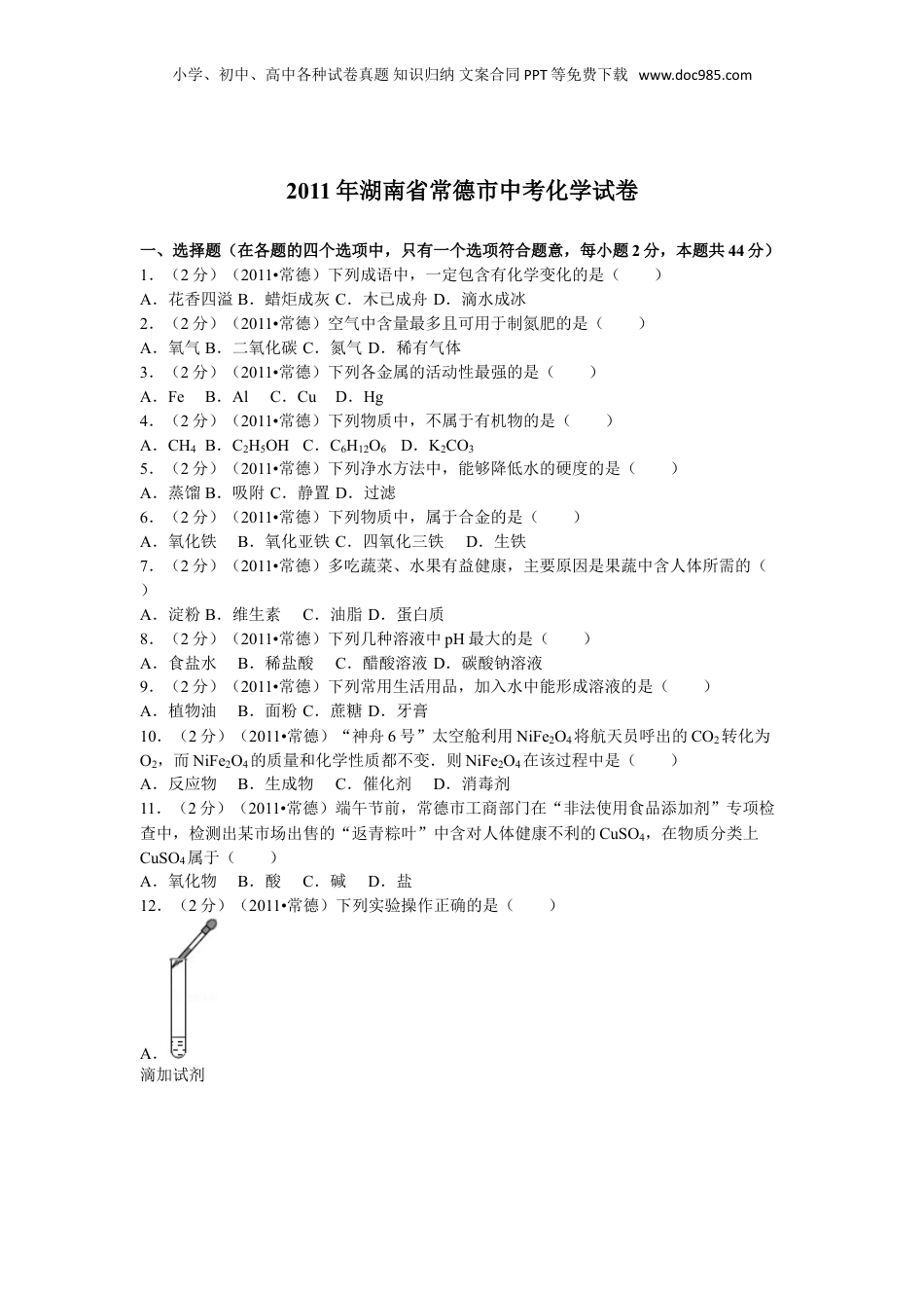 小学、初中、高中各种试卷真题知识归纳文案合同PPT等免费下载www.doc985.com2011年湖南省常德市中考化学试卷一、选择题(在各题的四个选项中,只有一个选项符合题意,每小题2分,本题共44分)1.(2分)(2011•常德)下列成语中,一定包含有化学变化的是()A.花香四溢B.蜡炬成灰C.木已成舟D.滴水成冰2.(2分)(2011•常德)空气中含量最多且可用于制氮肥的是()A.氧气B.二氧化碳C.氮气D.稀有气体3.(2分)(2011•常德)下列各金属的活动性最强的是()A.FeB.AlC.CuD.Hg4.(2分)(2011•常德)下列物质中,不属于有机物的是()A.CH4B.C2H5OHC.C6H12O6D.K2CO35.(2分)(2011•常德)下列净水方法中,能够降低水的硬度的是()A.蒸馏B.吸附C.静置D.过滤6.(2分)(2011•常德)下列物质中,属于合金的是()A.氧化铁B.氧化亚铁C.四氧化三铁D.生铁7.(2分)(2011•常德)多吃蔬菜、水果有益健康,主要原因是果蔬中含人体所需的()A.淀粉B.维生素C.油脂D.蛋白质8.(2分)(2011•常德)下列几种溶液中pH最大的是()A.食盐水B.稀盐酸C.醋酸溶液D.碳酸钠溶液9.(2分)(2011•常德)下列常用生活用品,加入水中能形成溶液的是()A.植物油B.面粉C.蔗糖D.牙膏10.(2分)(2011•常德)“神舟6号”太空舱利用NiFe2O4将航天员呼出的CO2转化为O2,而NiFe2O4的质量和化学性质都不变.则NiFe2O4在该过程中是()A.反应物B.生成物C.催化剂D.消毒剂11.(2分)(2011•常德)端午节前,常德市工商部门在“非法使用食品添加剂”专项检查中,检测出某市场出售的“返青粽叶”中含对人体健康不利的CuSO4,在物质分类上CuSO4属于()A.氧化物B.酸C.碱D.盐12.(2分)(2011•常德)下列实验操作正确的是()A.滴加试剂小学、初中、高中各种试卷真题知识归纳文案合同PPT等免费下载www.doc985.comB.读取液体体积C.加入固体药品D.稀释浓硫酸13.(2分)(2011•常德)2011年5月1日,我国将惩治“酒驾”写入刑法并正式实施,交警使用的酒精检测仪中含一种对酒精非常敏感的物质K2Cr2O7,该化合物中铬元素(Cr)的化合物为()A.+6B.+5C.+4D.+314.(2分)(2011•常德)下列反应中属于中和反应的是()A.Ca(OH)2+2HCl═CaCl2+2H2OB.Fe2O3+6HCl═2FeCl3+3H2OC.Na2CO3+2HCl═2NaCl+H2O+CO2↑D.Ca(OH)2+CO2═CaCO3↓+H2O15.(2分)(2011•常德)下列矿石(括号内为其主要成分的化学式)冶炼时产生的物质会污染空气且能形成酸雨的是()A.赤铁矿(Fe2O3)B.黄铁矿(FeS2)C.菱铁矿(FeCO3)D.磁铁矿(Fe3O4)16.(2分)(2011•常德)小明家厨房有一瓶失去标签的无色液体,妈妈说可能是白醋也可能是白酒,为了确认,小明按教材上所学的闻气味的方法去确认这瓶液体,小明的做法属于科学探究的哪个环节()A.提出问题B.制定计划C.进行实验D.得出结论17.(2分)(2011•常德)某粒子的结构示意图如右图所示,下列有关说法中不正确的是()A.该元素原子的核外共有10个电子B.该元素原子的核内质子数为13小学、初中、高中各种试卷真题知识归纳文案合同PPT等免费下载www.doc985.comC.该离子是阳离子D.该离子的最外电子层具有稳定结构18.(2分)(2011•常德)下列有关实验现象的描述正确的是()A.木炭在氧气中剧烈燃烧,产生白色火焰B.硫在空气中燃烧,产生明亮的蓝紫色火焰C.白磷在空气中燃烧,产生浓厚的白烟D.细铁丝在空气中燃烧,火星四射,放出大量的热19.(2分)新材料的发现和使用给人类带来了极大的方便,同时也带来一定的环境问题.当前,我们亟待解决的“白色污染”是指()A.冶炼厂排放的白色烟尘B.石灰窖排放的白色污染物C.人们遗弃的聚乙烯等塑料垃圾D.废弃的瓷砖等白色建筑材料20.(2分)某发电厂烟气处理的新工艺:CH4+2NO2═N2+X+2H2O,则X的化学式为()A.COB.CO2C.O2D.C21.(2分)(2011•常德)关于右图可获得的信息中,下列说法正确的是()A.甲物质的溶解度大于乙物质的溶剂度B.t2℃时甲的饱和溶液降温到t1℃时会变成不饱和溶液C.从t2℃降温到t1℃时,乙溶液比甲溶液析出的...